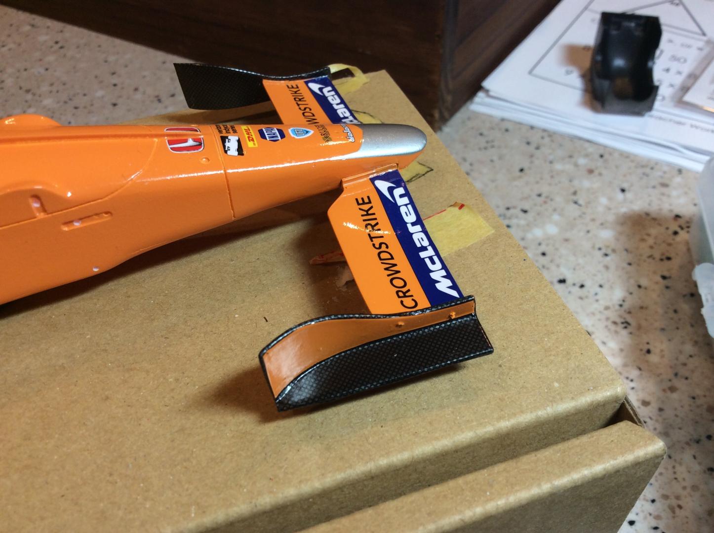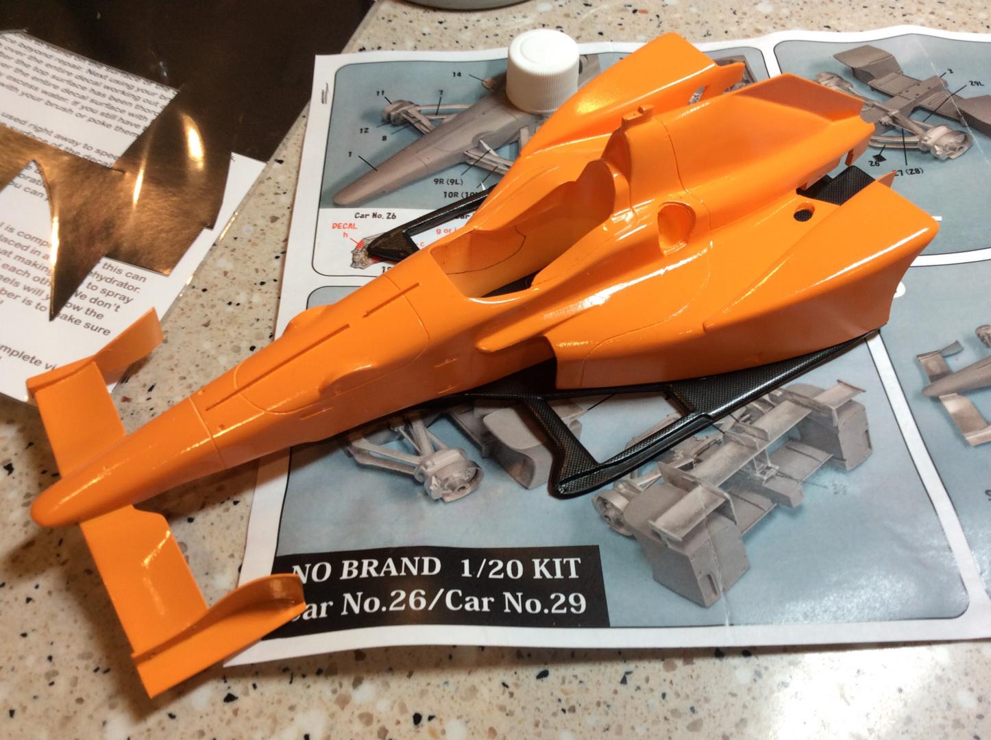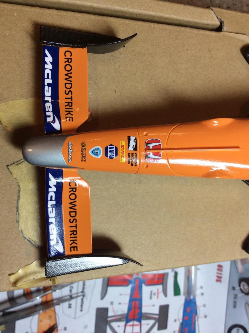 I need a break from my other two projects, as I just wanted to do a quick build to finish something for a contest. This kit is the Model Factory Hiro kit. The kit is 20th scale and has about 70 pcs. There is more decals than parts. The body has been painted with Tamiya TS-56 brilliant orange. This looks really close to the color of the real car and Indycals recommend using it. The wings and suspension are all cast metal as with the wheels. Tires are pad printed with the correct markings. The body is missing a few details and I fill that the filler door is a bit large. The carbon decals are 1/24th Scale Motorsports. I'm using 24th as I don't want the pattern too be to big looking.