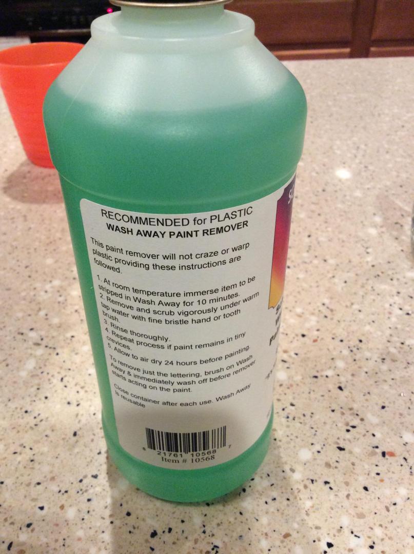 Use this stuff... It works awesome. Will not hurt the plastic if you follow the instructions. You have to soak it for 10 min , then scrub it lighty with an old toothbrush. Then wash and let dry. I wash mine with Dawn dish soap. I have used it on month old cured paint. Came right off