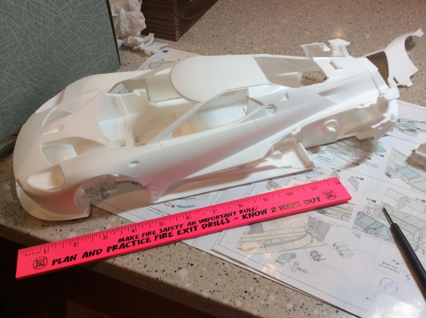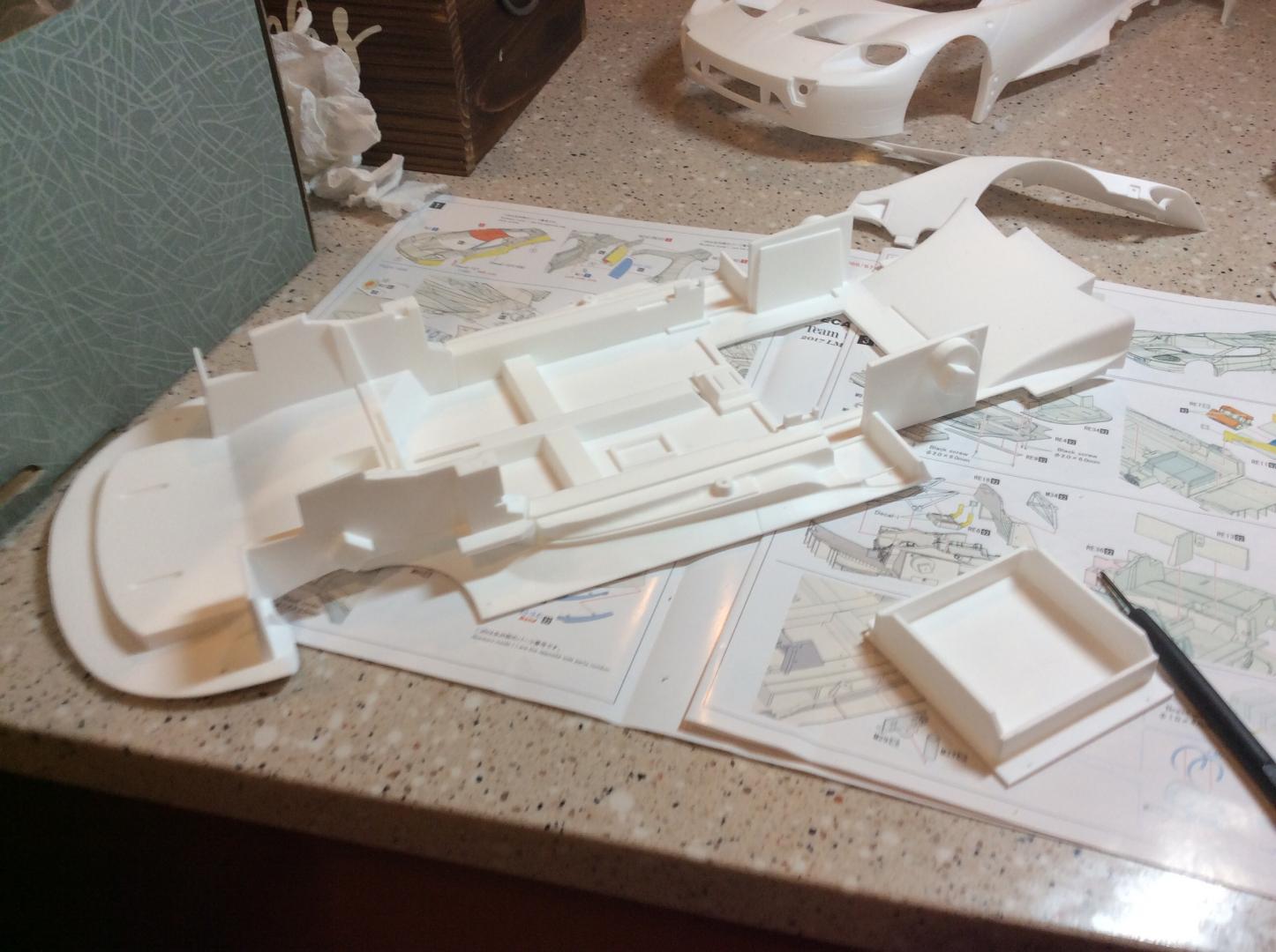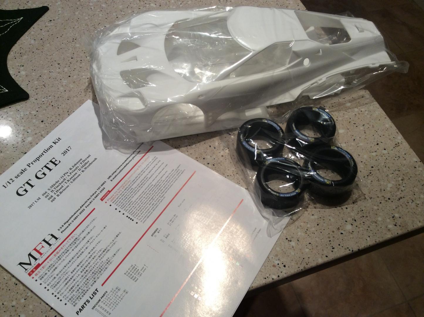 I just started working on the massive Ford GT GTE from MFH. This is my first 12th scale car that I've ever built. The kit is a curbside kit with some interior detail. My plan is too add some more detail to the interior with lines and cables. Carbon fiber from Scale Motorsports just arrived today. I'm using 20th scale carbon as the 12th looked to big in the pattern. The kit has been molded with the rear fenders off , too make painting easier. The back has just been mocked on for fit. Chassis is two parts that screw together with four small screws. Paint will be Gravity in the correct color match. The stripe line has been pre scribed too make taping a breeze