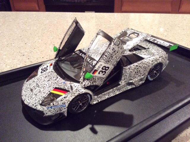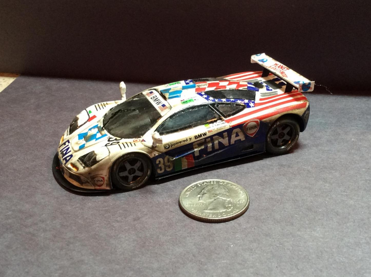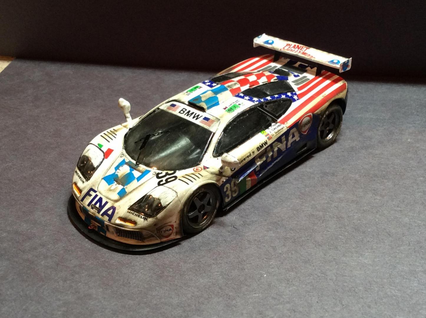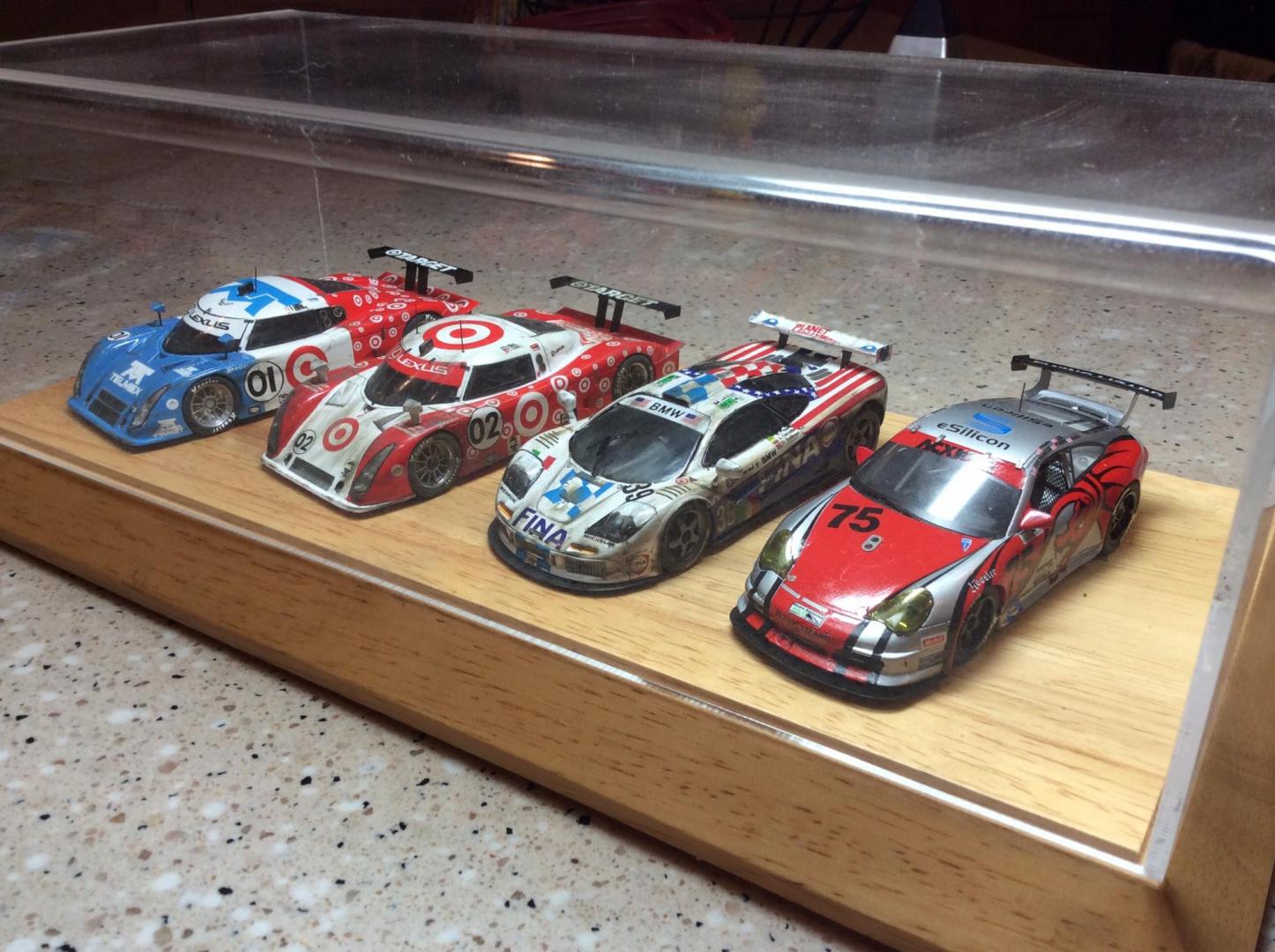 Here are a few pics of a few more of my 43rd builds. Mclaren was built post race, as I like weathered race cars. As usual the paints are Tamiya . The weathering on the Mclaren is done with the Tamiya weathering kits. The flying lizard Porsche is one of the early cars they raced. All red on the car is a decal. The stripes on the Mclaren fell apart when they hit the water and had to be pieced back together. Both kits are PMA.