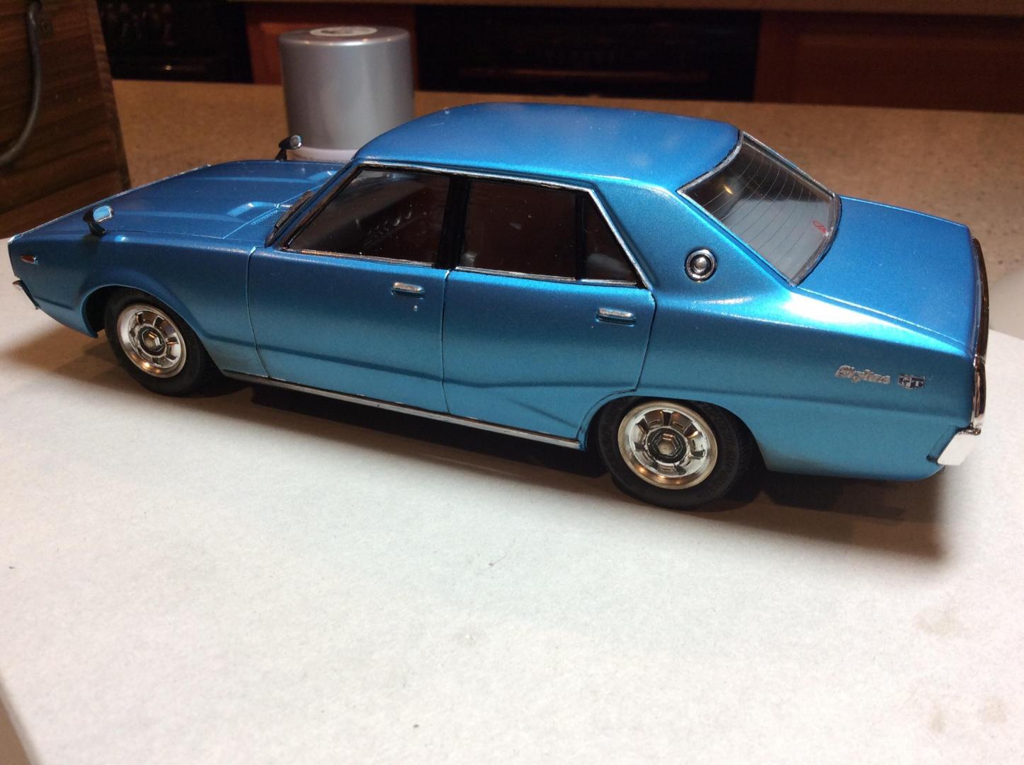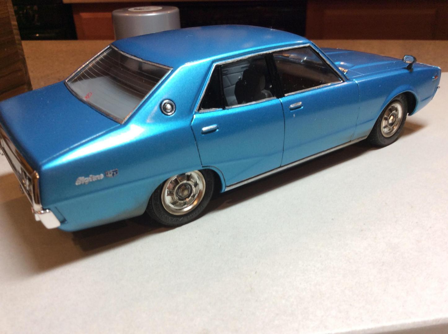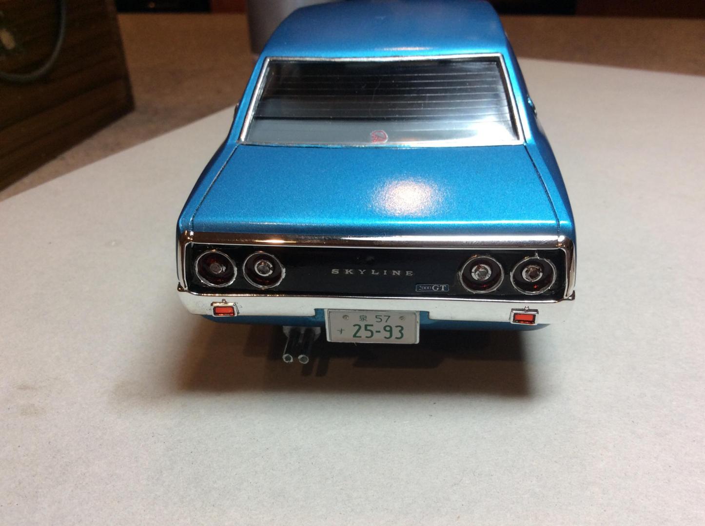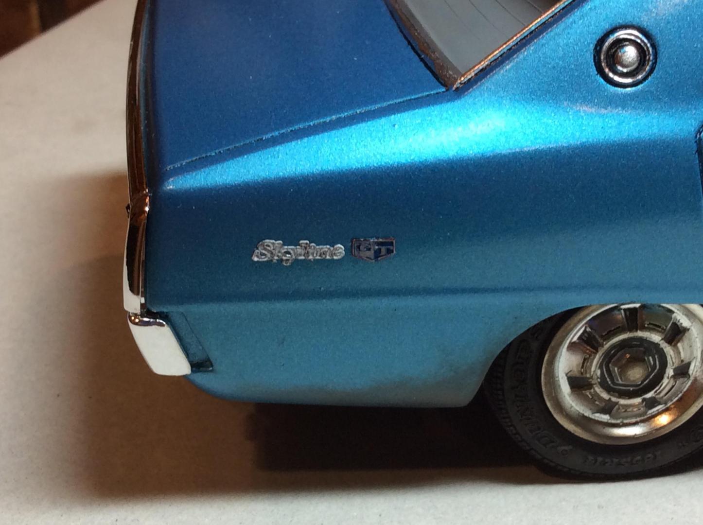 20. The kit is by Aoshima and is a simple curbside kit. The kit does come with a bunch of detail parts and photo etched logos for all the skyline emblems. A nice touch in a 25.00 kit. The kit also includes two different sets of wheels and a racing set with various interior decals. I weathered the car a bit as I wanted to try some pencils that I had bought. See on the workbench for those pictures. I weathered the wheels and the lower parts of the body and the back of the car a long the bottom. This was done by mixing rust and oil stain together and dry brushing it on. I changed the mirrors to black instead of chrome,just thought it gave it a sporty look. A nice little kit to fill a time gap in other projects. The photo etched was painted . I painted it then sanded off the high spots