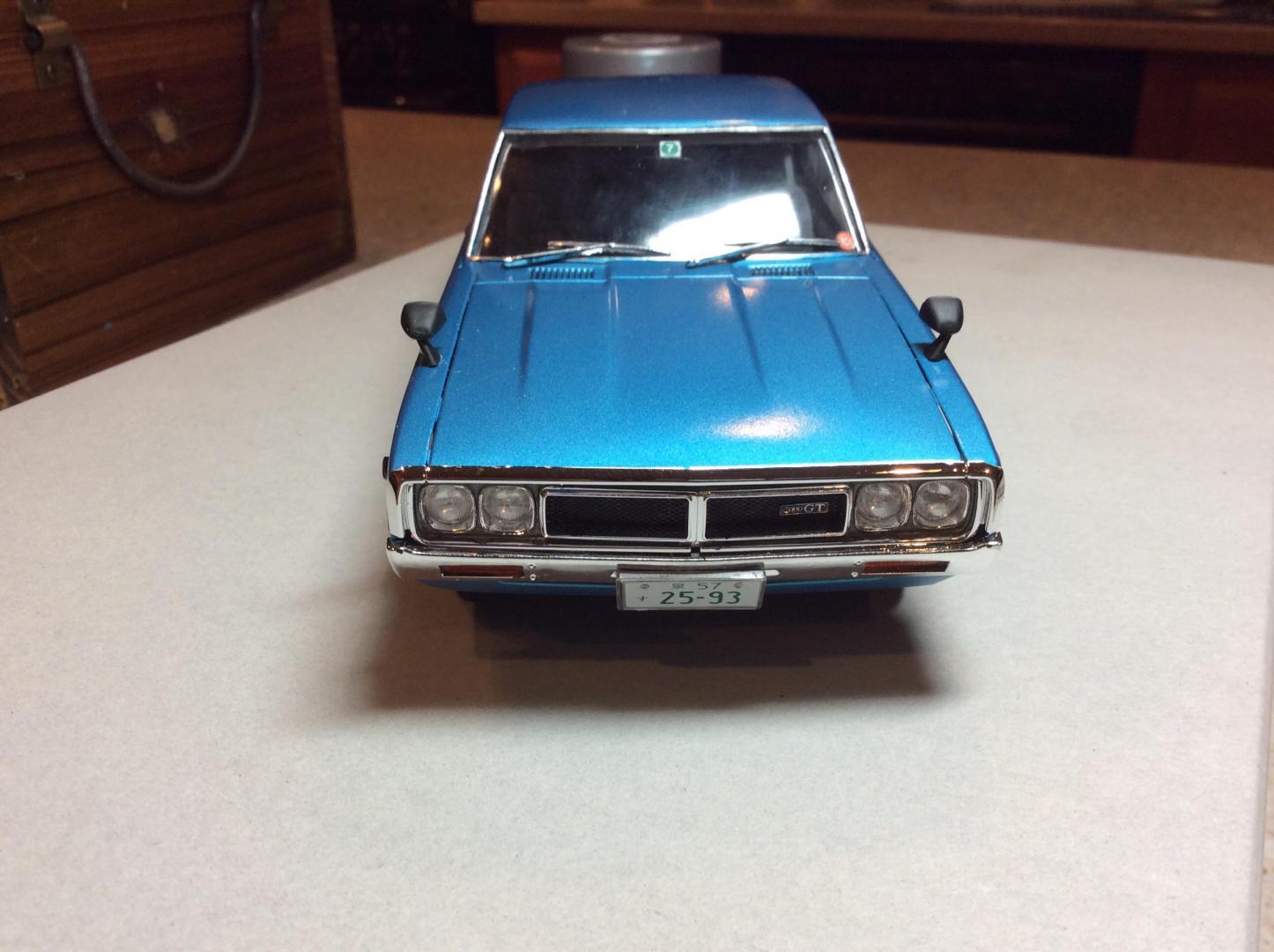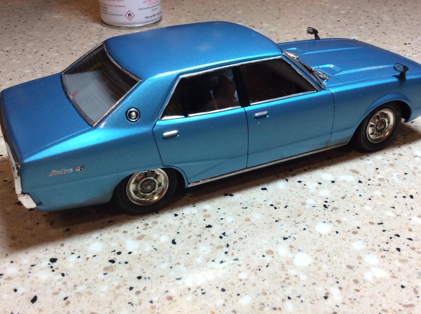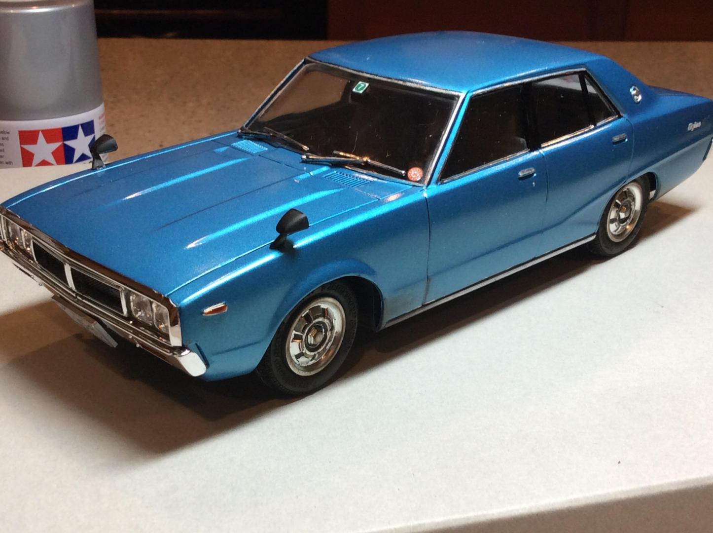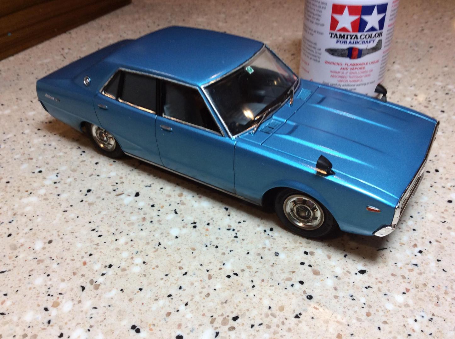 20. The kit is by Aoshima and is a simple curbside kit. The kit does come with a bunch of detail parts and photo etched logos for all the skyline emblems. A nice touch in a 25.00 kit. The kit also includes two different sets of wheels and a racing set with various interior decals. I weathered the car a bit as I wanted to try some pencils that I had bought. See on the workbench for those pictures. I weathered the wheels and the lower parts of the body and the back of the car a long the bottom. This was done by mixing rust and oil stain together and dry brushing it on. I changed the mirrors to black instead of chrome,just thought it gave it a sporty look. A nice little kit to fill a time gap in other projects. The photo etched was painted . I painted it then sanded off the high spots