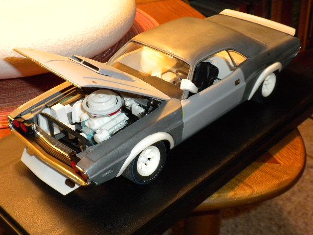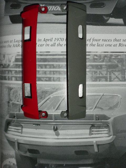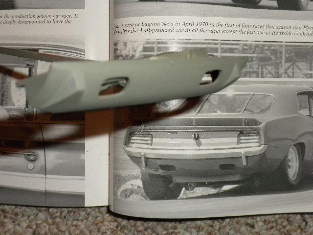 Greetings, Thanks for the kind comments and attention paid. Moving quietly along, I think I'll try to do a Bridgehampton '70 entry which seems to represent the high tide of the factory Barracuda effort during that season. Although far from a great photograph given the image split and tight binding, the specification I hope to replicate is this: ...note the attenuated front spoiler, and Swede running the 3M decaled #48 versus his own #42. Note too the lighter color of the body employed versus Swede at Laguna Seca and Lime Rock, and both remaining cars late season. At present I'm not certain I'll bother with the subtle flares discernible for close examination of this image. ...here can be seen the trimmed front spoiler with slightly enlarged brake air inlet openings. Look closely and you'll also note the hood pin lanyard stays mounted on the hood itself at about a 45 degree angle to where the pins come through the hood proper. I'll use the standard Hwy. 61 clips (which are quite nice) in combination with some light duty clear fishing line to fabricate some cables from, taking care to orient things with glue and careful positioning so they'll be as symmetrical as I might make them. The glue smear noticed on the bumper will vanish as this assembly stands to be replaced outright with a new cast item that plugs the road lamp cut outs on the base of the blade bumper and is better chromed for good measure. Yes - all this stuff takes time. ...unless greatly mistaken, for what seems the first two-thirds of the season the standard 'Cuda rear valence was employed versus the standard 'no holes' version or the same fitted to the homologation special AAR 'Cuda. The Hwy. 61 rectangularly-shaped openings seen on the Hemi 'Cuda issue valence did nothing for me, so I opted instead to cut holes and shape the same on an otherwise solid version. Small irregularities seen on the edge of the base of the valence near the attachment points of the painted valence with rectangular openings on it were further smoothed away prior to applying primer. As a short note, the photos are from Laguna Seca '70 and depict Dan Gurney making circuits during practice for the first race of the season. ...fuel tank ground out, cast resin fuel cell housing in place, revised rear valence in position. - ...and the sister Autodynamics Challenger project which will share much of the chassis work of the 'Cuda - or rather the opposite given the Challenger is in a much more advanced state! With the florescent orange individual headlamp plugs and trimmed spoiler, this model is intended to replicate the car as entered at the Mission Bell 250/Riverside contest. Thanks for skimming this post... Mike K. -