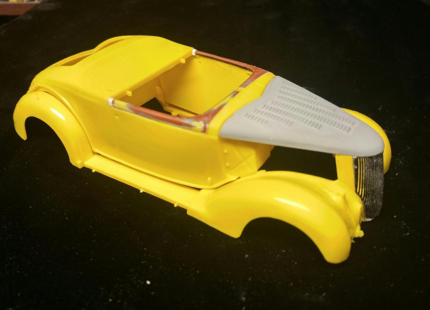 Another work in progress. A 36 roadster with all the dirty work of filling and fitting done! Jeeez, isn't it about time for a NEW 36 Ford, without the cheesy roadster / coupe deal? Revell? 1/25th please! Here it is! -