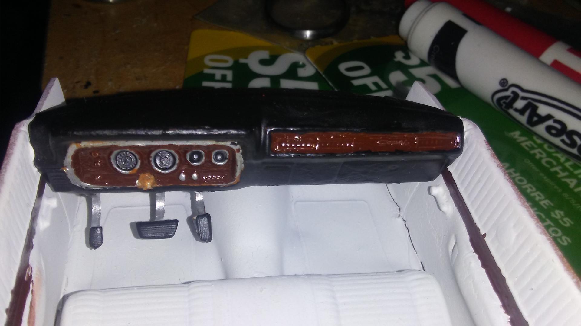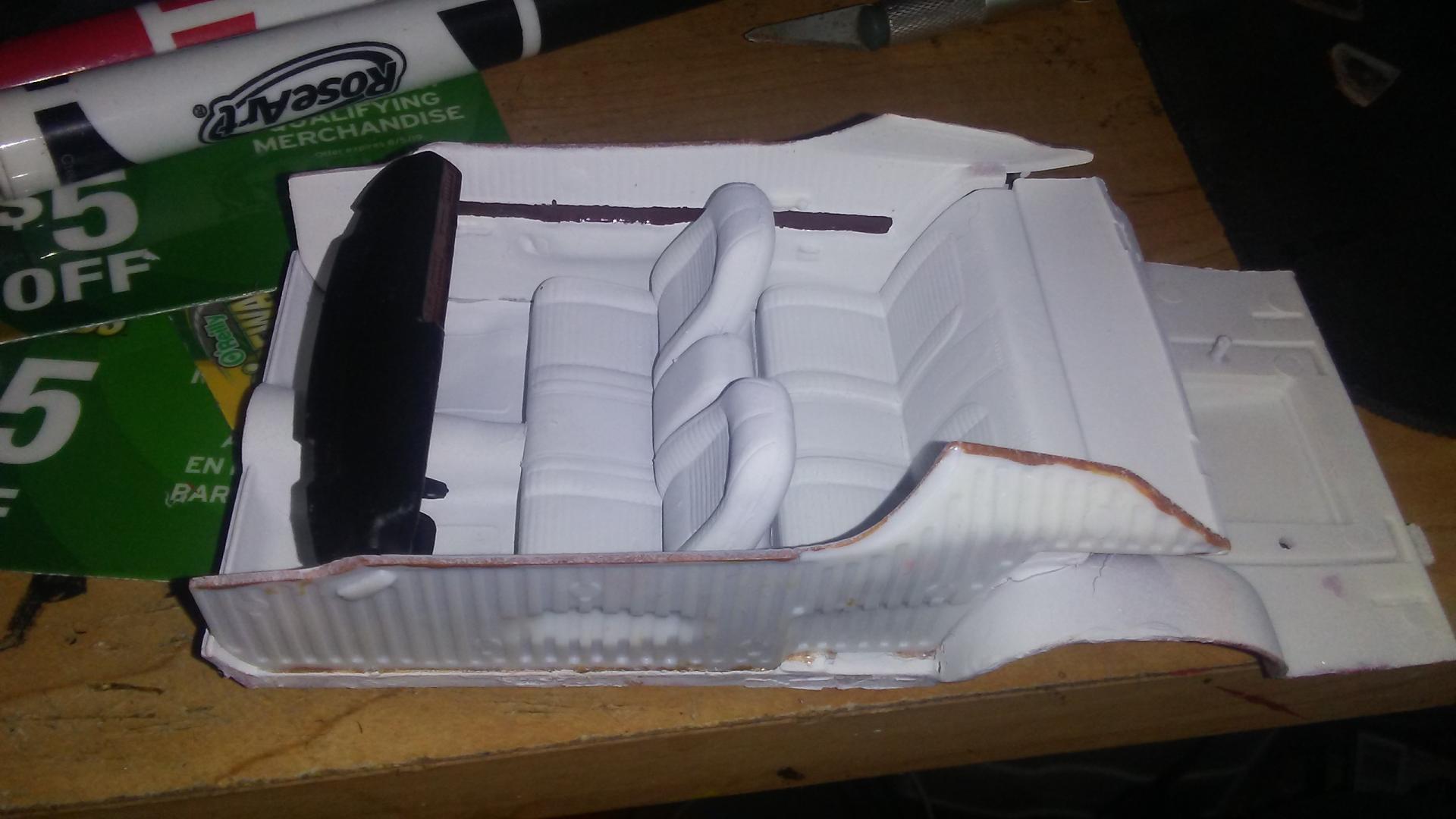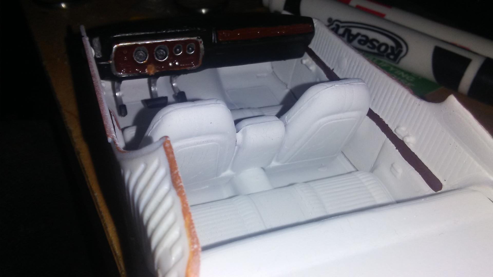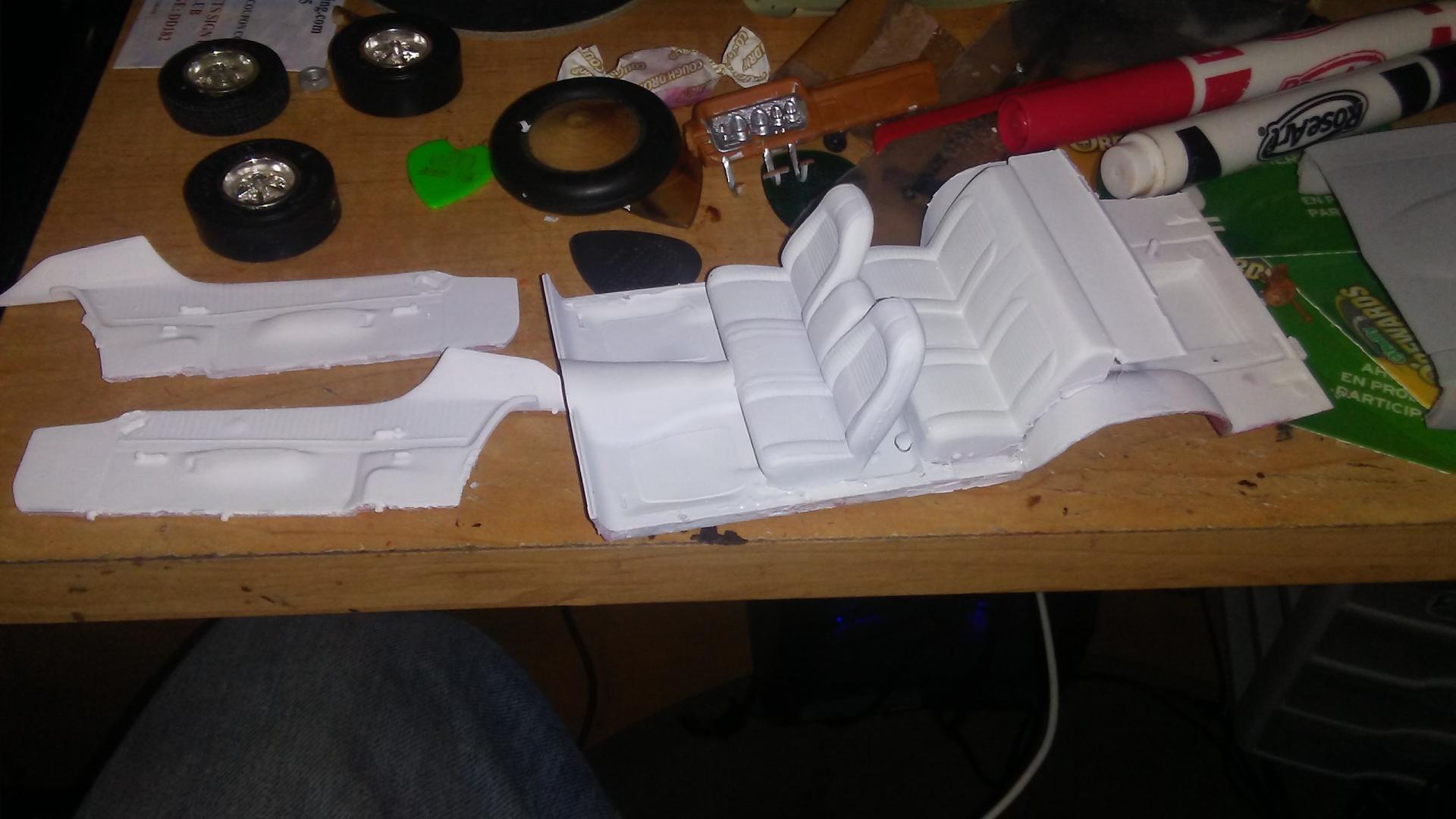 Primed the body of the car, also started changing the interior to white instead of tan. I think ill change my mind and paint the car yellow instead of copper, i like the way the R/T stripes contrast with yellow paint.