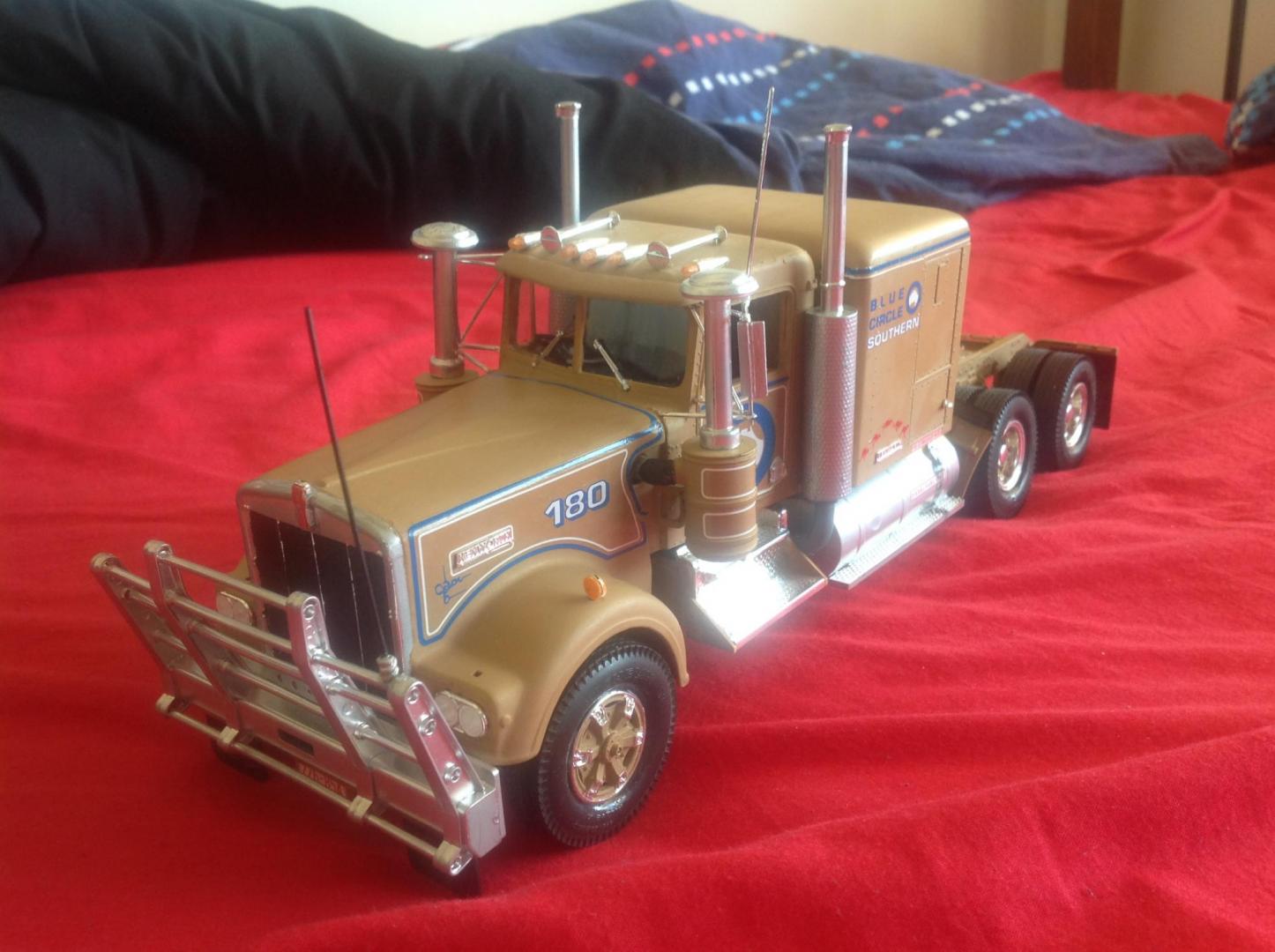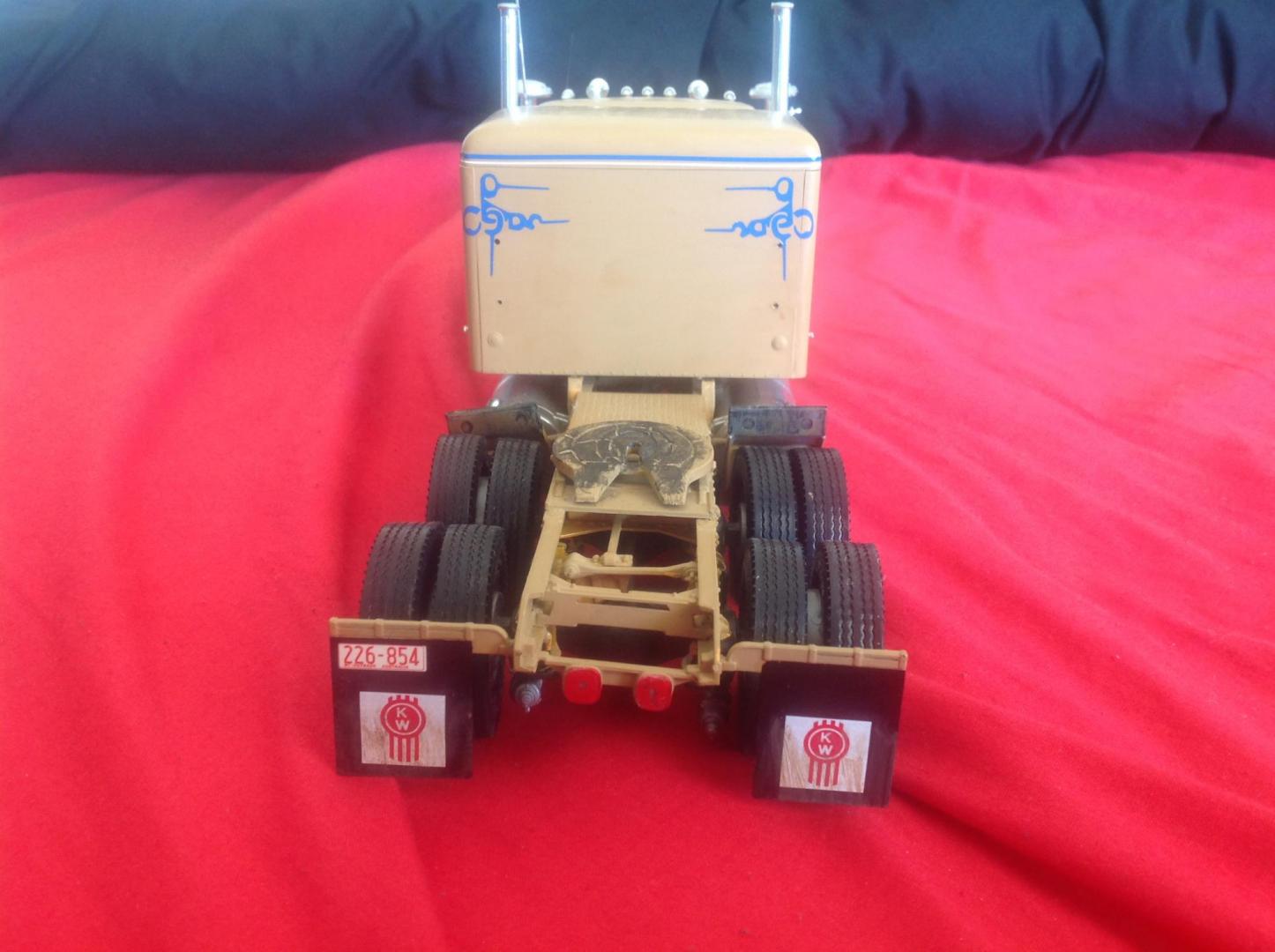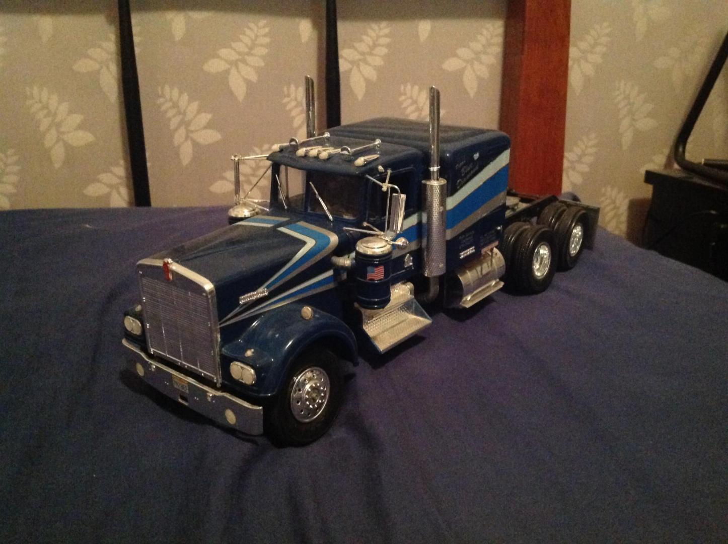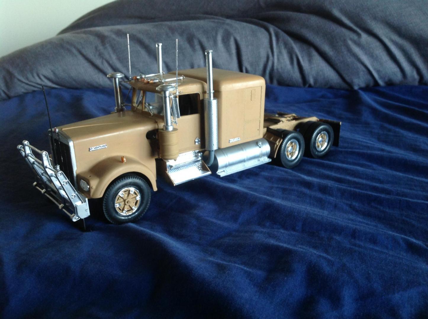 Hey guys, this is my first work of art, the W900 from revell. I thought I'd show you the truck you saw in the background of the T900 pictures. This was not "built" by me, but repaired by me after it suffered at the hands of a five year old me several years ago. I was always told not to touch, so, as all kids do, I did the opposite, and played with it until it broke. I repaired it after several months of aircraft modelling, and after dad saw my work, gave the the T900 kit to build. So, the truck has the Cat C240 under the hood, 18 speed transmission, and by the looks of things, resides in Palm Springs, California. ( is that a real place?) you can see evidence of my breakages and repairs, with a crooked mudflap and broken light and Ariel brackets, and missing fuel caps on both sides. Other things that fell off were the exhausts, the bonnet, which sadly could not be put back on its hinges, the mirrors had fallen off, but were thankfully not broken. It now enjoys watching me build my next model plane or truck from its place on its shelf. Thanks for looking guys!