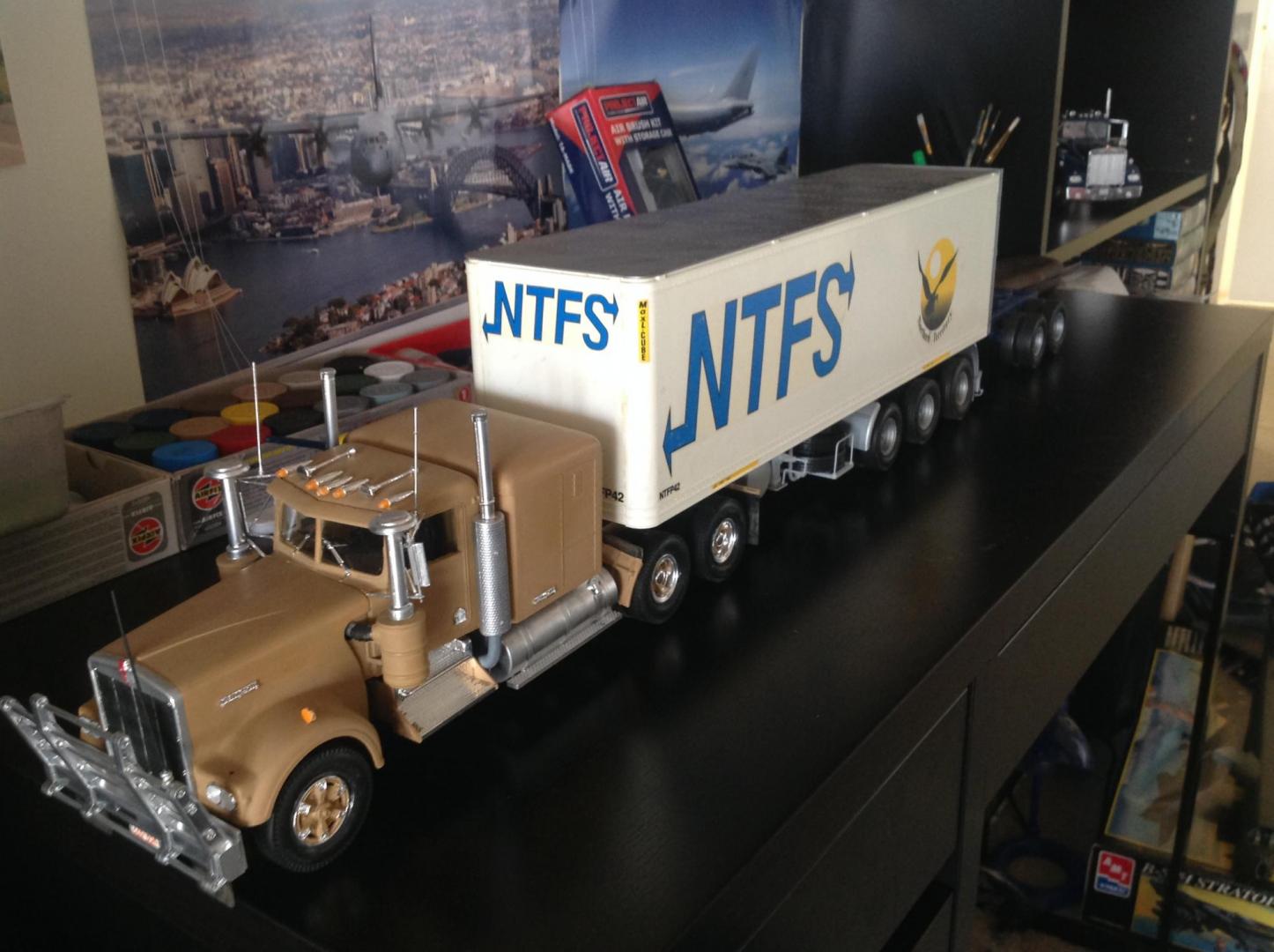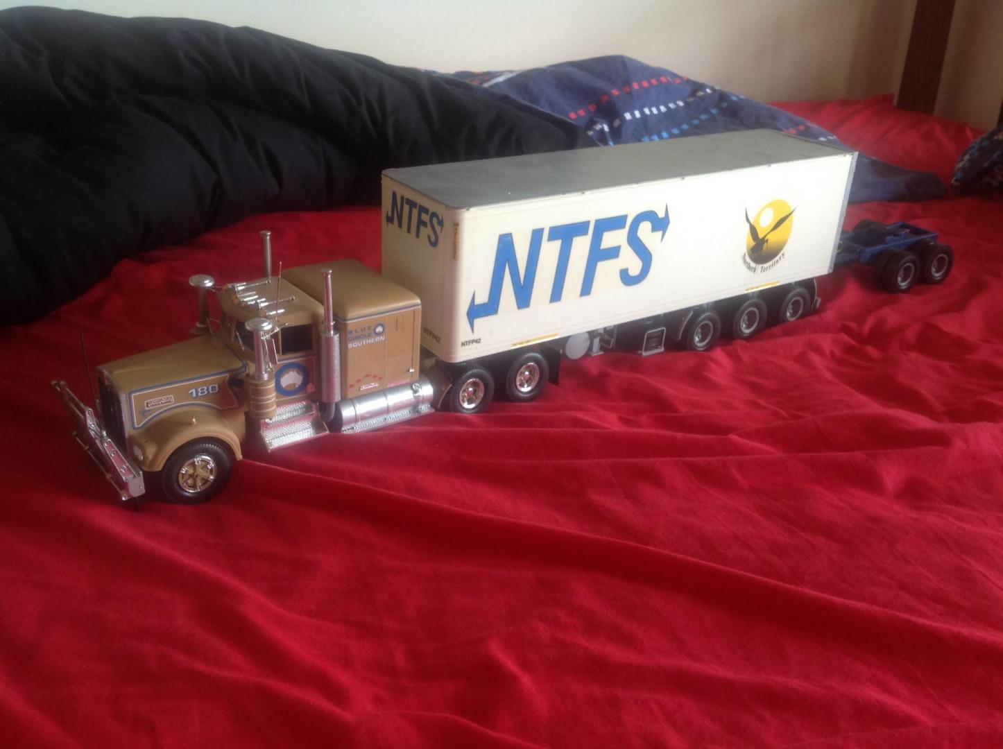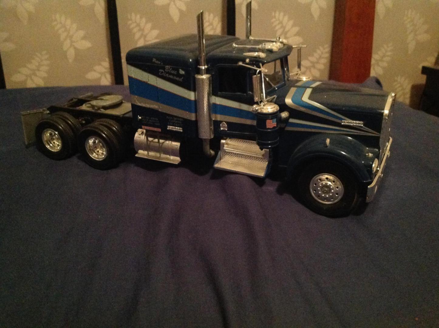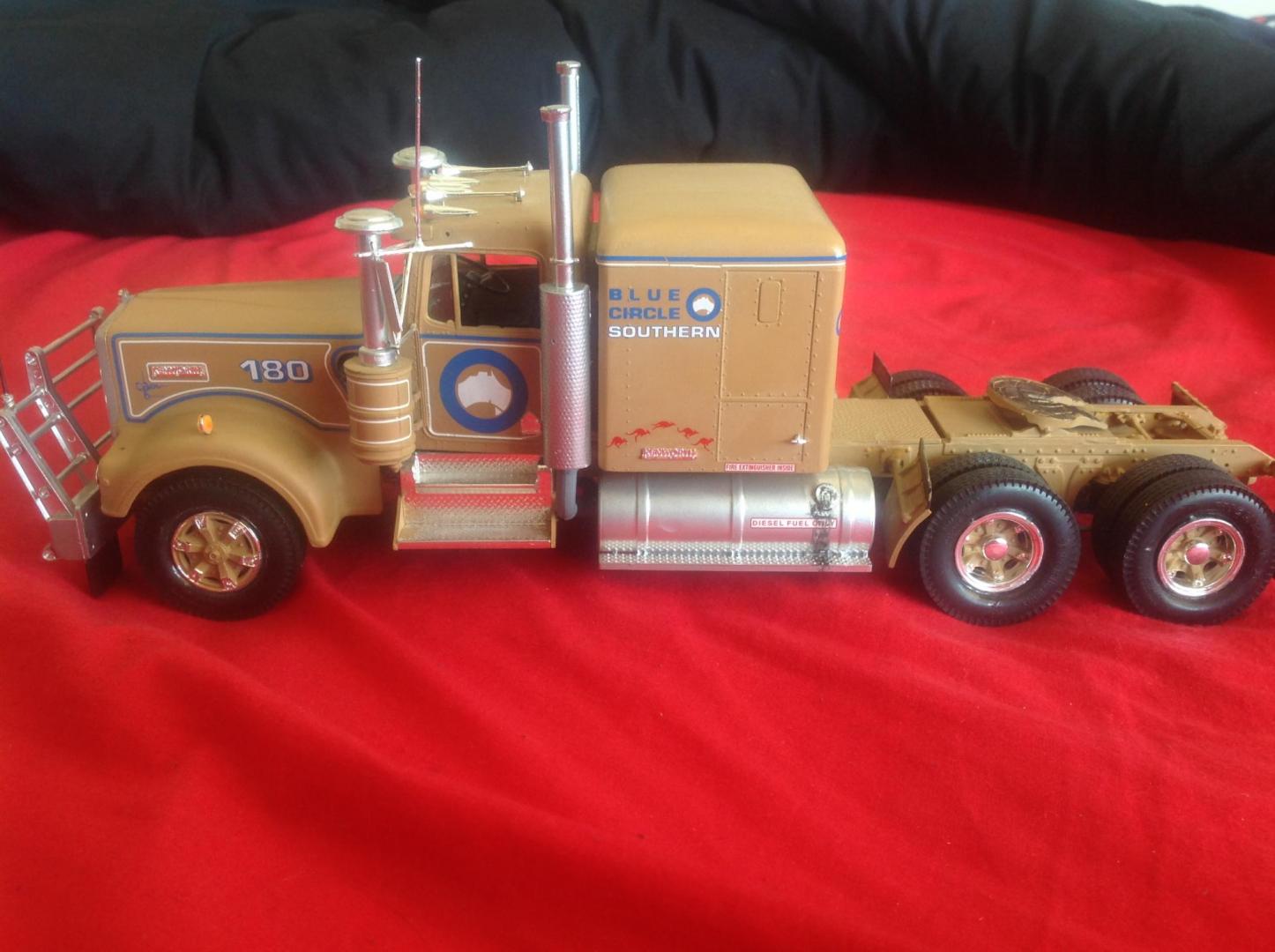 Hey guys, this is my first work of art, the W900 from revell. I thought I'd show you the truck you saw in the background of the T900 pictures. This was not "built" by me, but repaired by me after it suffered at the hands of a five year old me several years ago. I was always told not to touch, so, as all kids do, I did the opposite, and played with it until it broke. I repaired it after several months of aircraft modelling, and after dad saw my work, gave the the T900 kit to build. So, the truck has the Cat C240 under the hood, 18 speed transmission, and by the looks of things, resides in Palm Springs, California. ( is that a real place?) you can see evidence of my breakages and repairs, with a crooked mudflap and broken light and Ariel brackets, and missing fuel caps on both sides. Other things that fell off were the exhausts, the bonnet, which sadly could not be put back on its hinges, the mirrors had fallen off, but were thankfully not broken. It now enjoys watching me build my next model plane or truck from its place on its shelf. Thanks for looking guys!