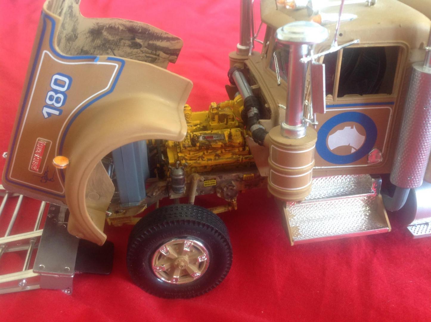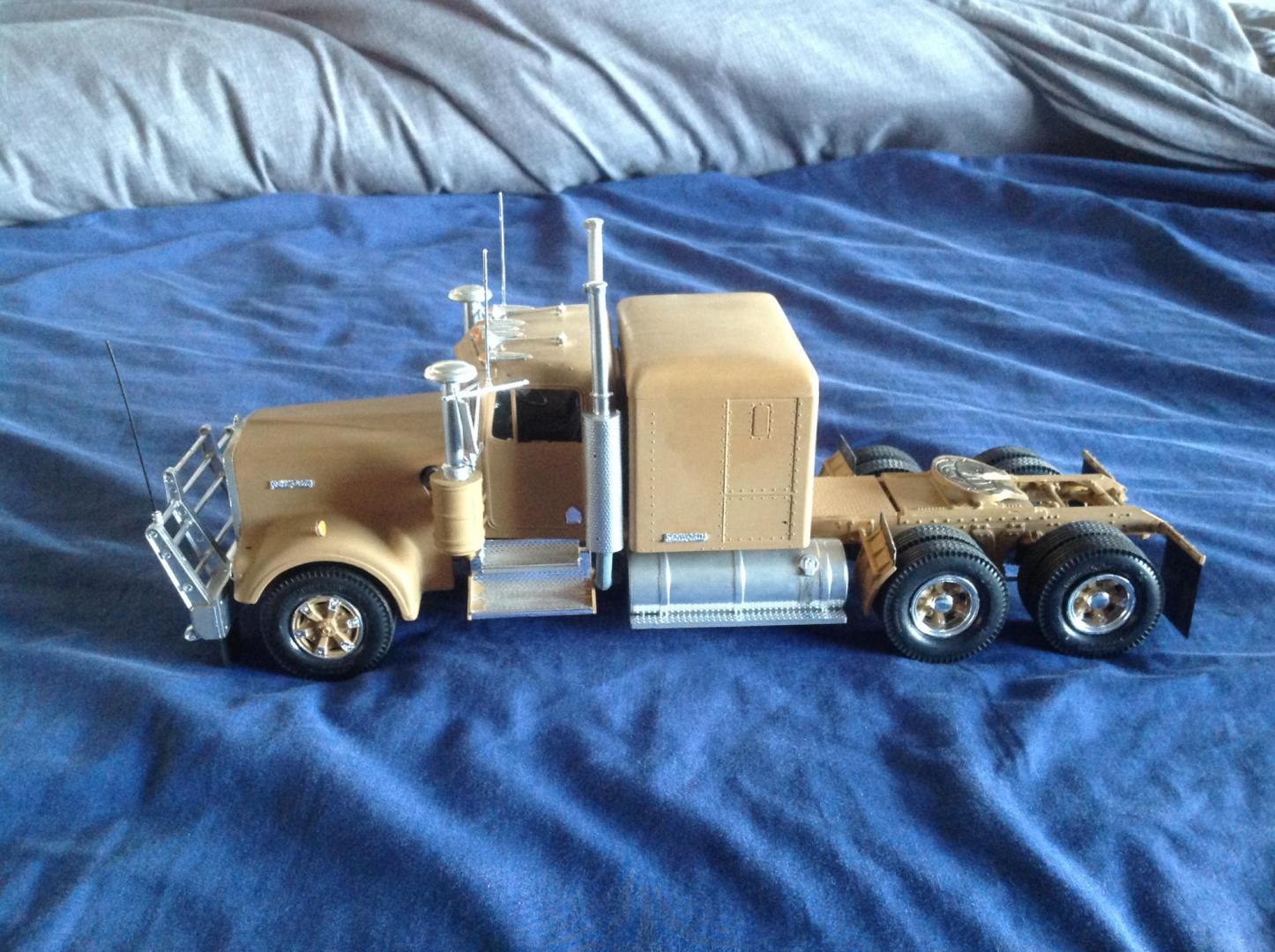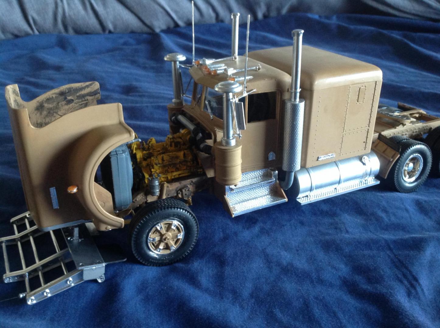 Hey guys, been looking at all the amazing rigs on here and decided to show you all my two 'babies'. The first one is Revell's Kenworth T900. The big tanks and spider rims should be the giveaway. If not them, the bull at sure is. I built this truck straight outta the box as I'm only fifteen and am not competent enough to seriously mod my trucks. I did, however, dabble in the art of scratch building, and constructed the Ariel on the bulbar. I also weathered as best I could, which you may see on the fifth wheel and mudflaps. And the oil covered Cat under the hood recently had a major oil leak, and the fan sprayed the engine in oil. It was fixed, but the engine was not cleaned. Hence the black marks all over the engine and inside the bonnet. I also don't have a decal sheet for it, so it is just the plain sand colour. Thanks for looking, and keep up the awesome work guys!