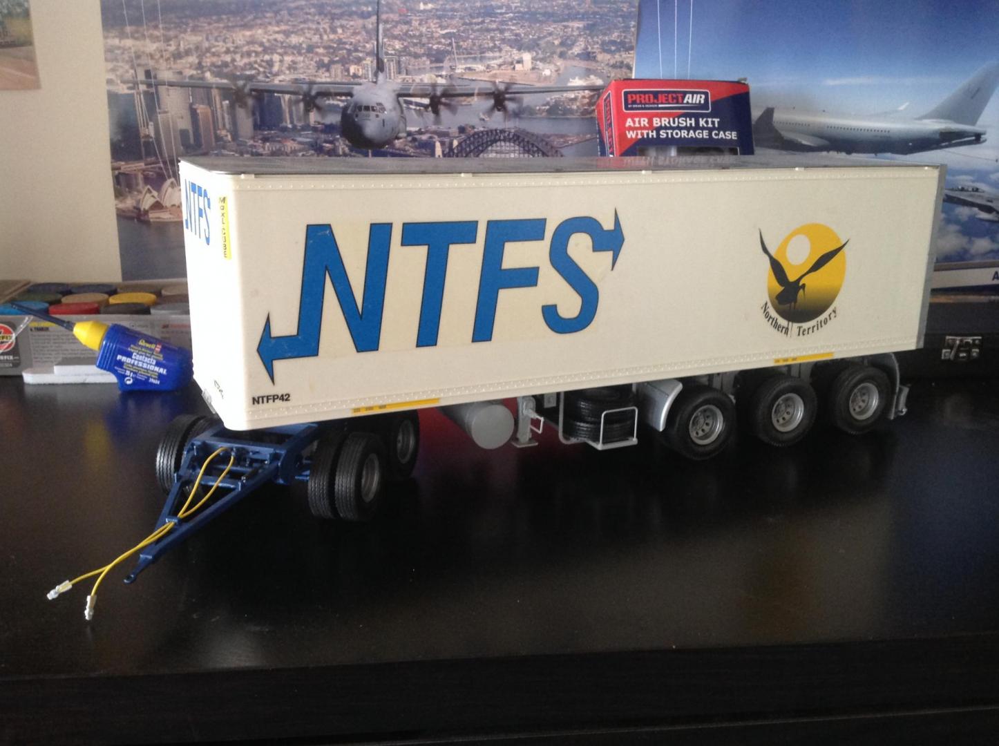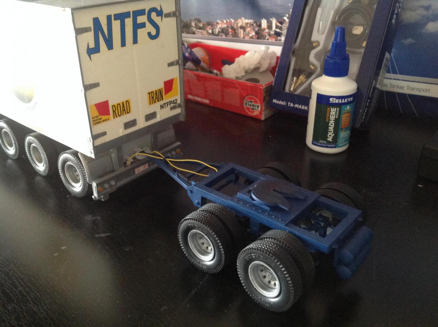 I'm not sure if trailers are allowed here, but it's "finished", and it's a model, so I guess it counts. But anyway, this is my Roadtrain trailer from revell, and yes, it may not look finished, but to me, it is. I do not have the paint available to paint the trailer, and I know the brake lights need to be done, but the dolly looks good to me, and that's the part I see the most. The legs lower, and the spares come off the trailer. This and my T900 go together well I think, and should look better together when certain items arrive. Thanks to australia post and only delivering three days a week, I do not have these items yet. Big thanks goes out to Jim B for sending me these items, and hopefully I will be able to show everyone pics of before Christmas. Don't hesitate to ask me about the trailer, or the truck. If you want me to, I can take pics of this behind my W900, but I think this combo looks best. Merry Christmas fellas, and happy truckin!