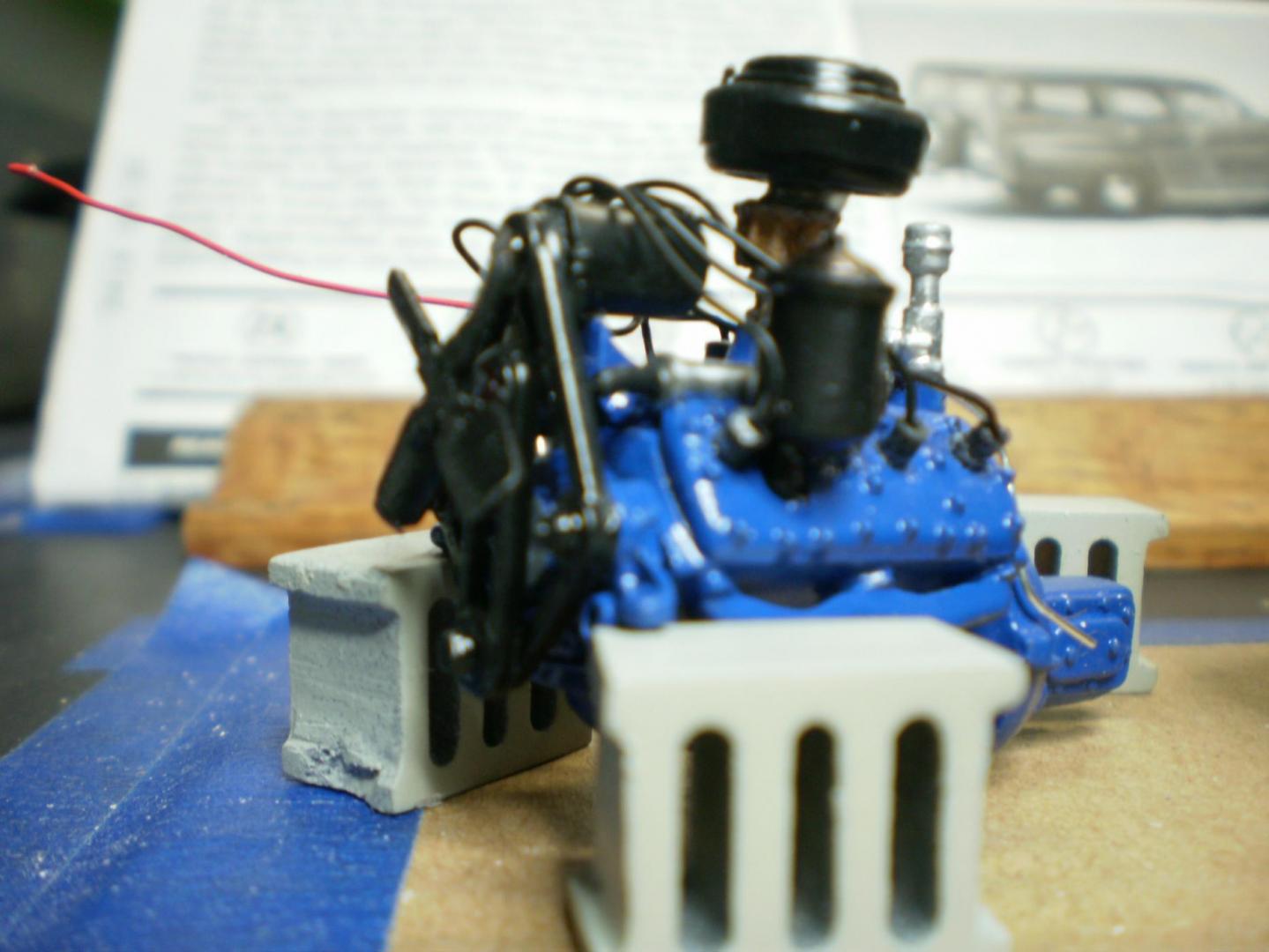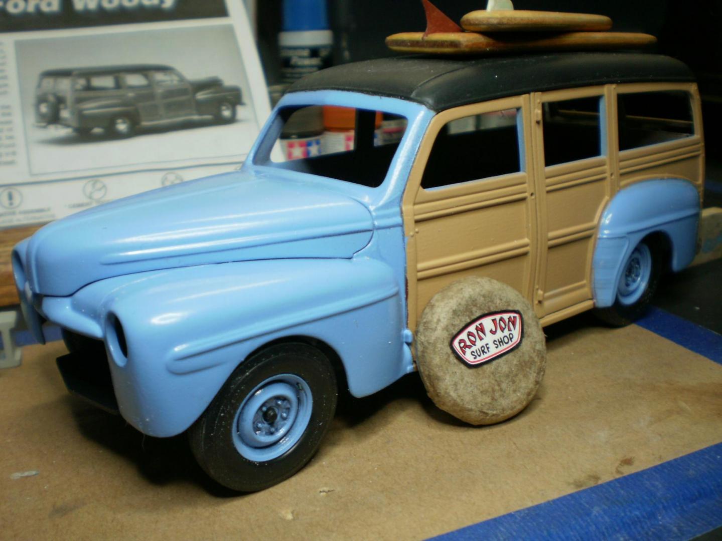 Wow ! I'm thrilled with all the responses. In no particular order, the wood on the body was sprayed the new Gloss Khaki 2X Rustoleum, the body is Spa Blue in the same format. They only made '48 woodys in two factory colors, a maroon and a dark green (I hated both). The Luann plywood is a breeze to work with, just trace it out and cut on a band saw or equivalent, then sand your way in. I then I used minwax for stain, and final topcoat was just Krylon Gloss clear. I'll probably add some retro brand names to the boards. I love the fact that they are real wood, just seems to lend credibilty to the build. I did knock the Gloss Khaki down with dullcote btw, but it's a lovely color either way. It's one of those colors you get in your aresenal and wonder how you lived with out it. I started with Revell/Mongram kit #85-2540, it has a press date of 1998. It's a terrific kit despite the age, and has a multitude of little things that aren't apparent on the box. It has a ton of decals for the engine, gauges, and surf themes, right down to the 1948 Hawaii license plate you see. I made the spare tire cover out of a glue soaked paper towel, and I cut the Ron Jon sticker off the backing of an actual Ron Jon bumper sticker. I deleted both the front and rear bumpers of this build. Just looked a lot cleaner and more modern this way. I also knocked the parking lights off that were below the headlights and deleted the chrome hood ornament for the same reason. In response to member buidnething above, I also have the '41 Woody kit that was just re-released. I totally agree with you about the wheels in that kit, and I don't like the funky intake set up they have on that flat head V8. Added to the fact that the '41 just ins't a good looking Ford, I'l probably saw the front clip off and swap in a '40 nose and go back to a more standard carb set up, and maybe some spun air cleaners from my friend Ron Parks, who coincidentally gave me the distributor I used on this build. Again, thanks for all the accolodes. It means the most when it comes from fellow modelers, they truly know the time and effort a build like this takes. -