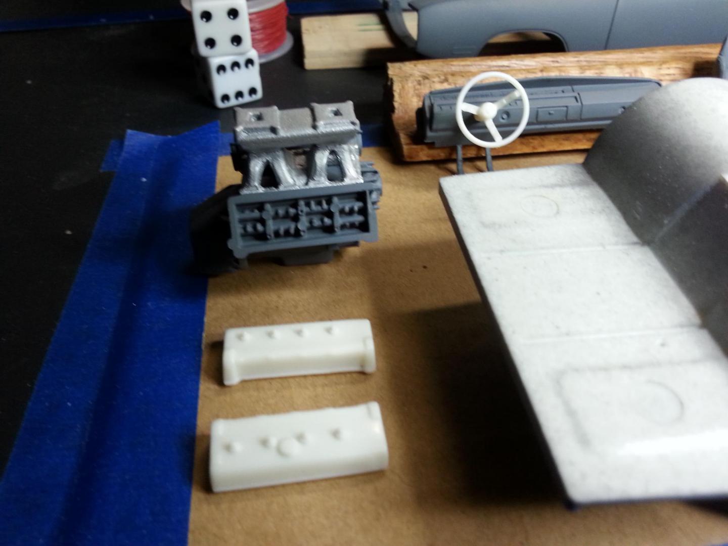Just got this build up on rubber. If you haven't purchased this kit you owe it to yourself to give it a whirl. I'm crazy about the huge rear rubber, which is Mickey Thompson logo with very good tread detail. I'm commited to this stance, which may require some surgery on the firewall and/or inner fenders. Just peeking around the corner is the Hemi mill with the kit tunnel ram, but after a ton of surgery on the manifold. The kit supplied part is molded solid between the legs, and looks dreadful. I took my time with a pin vise and micro drills to open it up, and it made a world of difference. I've decided to go ahead with the sexy DOHC heads and dual drive pulleys that are supplied in this kit. I can't imagine a better spot for it than in a retro-mod pro street car. I've built a lot of stock block and head Hemi mills, so I'm looking forward to building a DOHC motor. Plus, since that motor never actually made it into 1:1 production, I can paint and detail it to my liking without running afoul of the purists. I'm going with Plum Crazy (maybe not totally correct, but's it s pro-street, not a strictly stock build) and the white "C" stripe for the body. The kit Recaro seats will have the center panel done in Plum Crazy with black fabric around the outside. This Dirty Donny kit comes with a ton of extra parts; the aforementioned DOHC parts, a dual cross ram manifold, a heavily detailed single 4 bbl manifold, some super sweet cast iron Hemi manifolds, a stock rear end and springs, and a chrome Dana diff cover. And I'm sure there's more, that's just what I've discovered so far. A real bonanza for the parts bin to say the least! The rims look immensely better after having the too-brite chrome knocked down with Dull Cote. They'll get valve stems yet, and a detail wash, but so far so good. Stay tuned, I'll post more pics after the body is in color and the motor is detailed out. As always, I appreciate any comments pro and con.