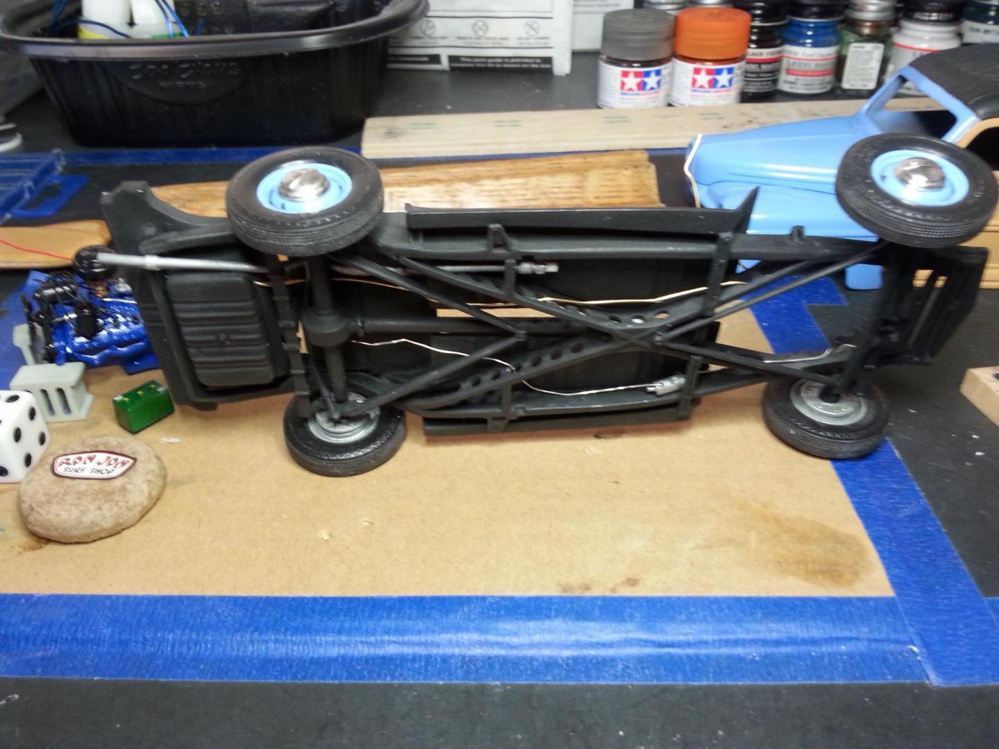 On the bench today is my Revell '48 Woody model. The first thing I did after reviewing the photos on the box of the 1:1 car and their built model was to commit to lowering this Retro beach wagon substantially. So the frame and springs were built as a unit while a good deal of surgery was being performed. By sinking the cross-members into the floor pan and shortening leaf spring heights I think I got where I needed to be. The result is a much more modern ride height. I'm aiming for a "new look but with vintage drivetrain", posibly the thing a Surf Shop might own. Also the front bumper mount was eliminated along with the signal lights under the headlights. All in all a much cleaner look. The rear hatch was opened by judicious use of a scratch awl. Brake lines and fuel lines were run under around and thru the famous Swiss cheese frame holes these Fords had. Makes detailing the undercarriage a lot of fun. The flathead V8 got a Parts by Parks distributor and coil, and a throttle rod and fuel line for good measure. Steelie wheels complete the look, the've got valve stems added but will also receive some tire weights before this one goes on the shelf. I rushed the black paint onto the top over still moist primer, and blew the mess dry with a hair dryer. It's my personal technique for causing distress on tops and upholstery, and it worked like a champ here too. There's a fine line that results in just enough cracking and patina, try it some time with a scrap body. Anyhow stay tuned, I'm going to get the windshield foiled and that flattie mounted up in coming days.