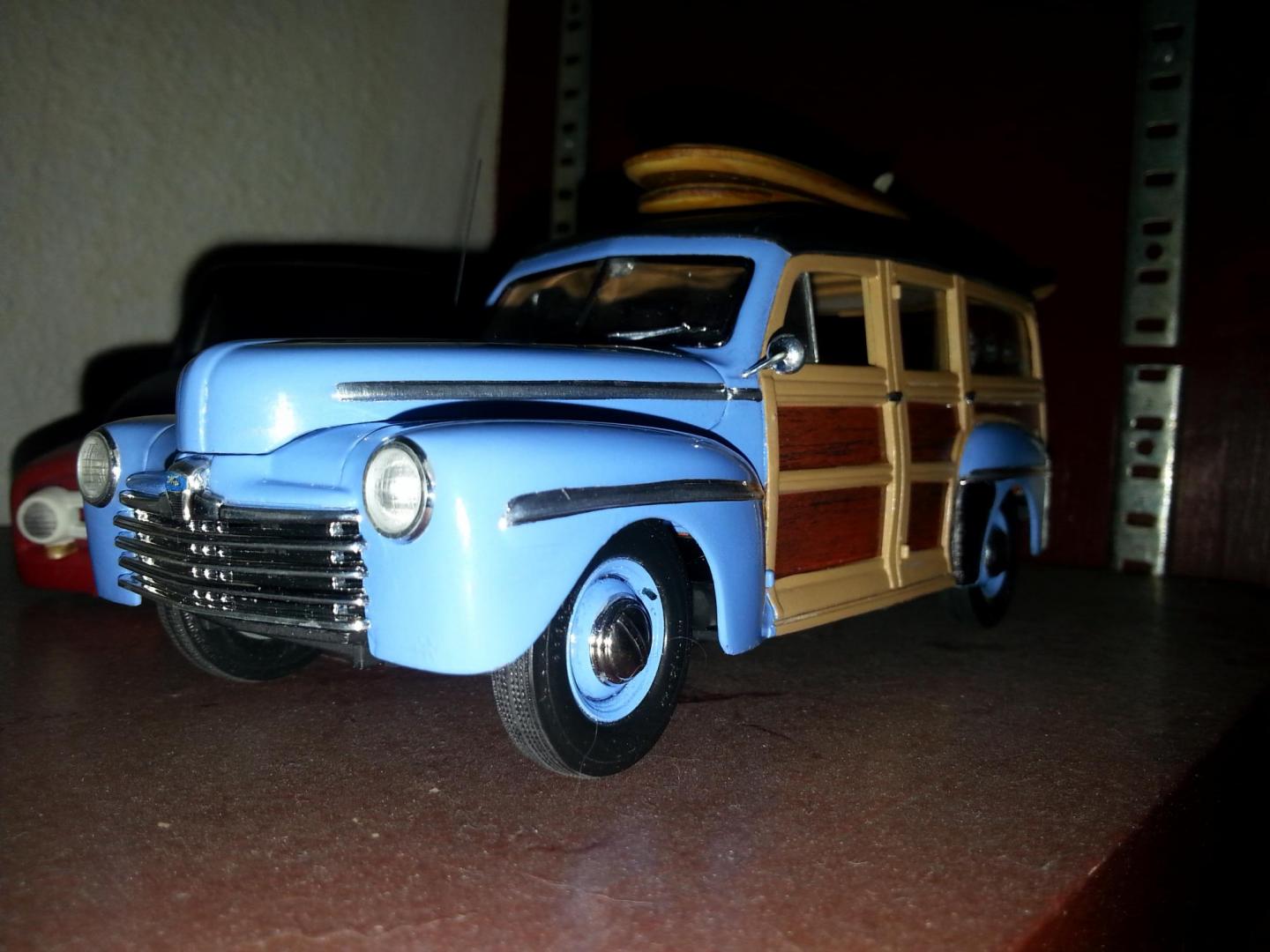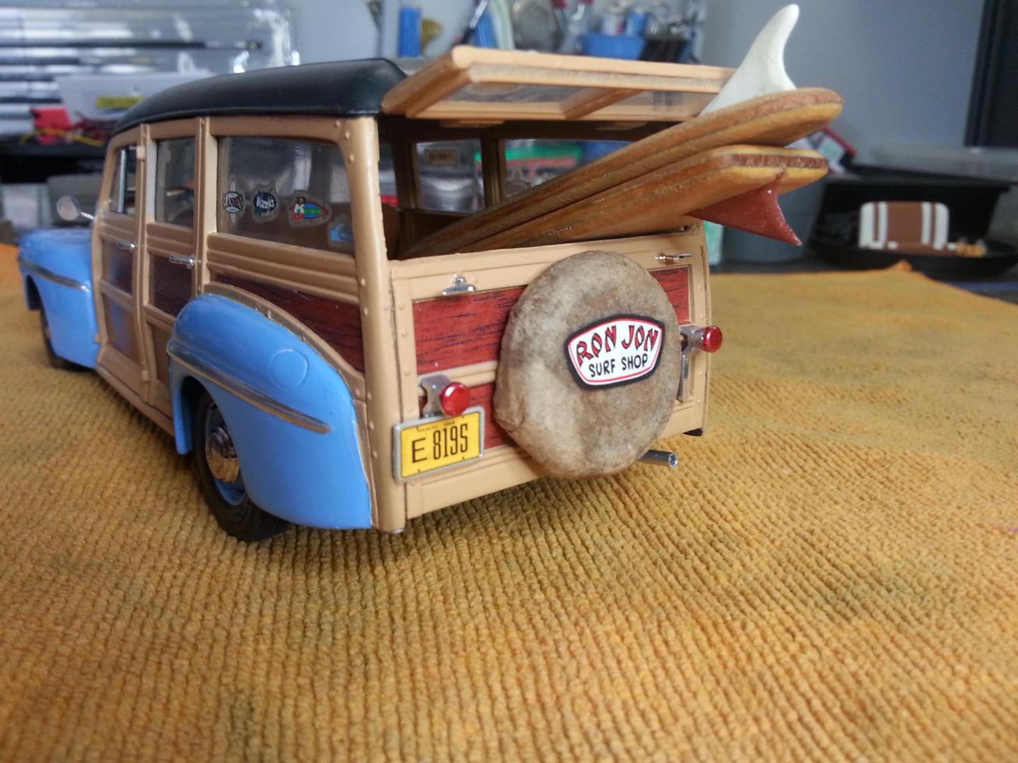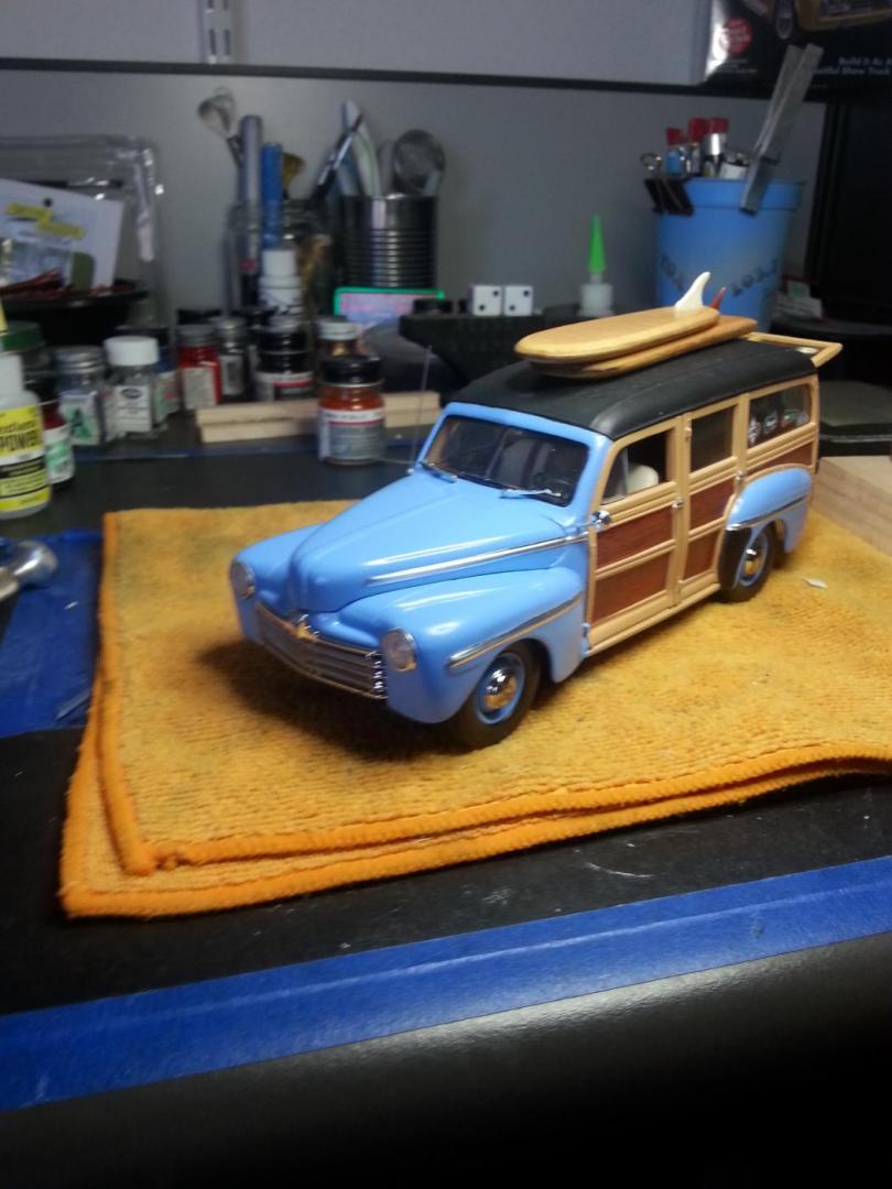 Wow ! I'm thrilled with all the responses. In no particular order, the wood on the body was sprayed the new Gloss Khaki 2X Rustoleum, the body is Spa Blue in the same format. They only made '48 woodys in two factory colors, a maroon and a dark green (I hated both). The Luann plywood is a breeze to work with, just trace it out and cut on a band saw or equivalent, then sand your way in. I then I used minwax for stain, and final topcoat was just Krylon Gloss clear. I'll probably add some retro brand names to the boards. I love the fact that they are real wood, just seems to lend credibilty to the build. I did knock the Gloss Khaki down with dullcote btw, but it's a lovely color either way. It's one of those colors you get in your aresenal and wonder how you lived with out it. I started with Revell/Mongram kit #85-2540, it has a press date of 1998. It's a terrific kit despite the age, and has a multitude of little things that aren't apparent on the box. It has a ton of decals for the engine, gauges, and surf themes, right down to the 1948 Hawaii license plate you see. I made the spare tire cover out of a glue soaked paper towel, and I cut the Ron Jon sticker off the backing of an actual Ron Jon bumper sticker. I deleted both the front and rear bumpers of this build. Just looked a lot cleaner and more modern this way. I also knocked the parking lights off that were below the headlights and deleted the chrome hood ornament for the same reason. In response to member buidnething above, I also have the '41 Woody kit that was just re-released. I totally agree with you about the wheels in that kit, and I don't like the funky intake set up they have on that flat head V8. Added to the fact that the '41 just ins't a good looking Ford, I'l probably saw the front clip off and swap in a '40 nose and go back to a more standard carb set up, and maybe some spun air cleaners from my friend Ron Parks, who coincidentally gave me the distributor I used on this build. Again, thanks for all the accolodes. It means the most when it comes from fellow modelers, they truly know the time and effort a build like this takes. -