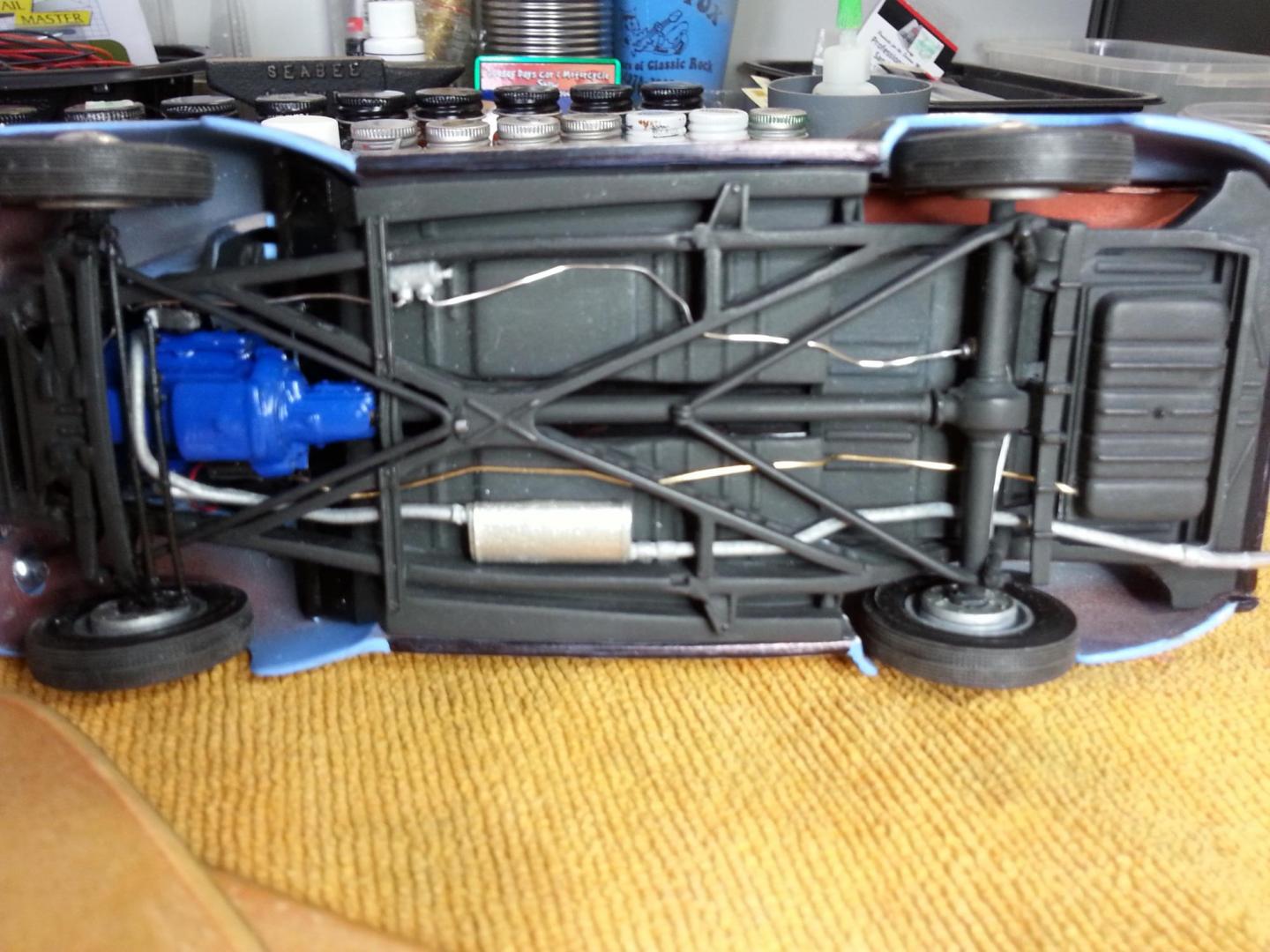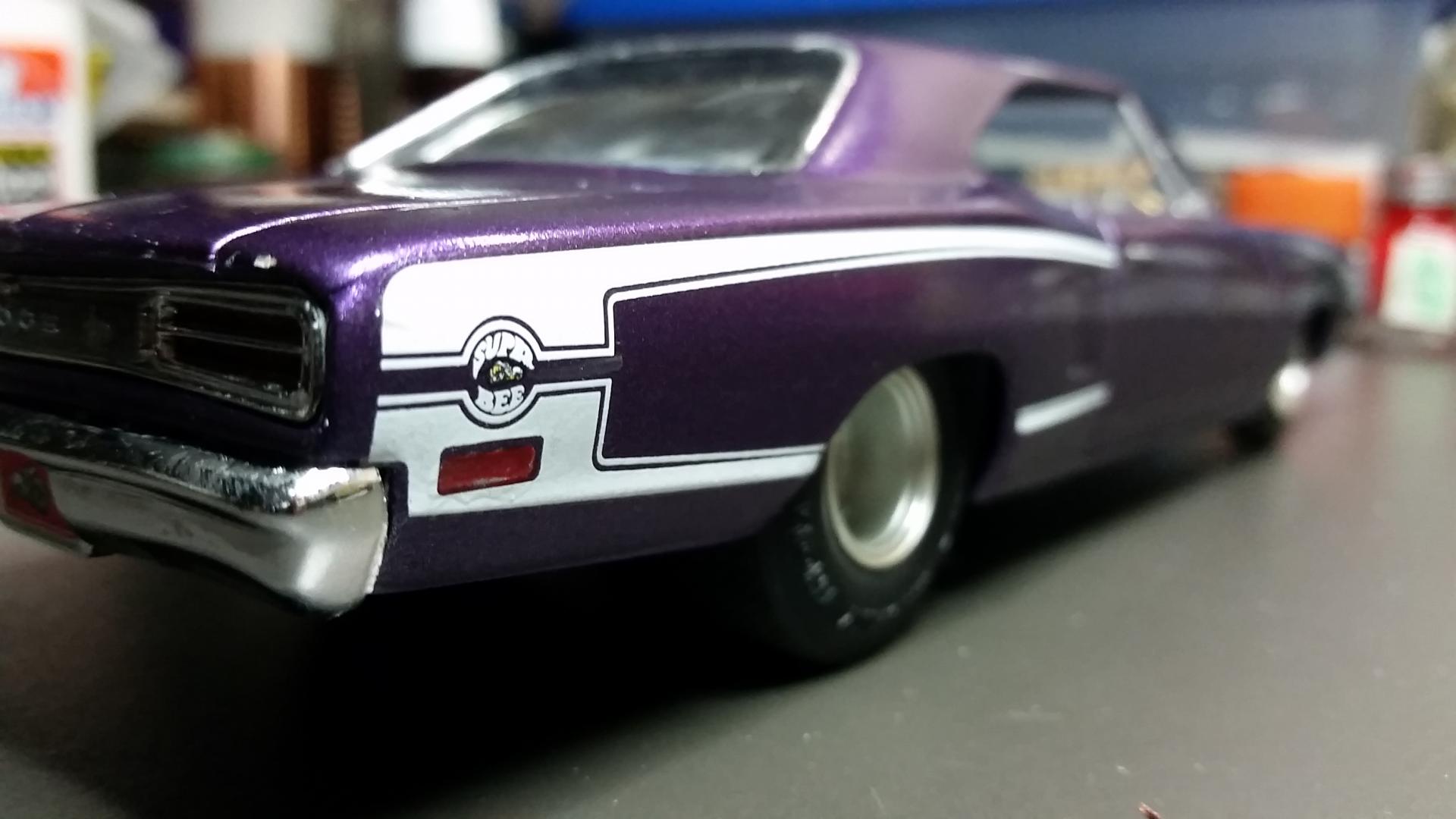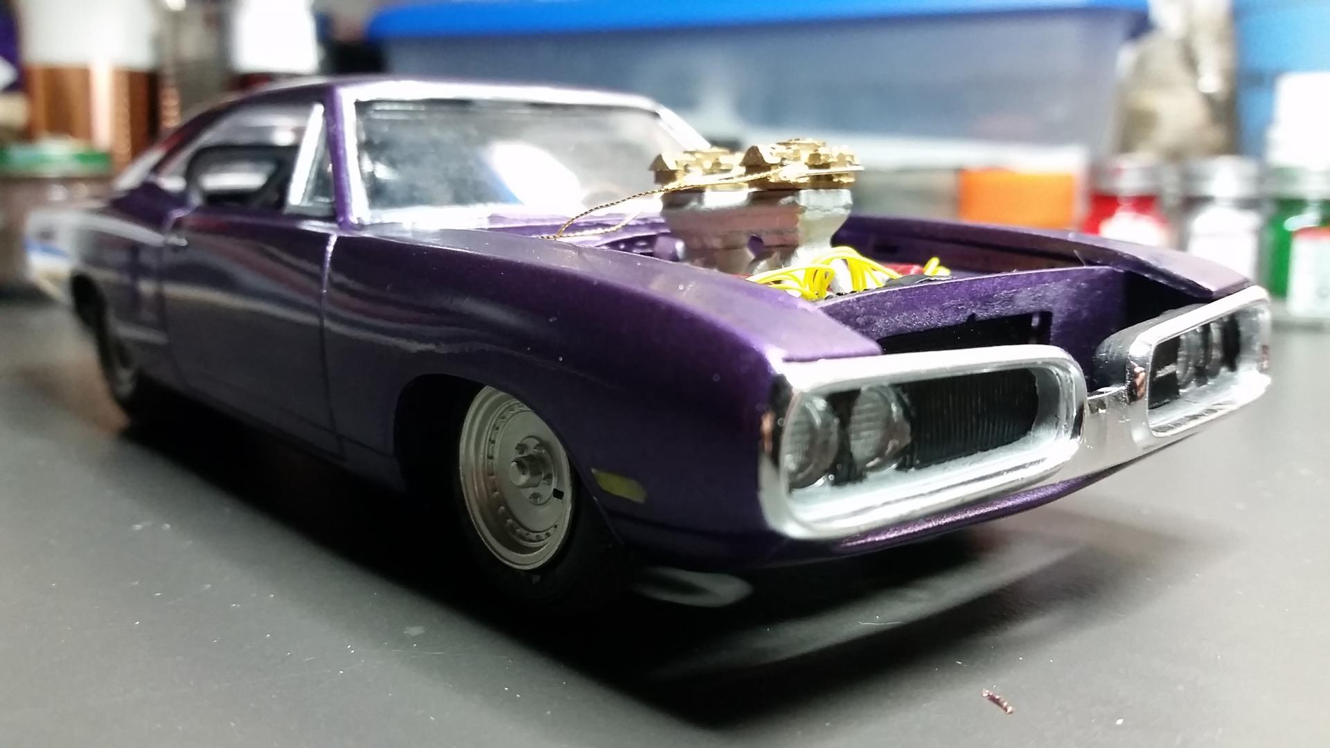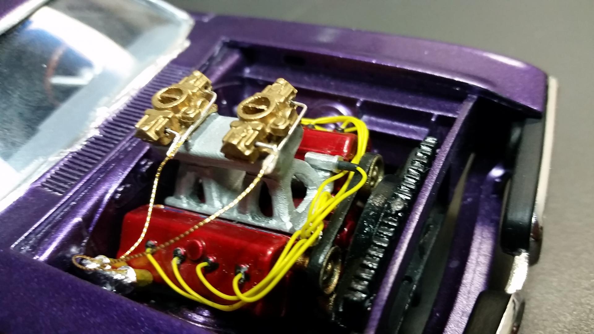 Finally got this beast painted and have the bulk of the assembly completed. I did run into hood interference problems with the distributor because I had lowered the car so much, but for now I like the looks of the DOHC Hemi anyhow. Still have some chassis wiring to do, and hope to have it completed soon. Thanks and happy building to all