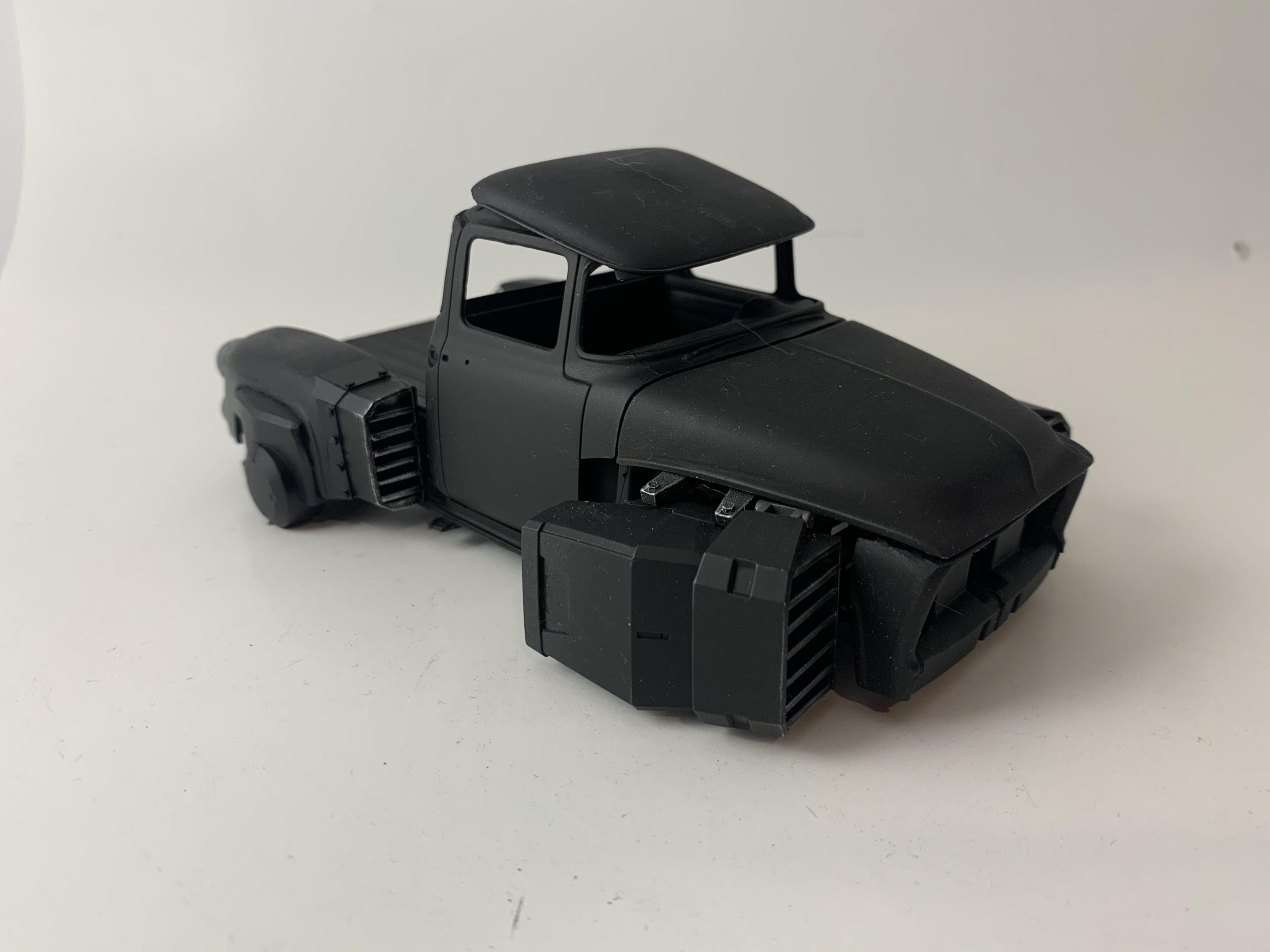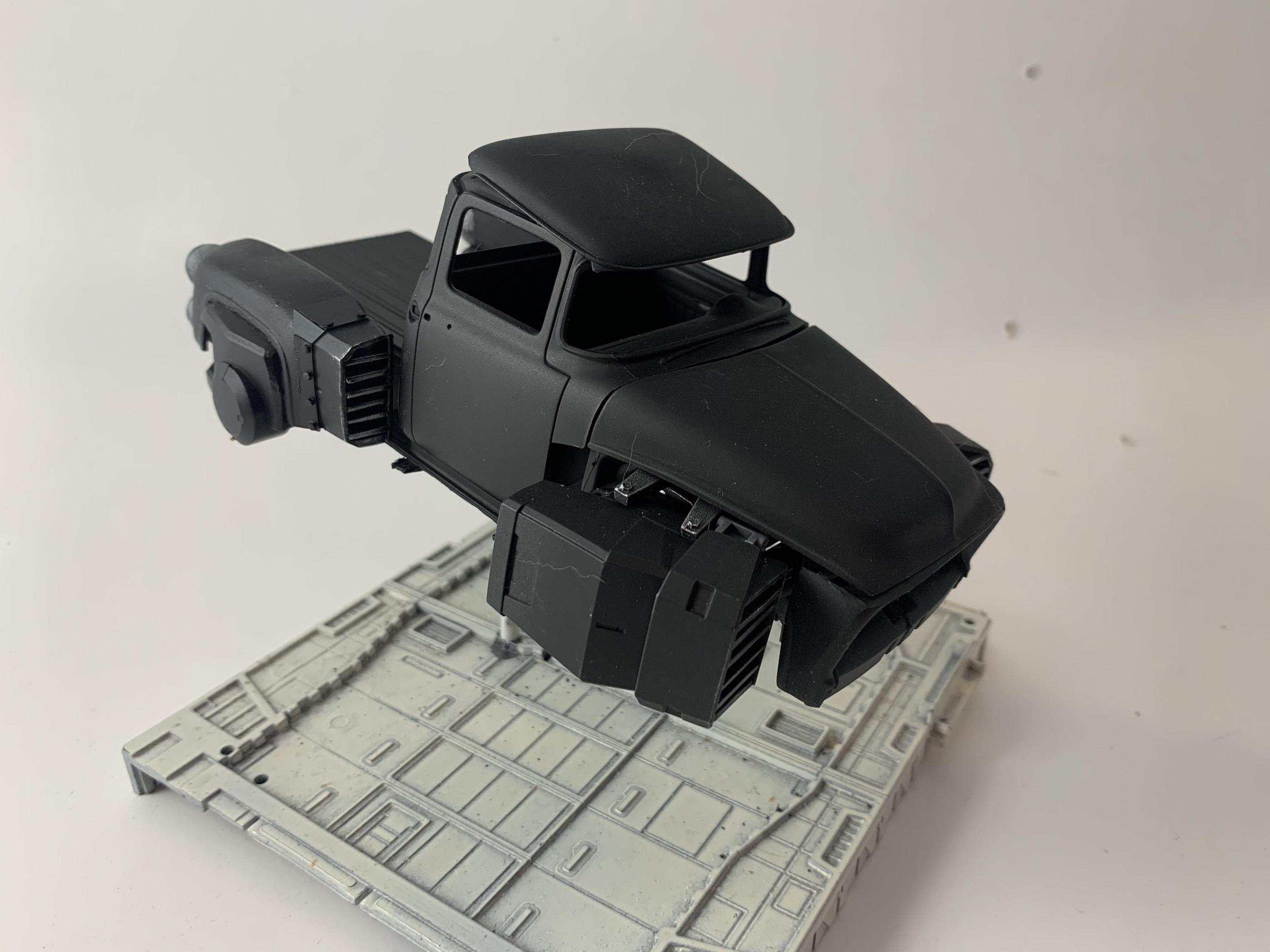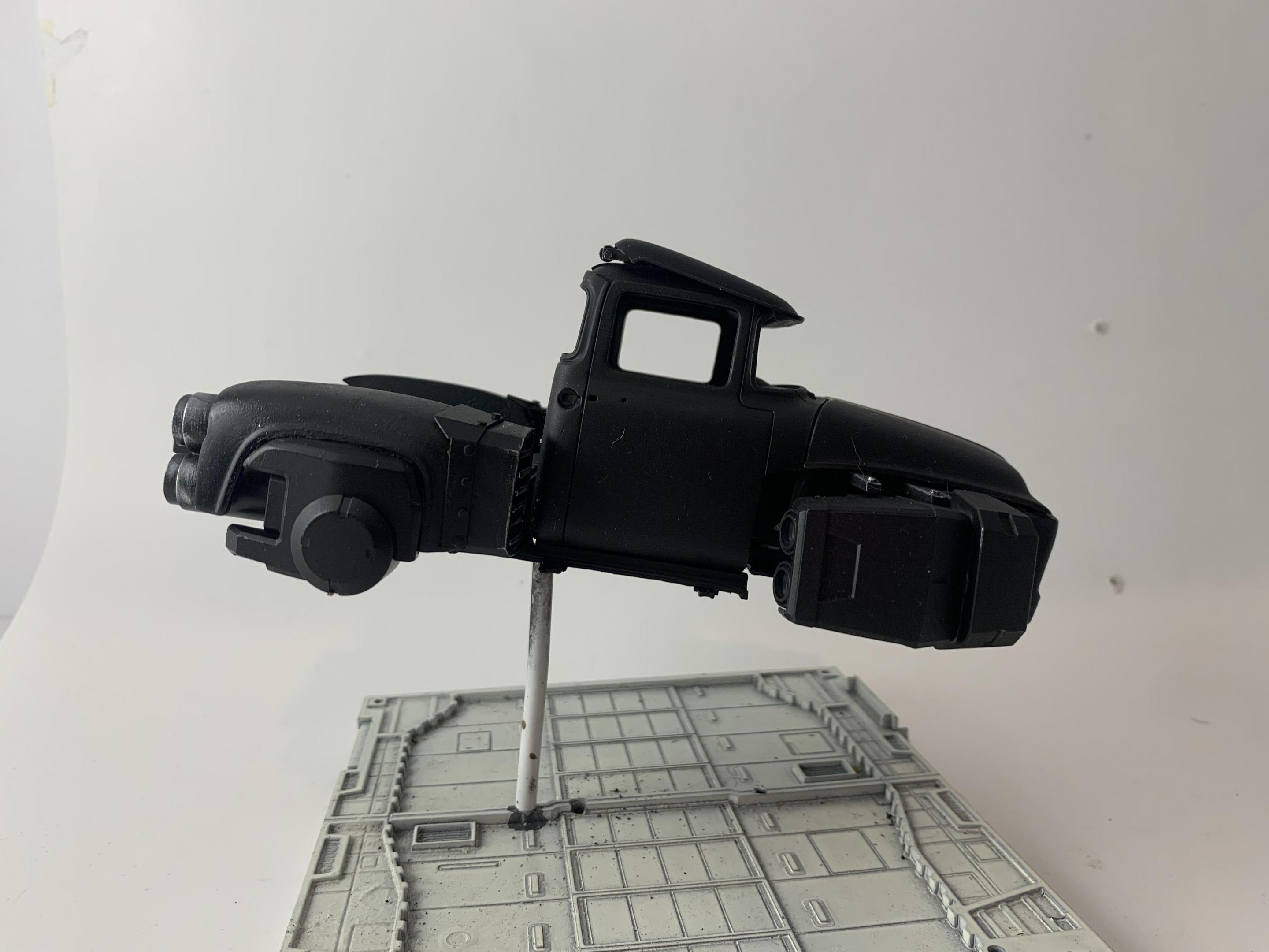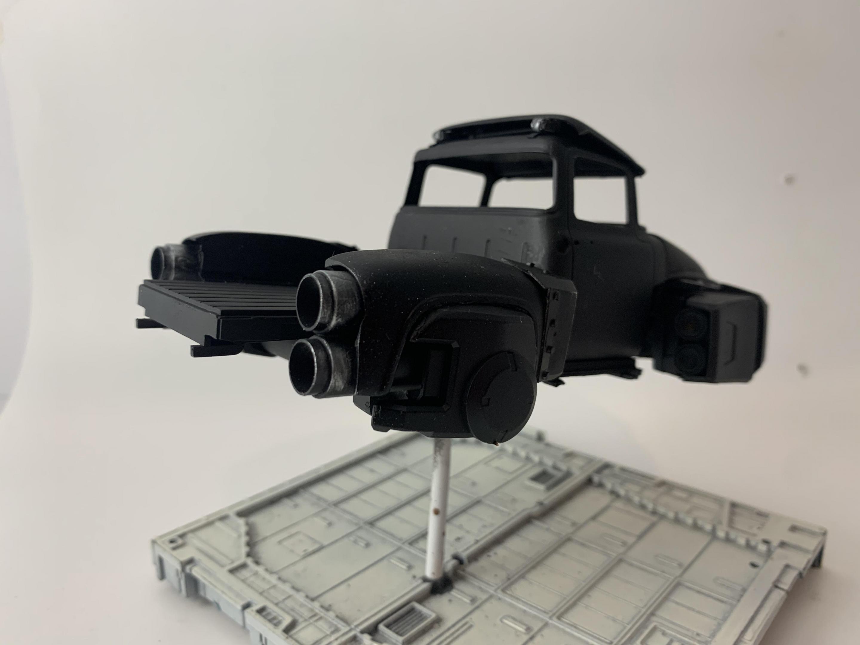 I primed it in flat black because it helps me see the overall picture better. Plus I like to highlight some of the mechanical parts in steel which looks great over the black. As I stated above, things will change from the beginning. The rear intakes in the previous photos were changed to these below. They match the fronts a little more closely now in size and shape.. This kit comes with a detachable roof. I used it to try to make a visor over the windshield. I added two tracks and rollers that pivot the roof up and forward. Looks cool right?! Well, don't get stuck on it because that's gonna change as well. The two little steel control arms sticking out from under the hood to the front thrusters.These added so much to the overall look. Remember the arm mechanism from the bed of the truck? It's now under the hood. Somebody looks angry. Miscellaneous junk added to the undercarriage. I try to fill all the bare spots with something, but at the same time it has to look like it serves a purpose.