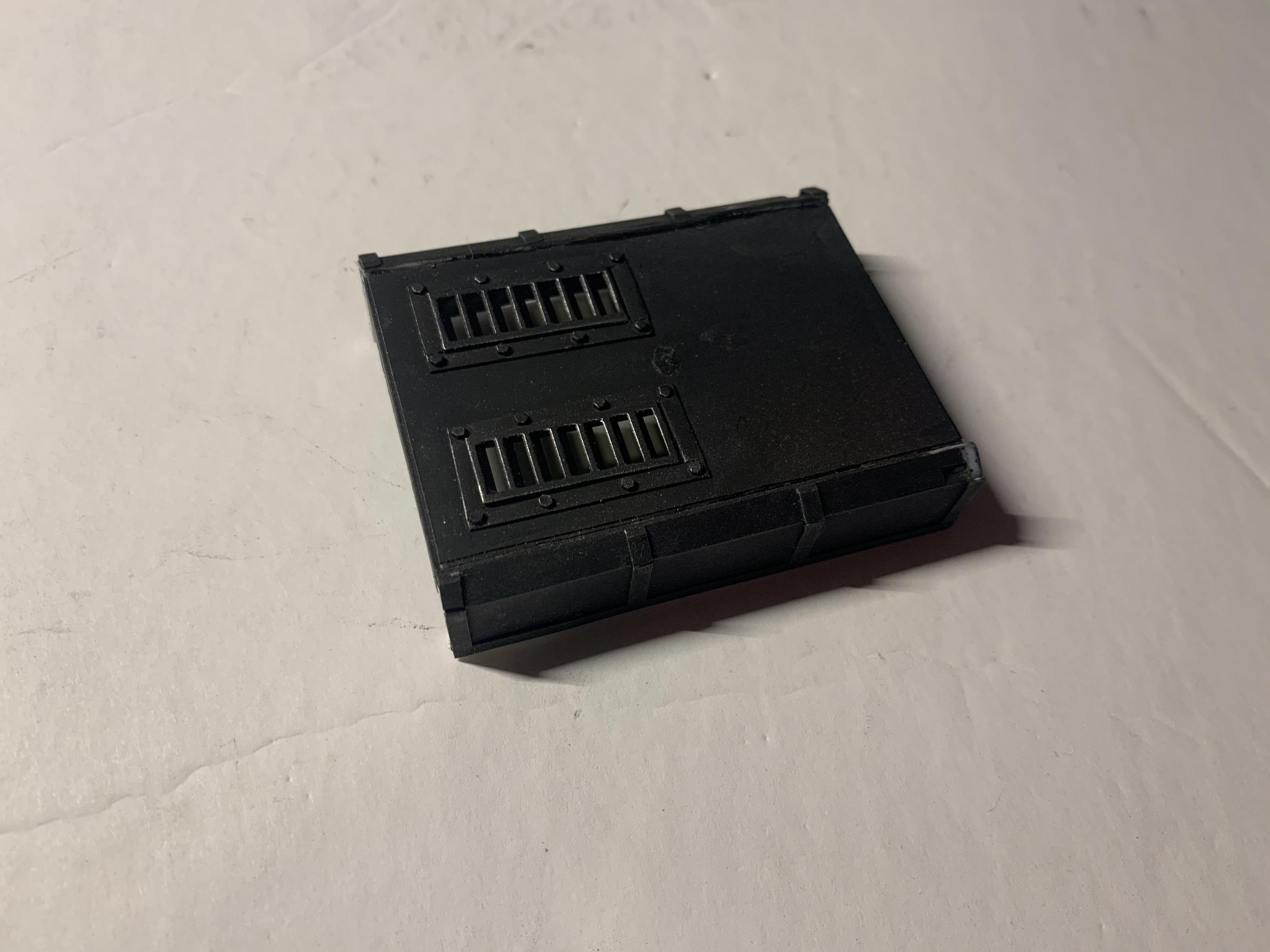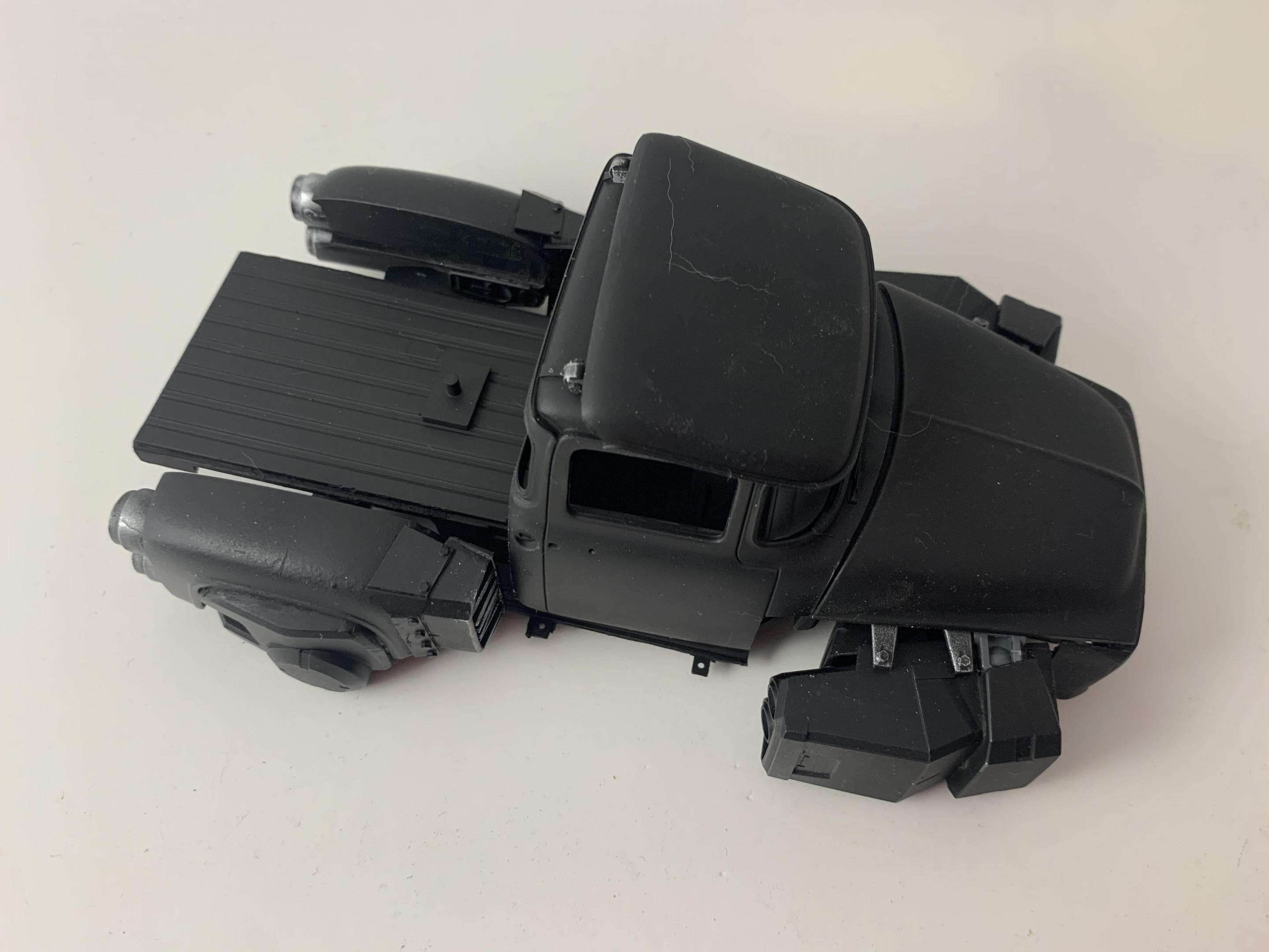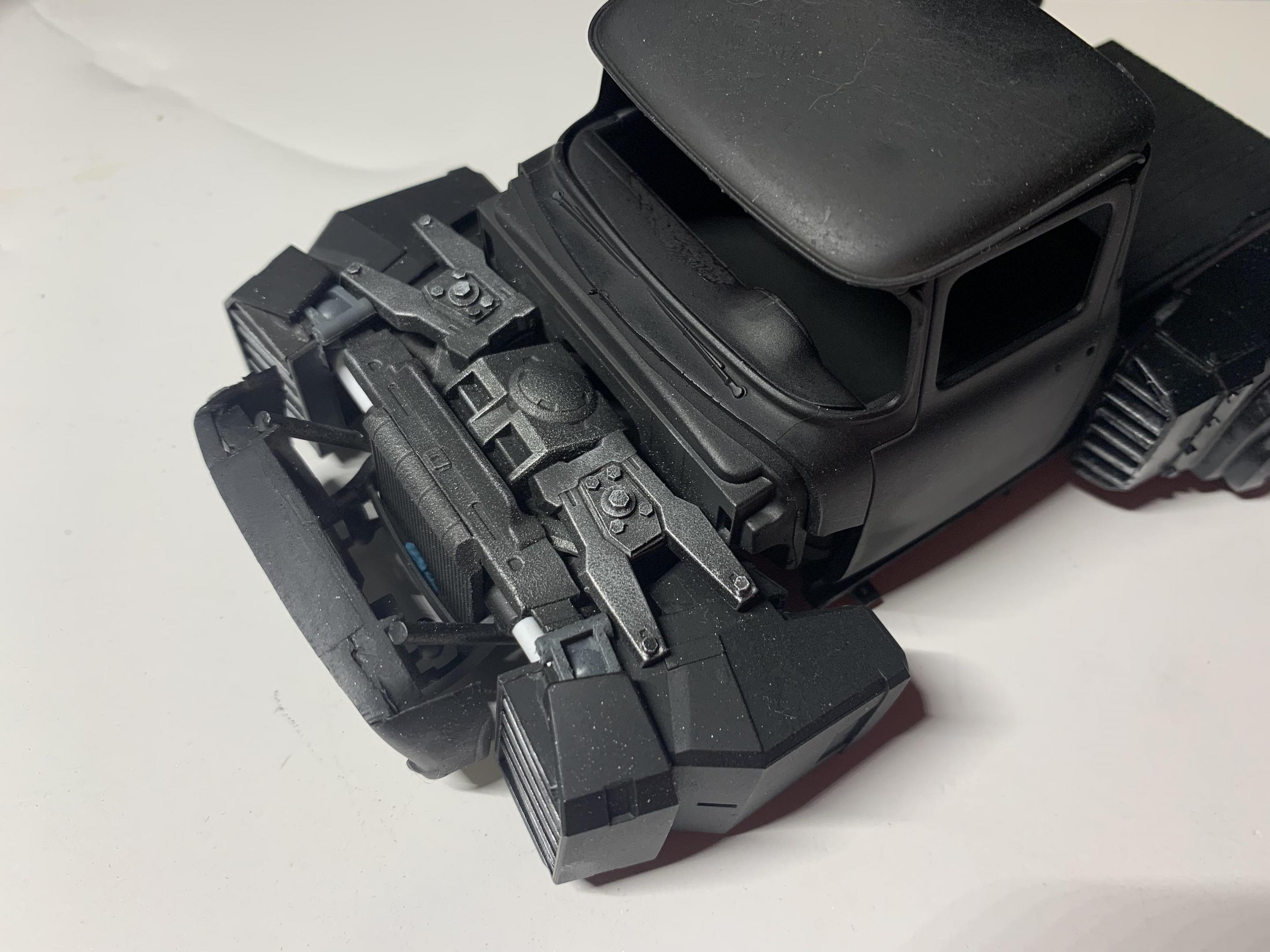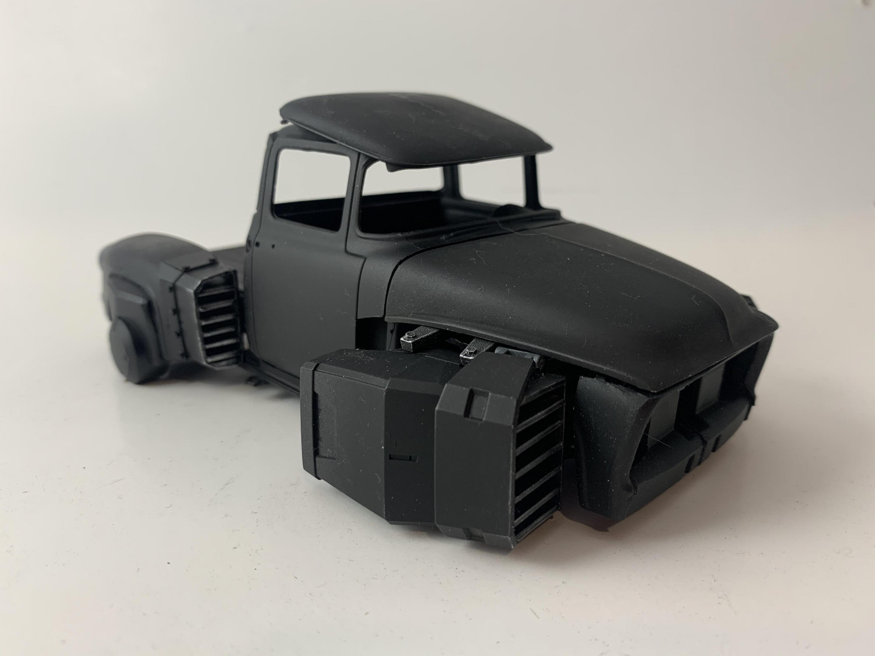 I primed it in flat black because it helps me see the overall picture better. Plus I like to highlight some of the mechanical parts in steel which looks great over the black. As I stated above, things will change from the beginning. The rear intakes in the previous photos were changed to these below. They match the fronts a little more closely now in size and shape.. This kit comes with a detachable roof. I used it to try to make a visor over the windshield. I added two tracks and rollers that pivot the roof up and forward. Looks cool right?! Well, don't get stuck on it because that's gonna change as well. The two little steel control arms sticking out from under the hood to the front thrusters.These added so much to the overall look. Remember the arm mechanism from the bed of the truck? It's now under the hood. Somebody looks angry. Miscellaneous junk added to the undercarriage. I try to fill all the bare spots with something, but at the same time it has to look like it serves a purpose.