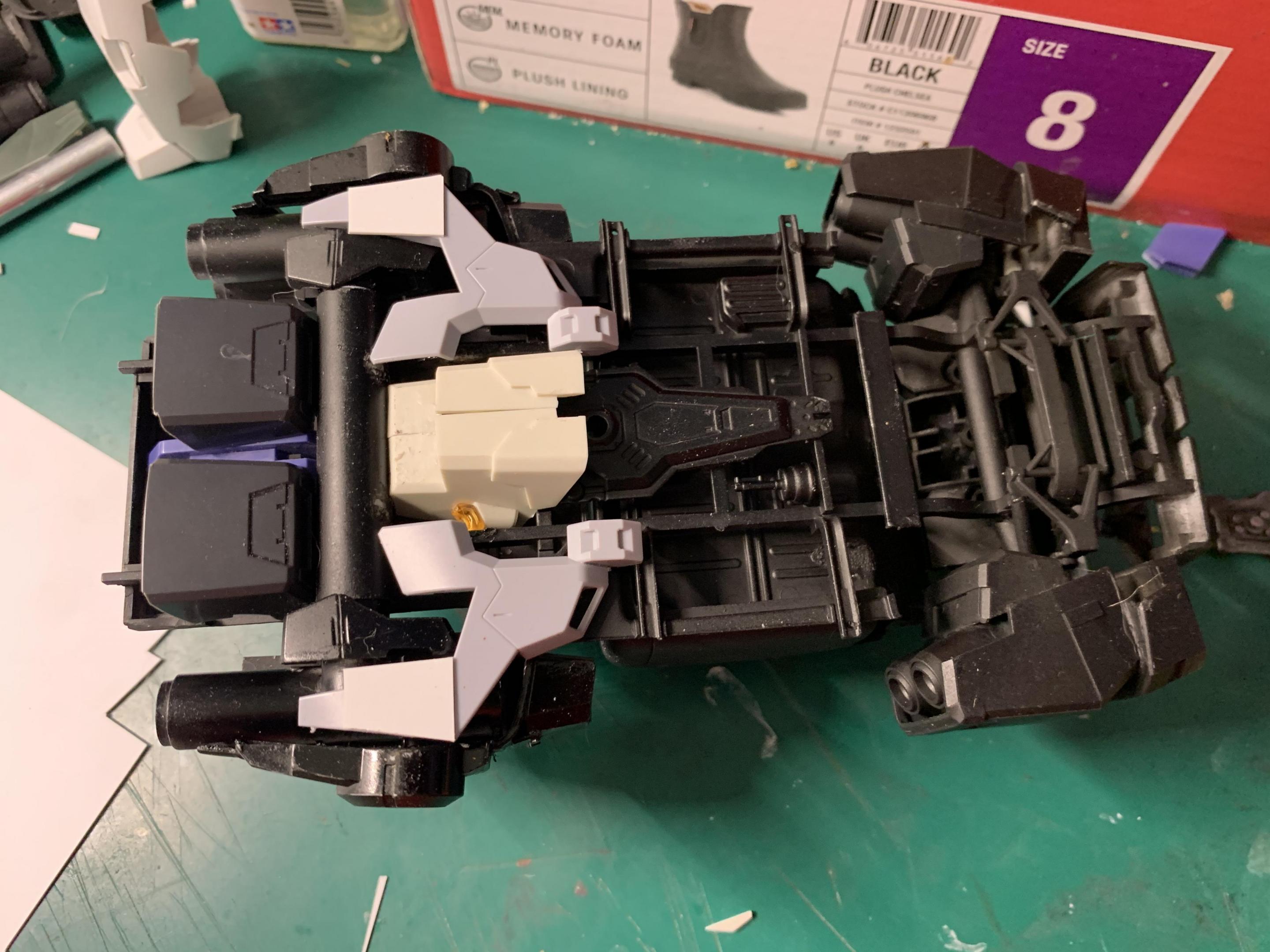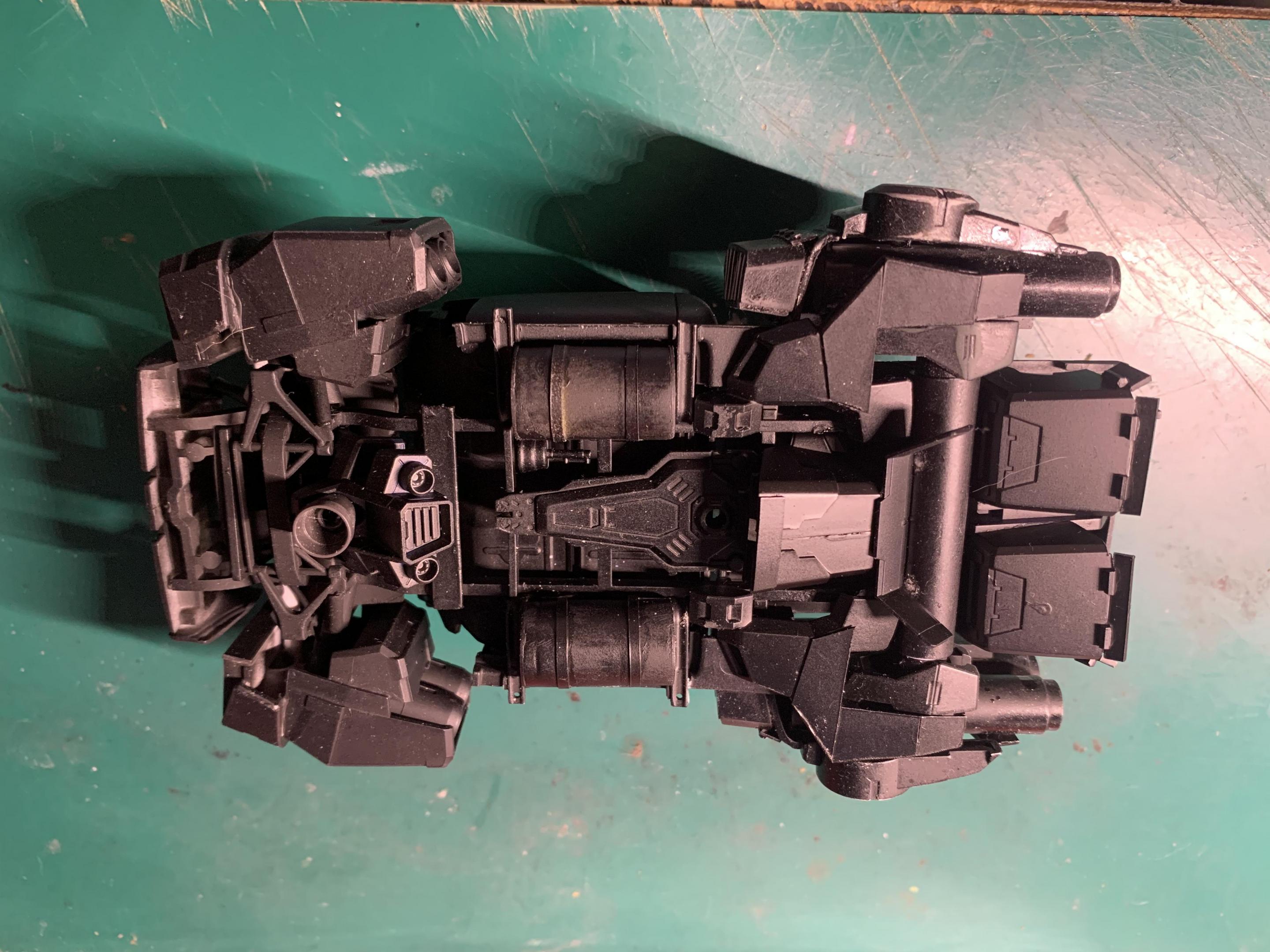You all really know how to make a guy feel special. Thank you so much for the comments. ? Tom I'm glad you asked about my inspiration. If you go to the link below, you'll see my work in progress of my very first hover car. In that post, I mention my inspiration for that build (check that link as well). A very talented builder indeed. His weathering and kitbashing skills are excellent. I've since found him on Instagram and we follow each other on that platform. I did use Pinterest a lot for my early hover car research. I'm now mostly on Instagram. Andre Tkachenko is a Russian artist that I follow. He has a style that I admire. Although not hover cars, but car design. It sounds ridiculous, but I also try to stick to this alternate reality timeline when I build these. In my mind these vehicles are from a post apocalyptic world of some sort. Think Mad Max but a little more civilized. Maybe 15-20 years after the event, the population starts to rebuild. These cars are taken from junkyards and reassembled as jet cars. Maybe they race for competition or for credits. The people have pride in their jet cars, so they do try to make them look cool. Much like we do to our cars today. I try to make the cars reflect that world in my head. The two grey parts above are used on the undercarriage below. Each had to be modified. I do modify most of the Gundam parts that I use. I'd prefer that they weren't recognizable. Lots of parts covering up other parts. The undercarriage is one of my favorite areas to scratchbuild. The four identical turbines under each wheel well are unique to this model. All of my other builds have different turbines from the front to the back. Vents, vents and more vents. It's gotta breathe. Thank you all for looking. I'll update soon.