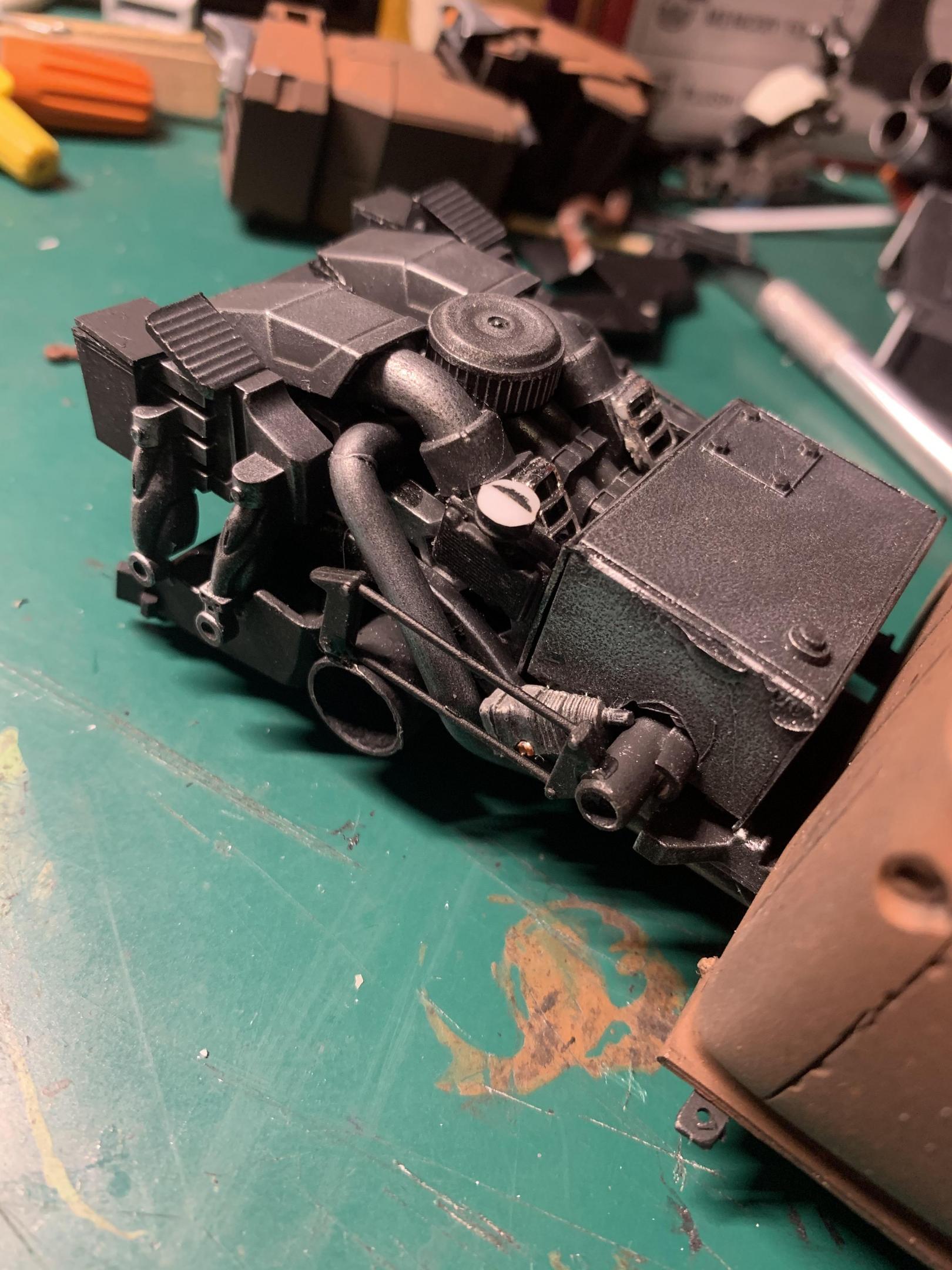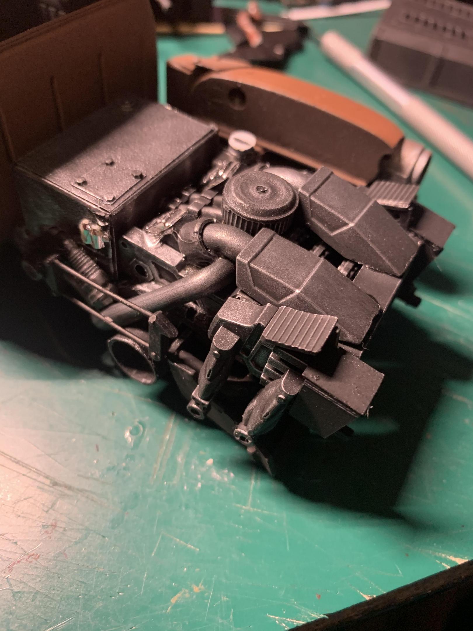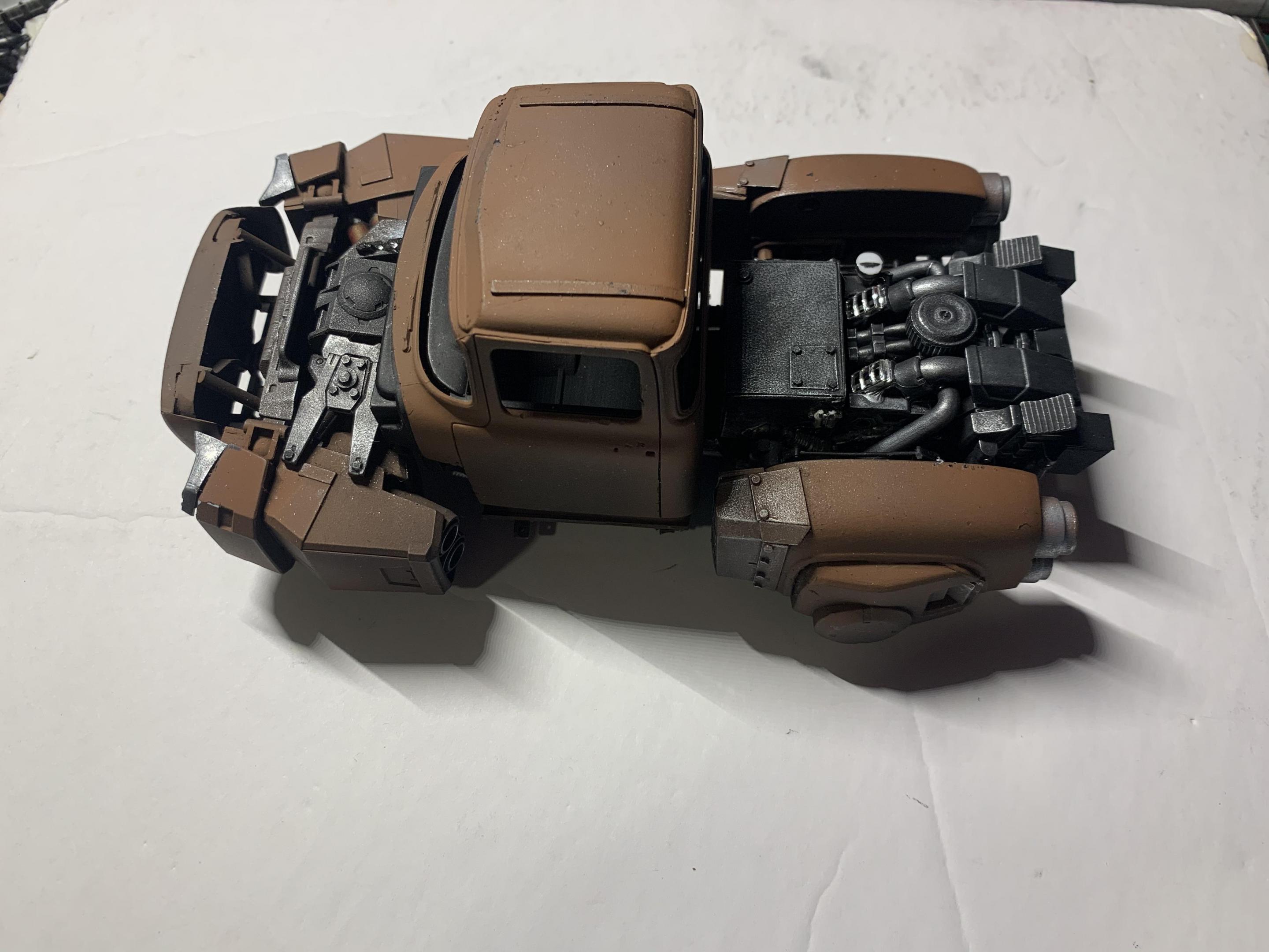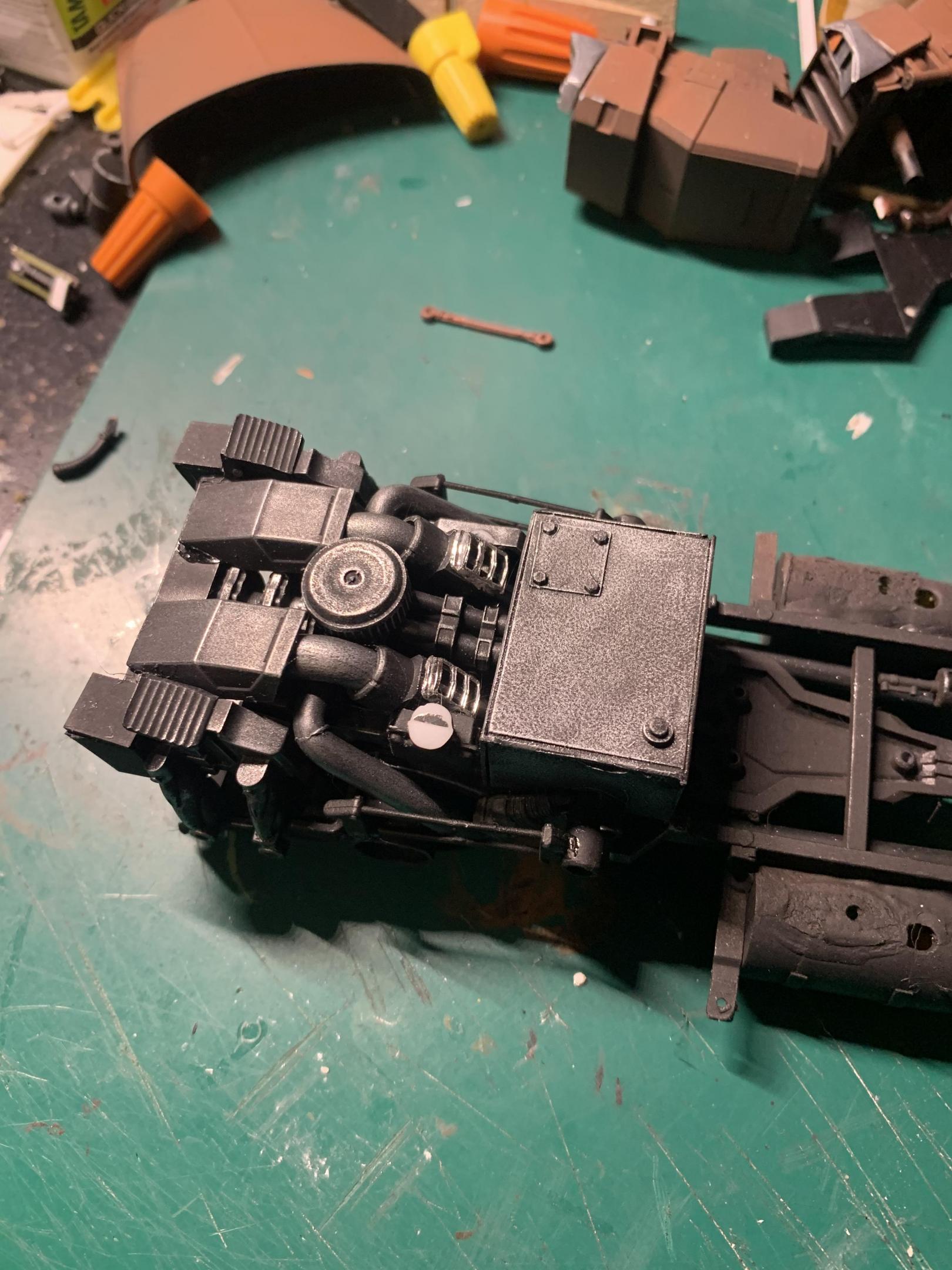 Thank you guys!!! Glad you all like it. That's a dream job right there! The next Mad Max? Here's some more pictures. A few close ups as well. I use the hexagon Styrene rod to make the bolt heads. I feel it adds weight to the parts. I don't remember where I got the monitor display from. It's been in my spare parts bin forever. It fits the truck, big and bulky. The two A-arms that are mounted to the top of the front turbines is my favorite part. I also really like the way the visor turned out. Can anyone guess what vehicle are the side mirrors from? Hint: They're not side mirrors on the vehicle I took them from. Here's the undercarriage before it was finished and painted. Unfortunately I don't have a pic of it weathered with all the plumbing hooked up.. -