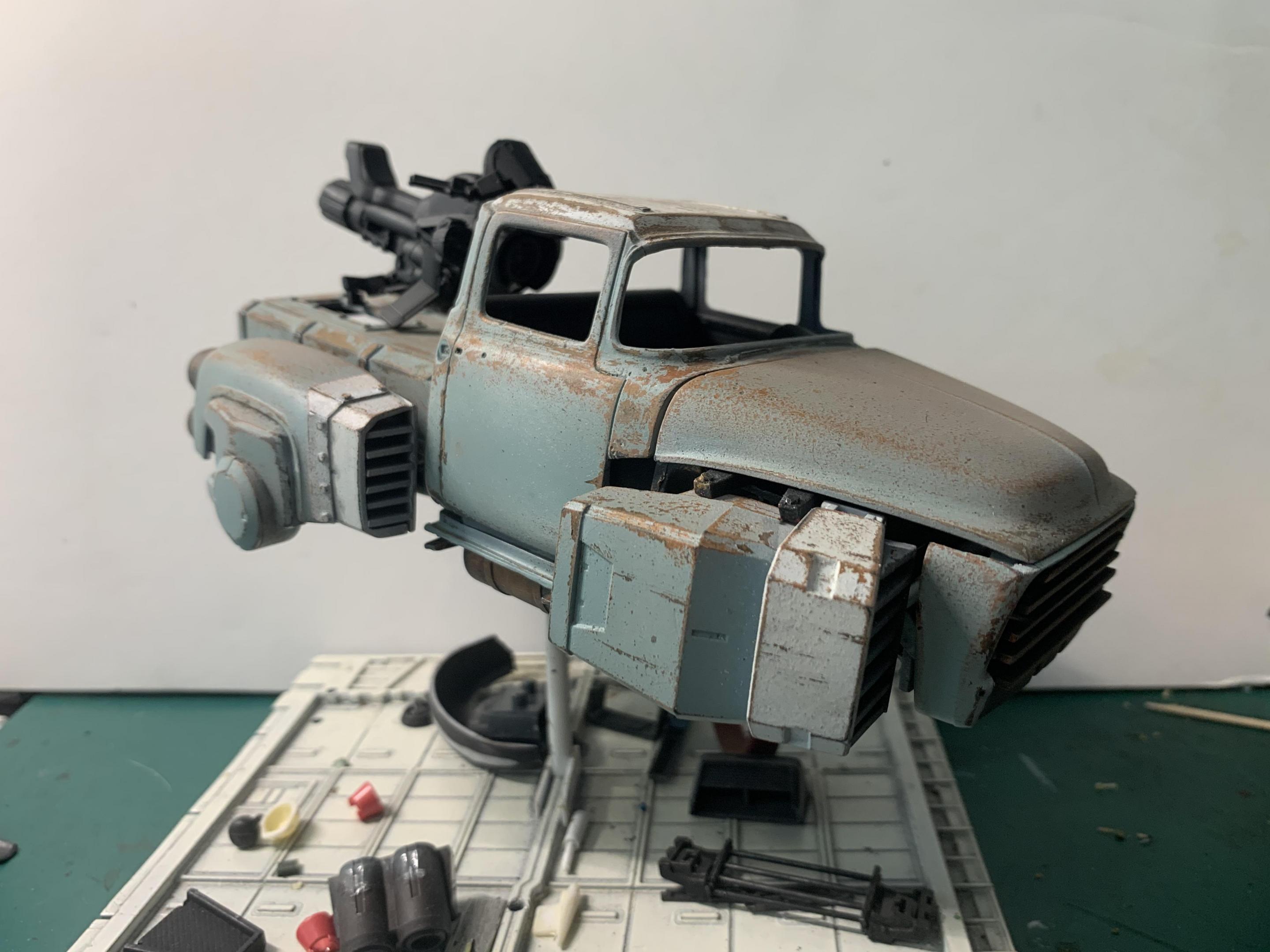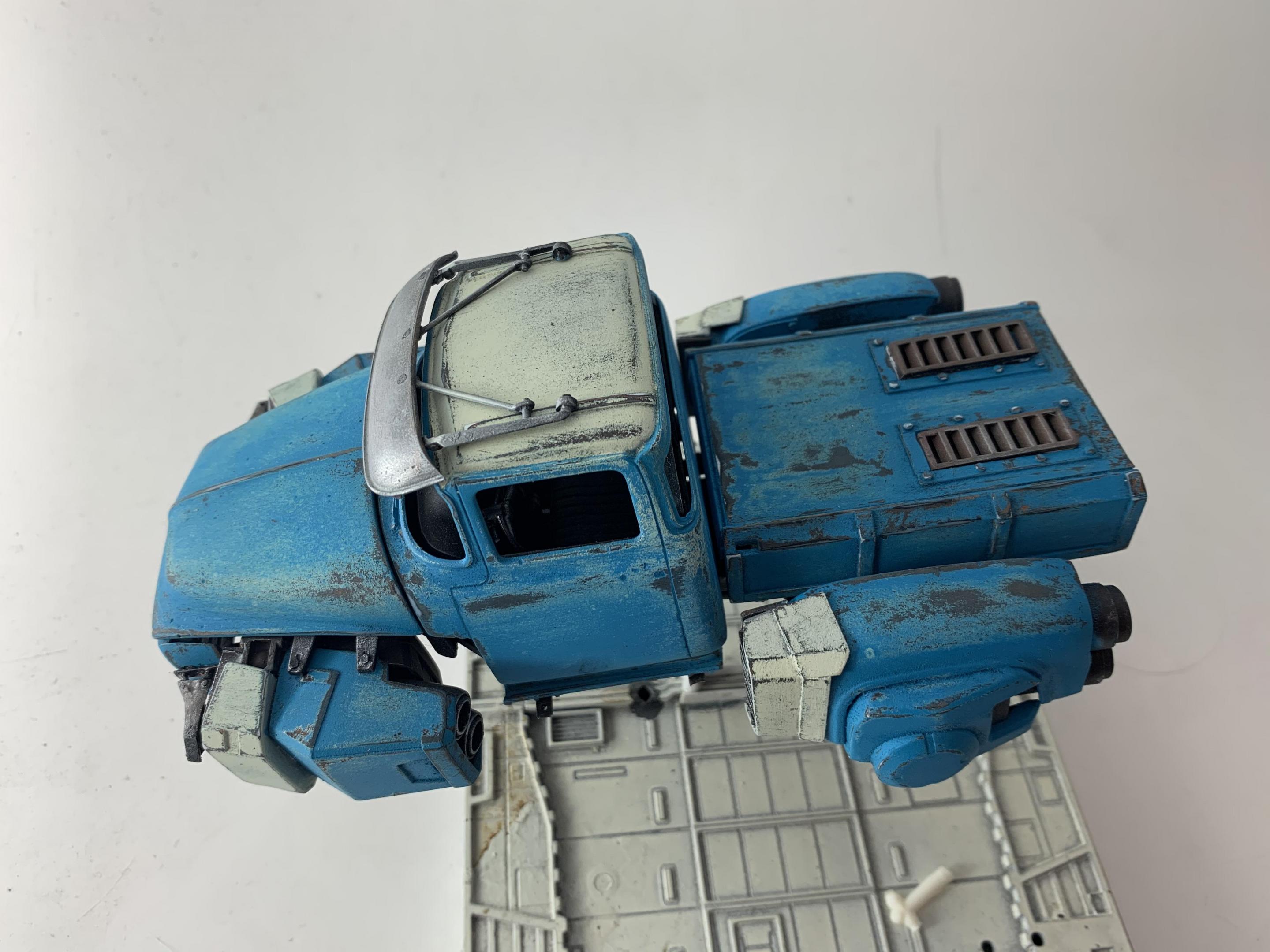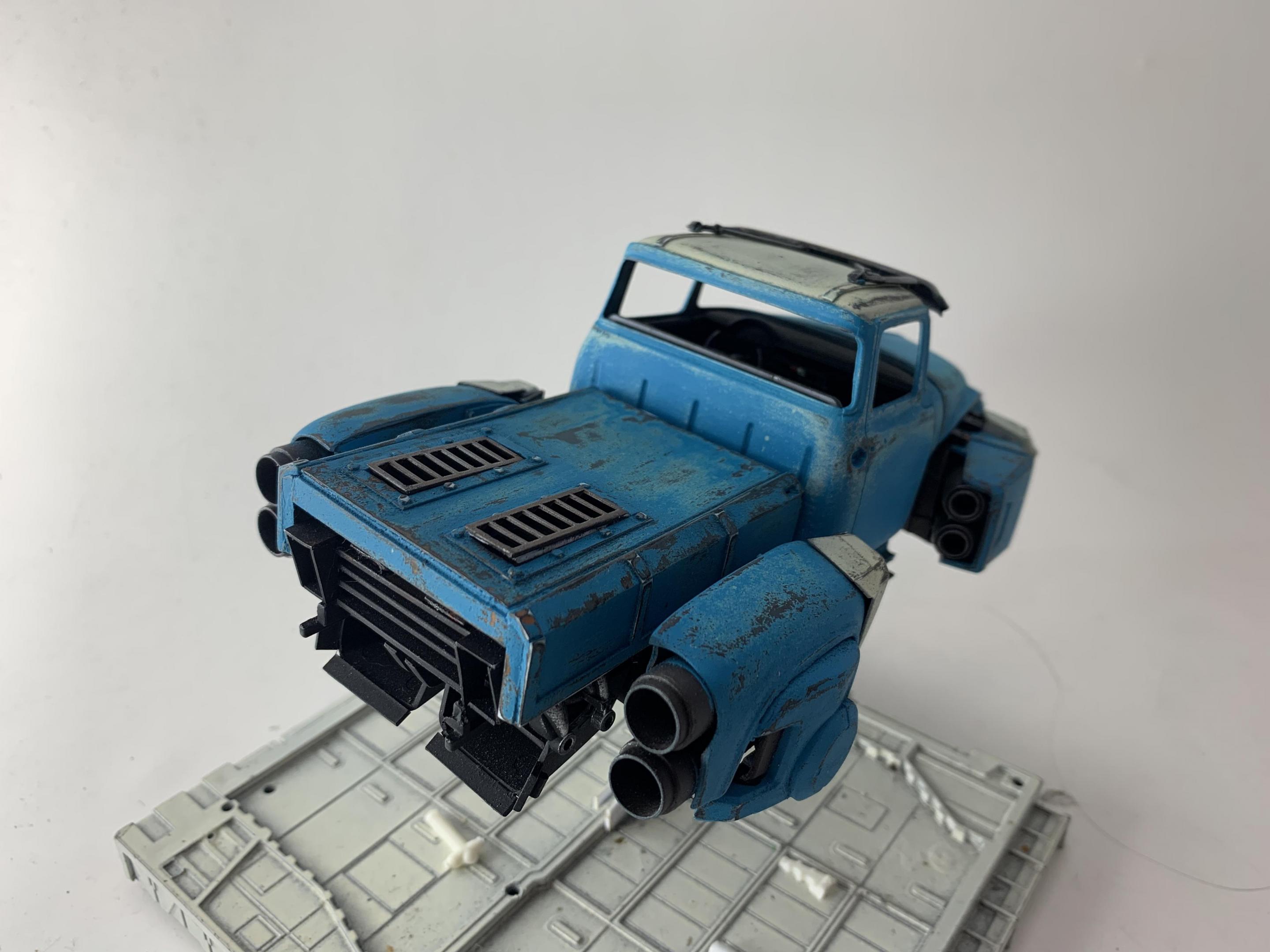 Thank you both! Much appreciated! So if you follow my builds, you'll know that I am the master of the strip and re-paint. I can't remember the last build that didn't get painted at least different two colors. For the first color to be stripped, I chose this light blue-grey with a bright white accent. I also build my first jet bike. The handlebars, gas tank and seat came from a Japanese model kit. Kotobukiya Hexagear - Rayblade Impulse. Another donation from my son. The rest of the pieces on the bike were from Gundam kits and styrene tube. The plan was to mount the bike on the back on the truck bed like in the photos. This jet bike was really fun to make. I want to make more!!! After all this I won't be including the bike with the truck. After a week of looking at the truck with the dull blue-grey, I stripped the paint and started over. I painted it a more brilliant blue. More contrast. Thanks!!!! -