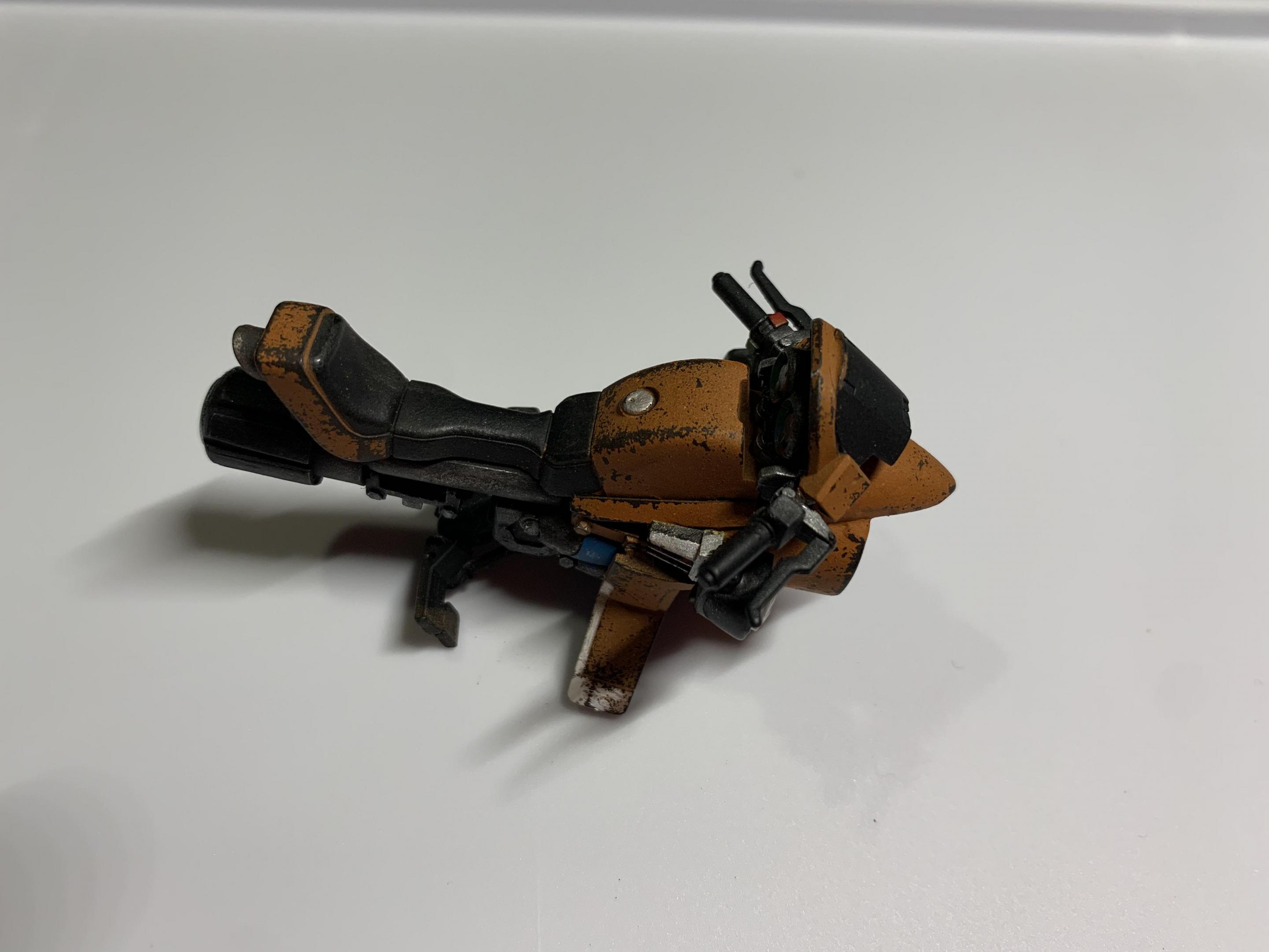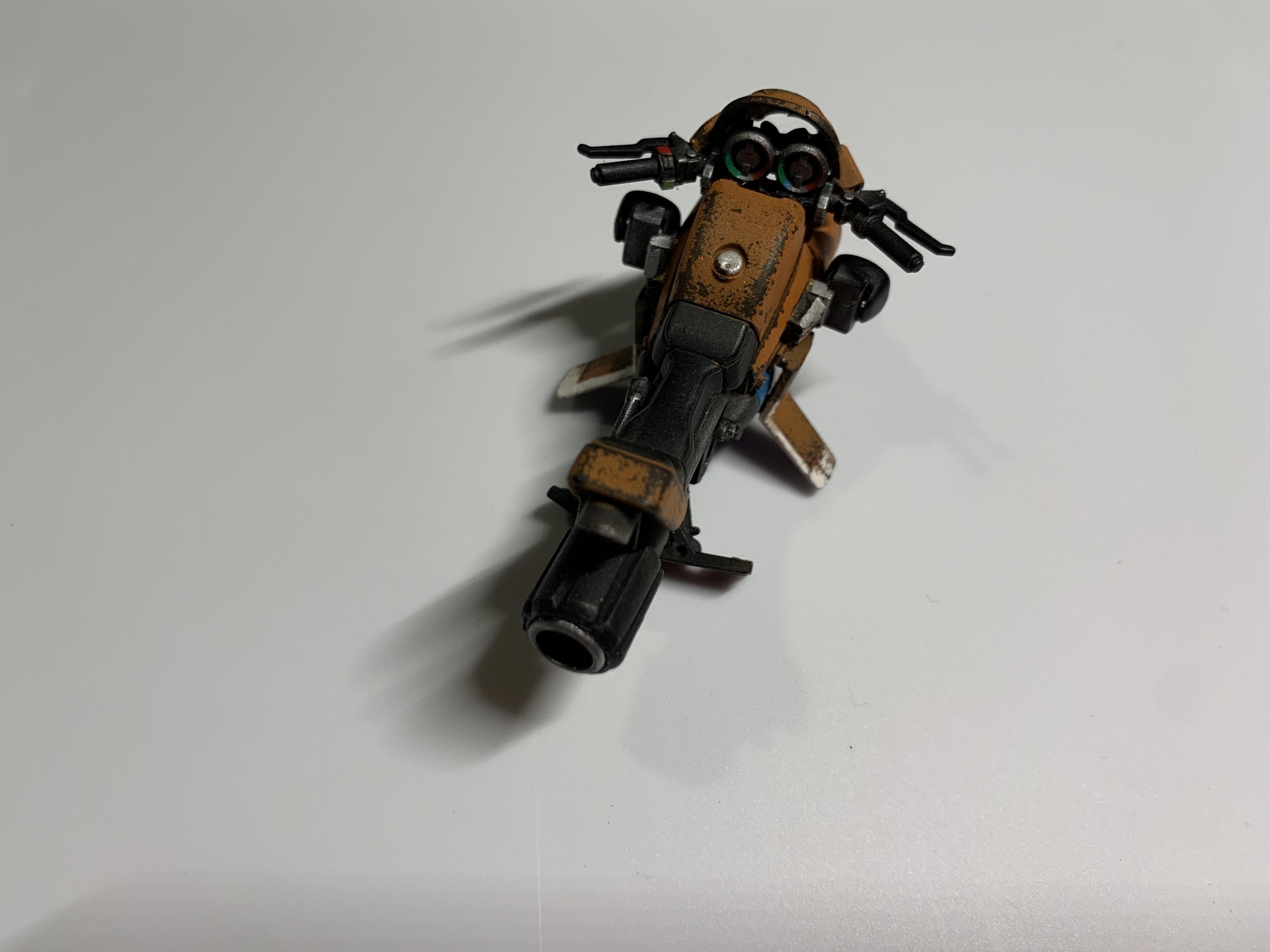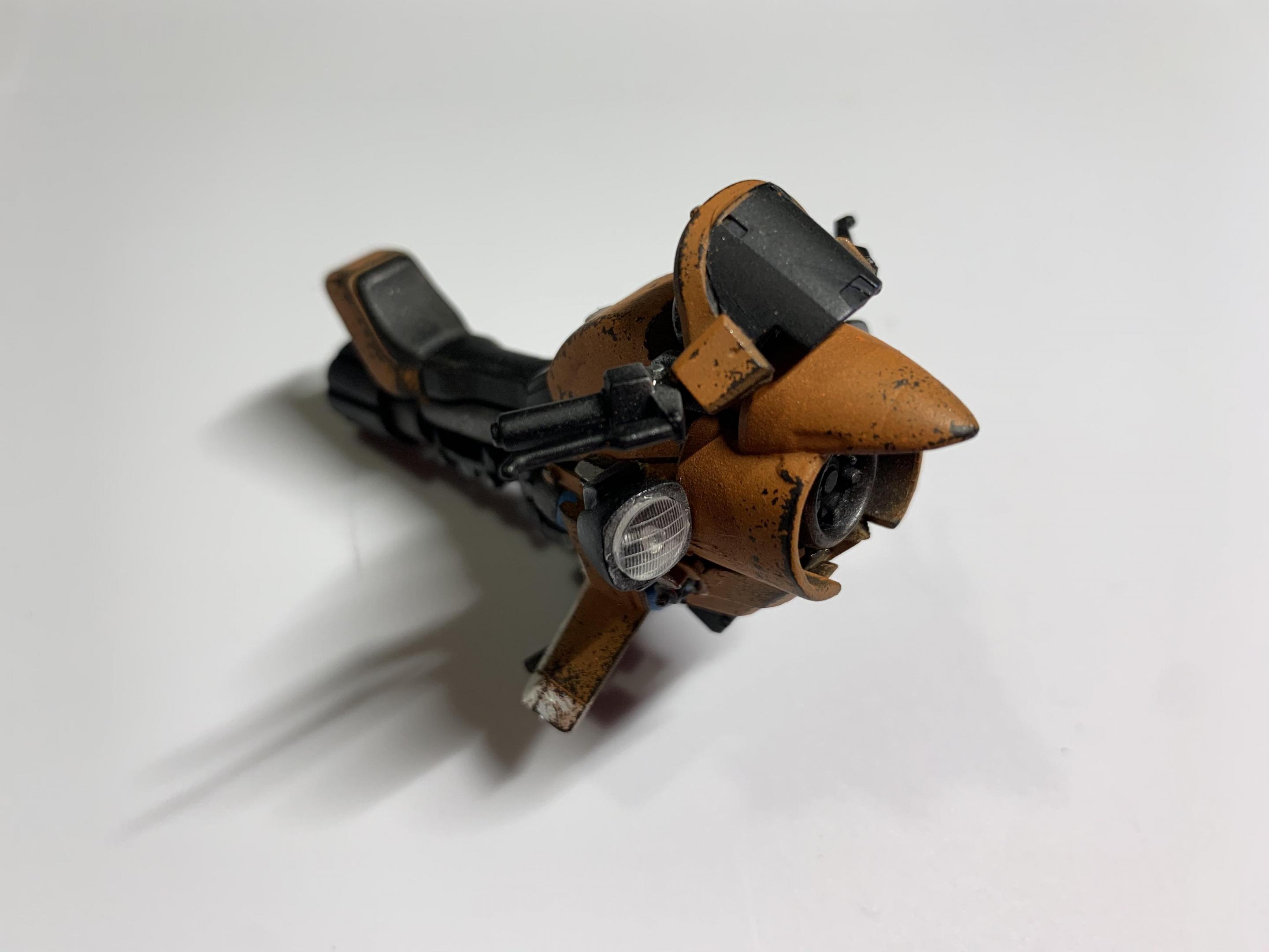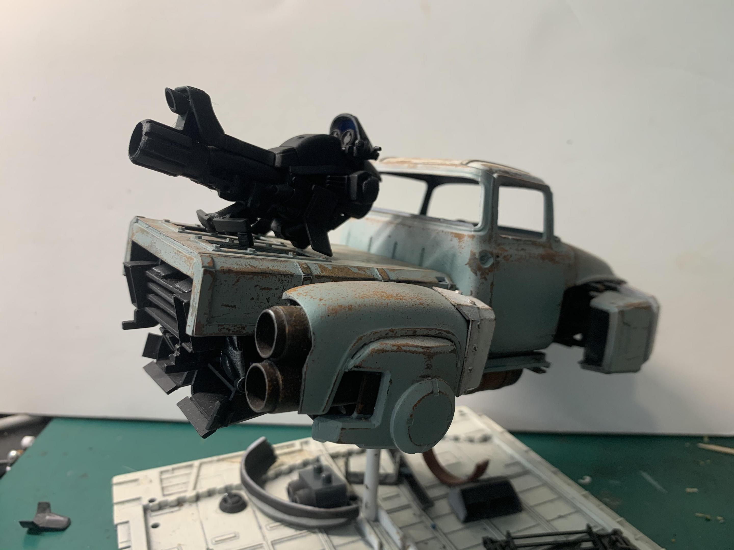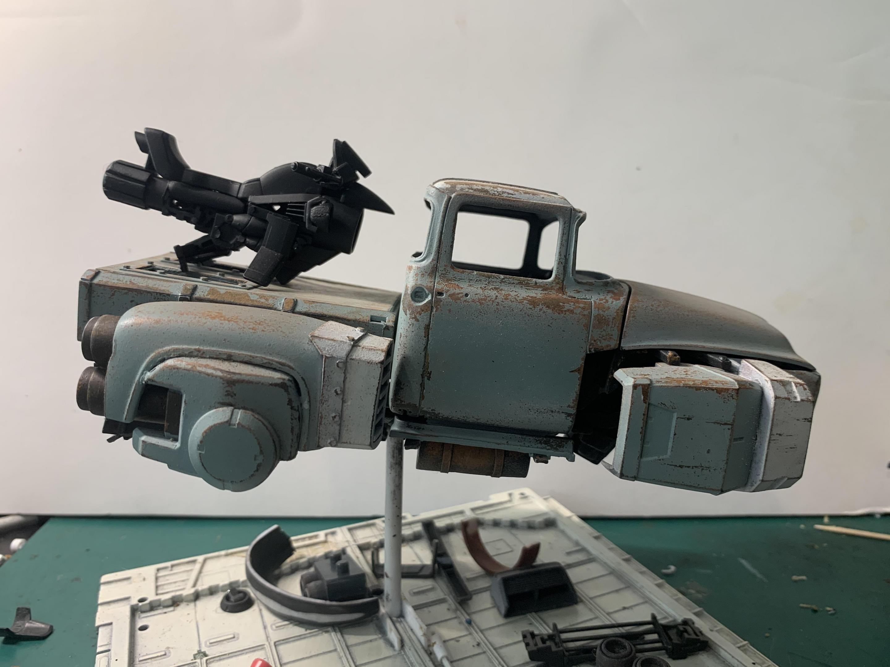 Thank you all!!! Thank you Rob. i start with a base coat of rust colored primer. Then two coats of Dullcoat. Third is a few layers of Acrylic latex in the body color. Lightly sand until it wears thru the latex and the rust primer shows thru. I'll go back with Acrylic rust colors and give it random highlights. I use 4-5 different rust colors for the highlights. Dry brush or with a sponge. Here's some more photos. Close ups of some of the small details. I love putting in tiny details. Most of which isn't seen unless you're really looking. My 1st attempt at the fins on the afterburners. A cool undercarriage view showing the Gundam parts, styrene rod and the kitchen sink. Before paint and weathering. Flight controls. All of them have the steering wheel designed like a flight yolk. Plenty of levers and a few have computer screens. Another undercarriage view. I'm still working on the Jetvette. Procrastinating on the livery decals. It's almost complete at this stage. I just need to do a little weathering. It wont be as weathered as the rest. Just a little grime.
