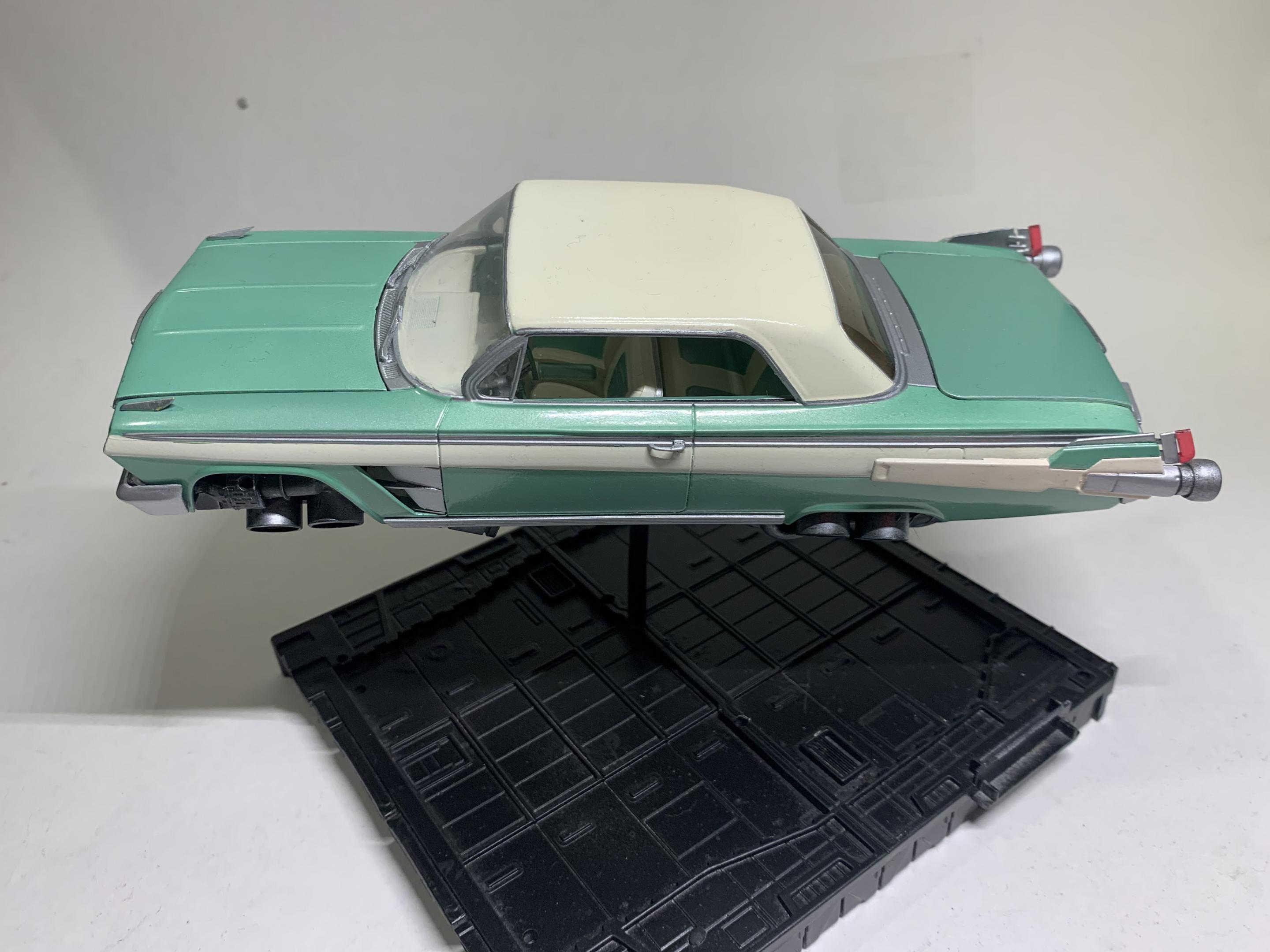 Thank you Dave! Thanks for bringing this post back John! Now I can add my 62 Impala. 62 Impala - Lowrider/Highflyer - Build 11 From the start of this build, I wanted it to have the lowrider style. Not too flashy. Simple and clean. I'm very happy with the color combo. Tamaya TS-60 Pearl Green and TS-7 Racing White. I used Aluminum spray over anything that was supposed to be chrome. I added about 3/16" Styrene strip to the lower rear quarter panel below the white side stripe. It helped bring the rear wheel arches down and also give the car a more rectangular look from the side. I also cut out reliefs in the front fenders. You know I love my vents and large intakes! I used the same VTOL type thrusters under each of the wheel wells as I did on the 41 pickup, and the 32 Ford Vickie. It's probably the most simple type thruster to make. Take half of a V8 engine. Cut off the transmission housing from the bell backwards. Glue two Styrene tubes where the heads mount. Then glue it to the undercarriage so the thrusters angle out at 45 degrees. Then cover it in pipes or whatever will disguise the engine block. Fill the wheel wells with parts that look like they belong.