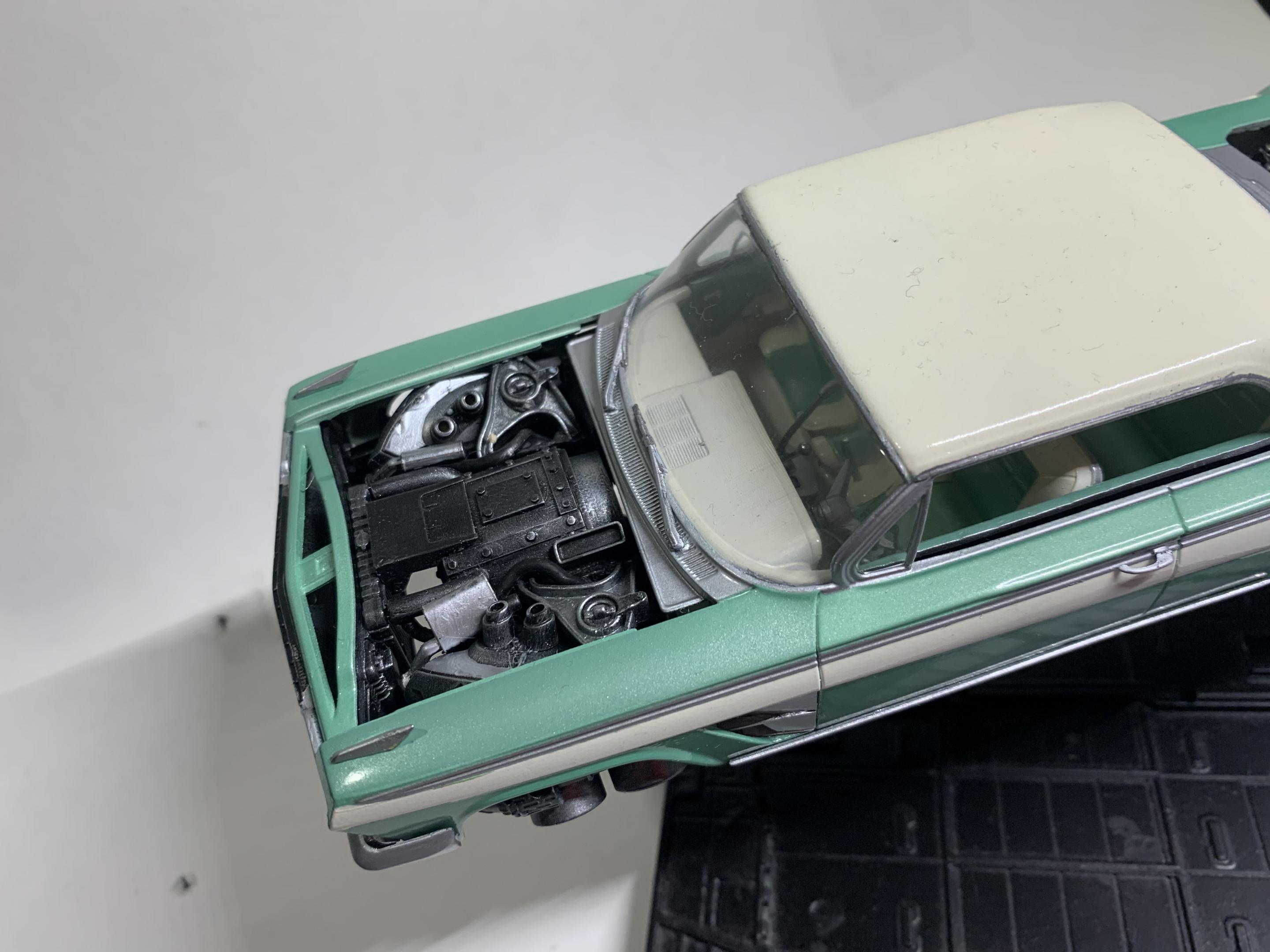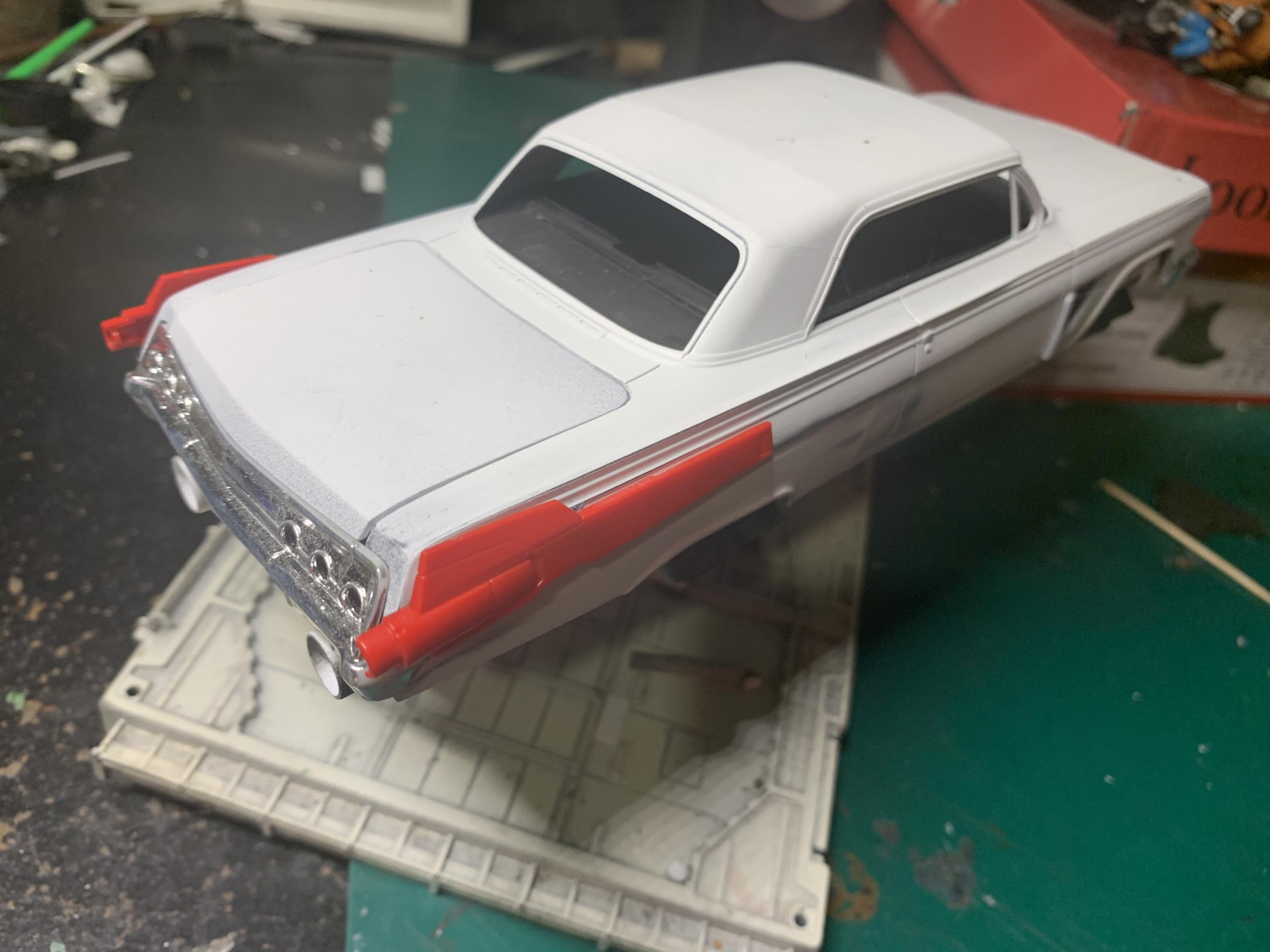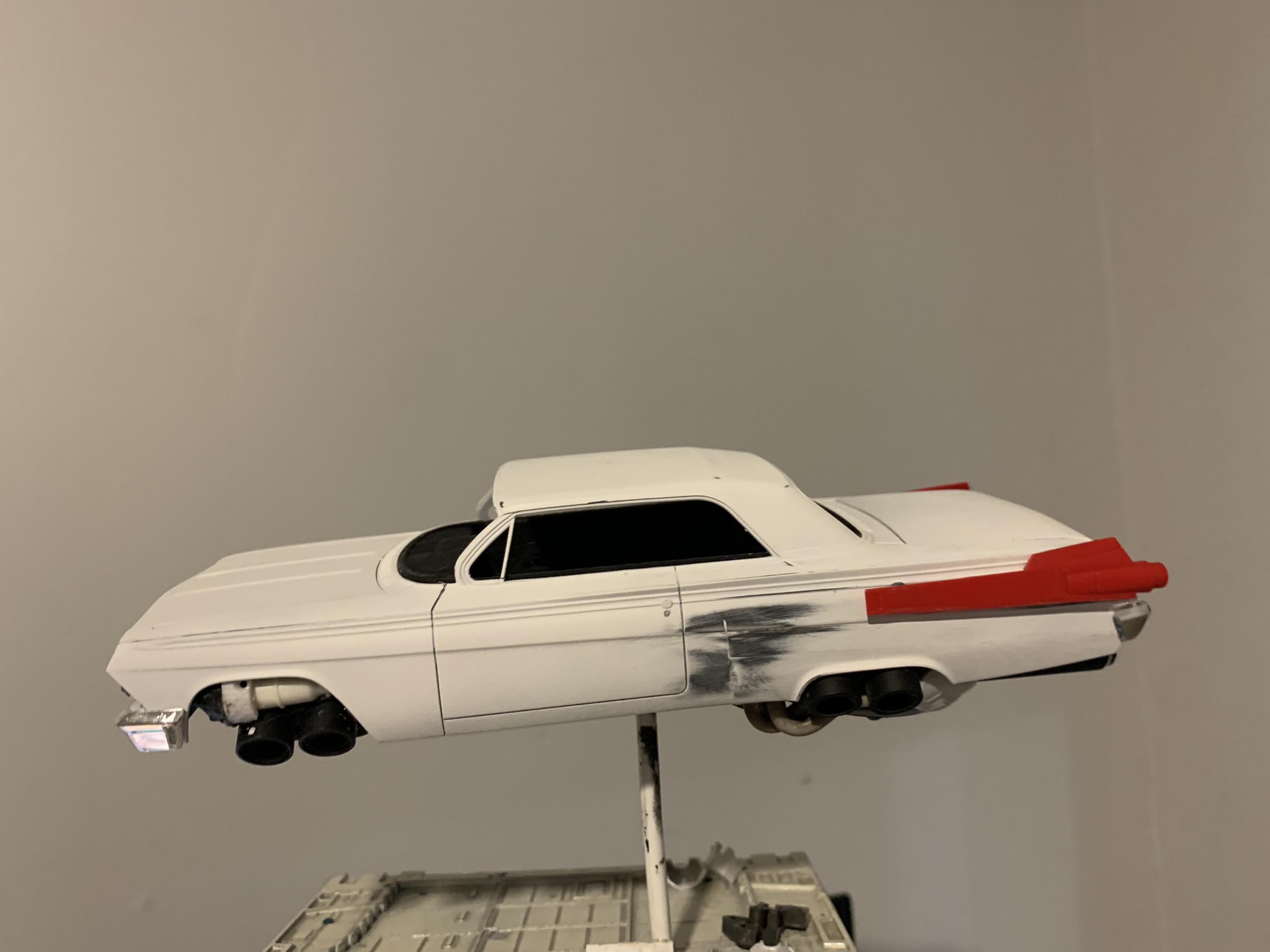 62 Impala jet car. It's been a while since I had to worry about a clean paint job. All of my builds nowadays are weathered. I really enjoyed this. I didn't go to crazy with gadgets. I wanted a clean simple build. I love this color combo!! I'm not a fan of the chrome out of the box. I find that it wears off easily and looks fake. I went with aluminum over the chrome bits. I had painted the trunk lid and got a large dog hair right in the middle. I attempted to sand the imperfection away. Sanded too far through and ended up having to strip and repaint the trunk. It doesn't quite match. This is why I don't do clean paint jobs. ? I have the Kansas City model show coming up next week. I've waited to add the side mirrors until the show. I know they'll fall off like the door handle. I lost the passenger door handle. That's nice to know as I post these photos.............. As usual. Plenty of Gundam parts and styrene tube used in making the mechanical details. I suggest if you want to try to build one of these....get a few cheap Gundam kits. That's where I get 80% of my detail pieces from. Most of the exhaust tubes are 3/8 - 7/16 Styrene tube. Thanks for looking!!!!!