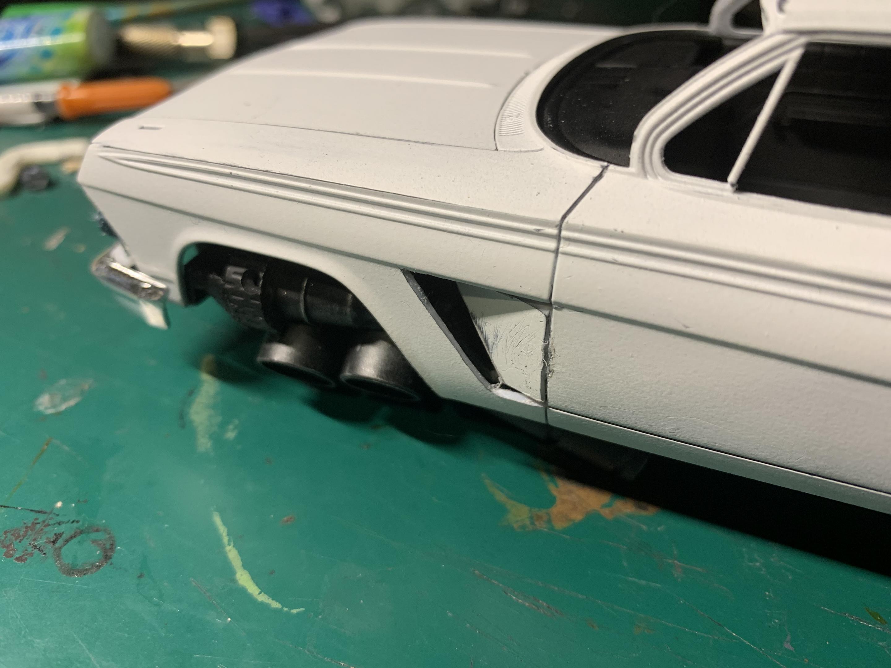 I appreciate the wonderful comments! Thank you all for taking the time to say something nice. I truly enjoy building these vehicles. Thanks Jonathan! I agree 100%. I have the Kansas City model show coming up in just a few days. I had intentionally left off the side mirrors and 1 antenna. I figured they wouldn't stay glued on. I'll be attaching them right before the show. As you can see in the photos I have already lost one of the door handles. And since I took these photos, I have since lost the hood emblem. Both lost to the abyss that is known as the floor.....a place where things seem to just vanish without a trace. Here's some more photos. This is the first build that I didn't put in the Work in Progress part of the forums. I had computer issues and was not able to upload photos. All fixed now. The rear wheel arches came up a little high showing off too much of the mechanical parts. I was going fora lowrider look, so I did some cutting of the rear panels. I scored the line right at the detail that runs down the side of the car. I added about a 1/4 inch of Styrene to the top of the panels that I removed, then reinstalled in the new position.