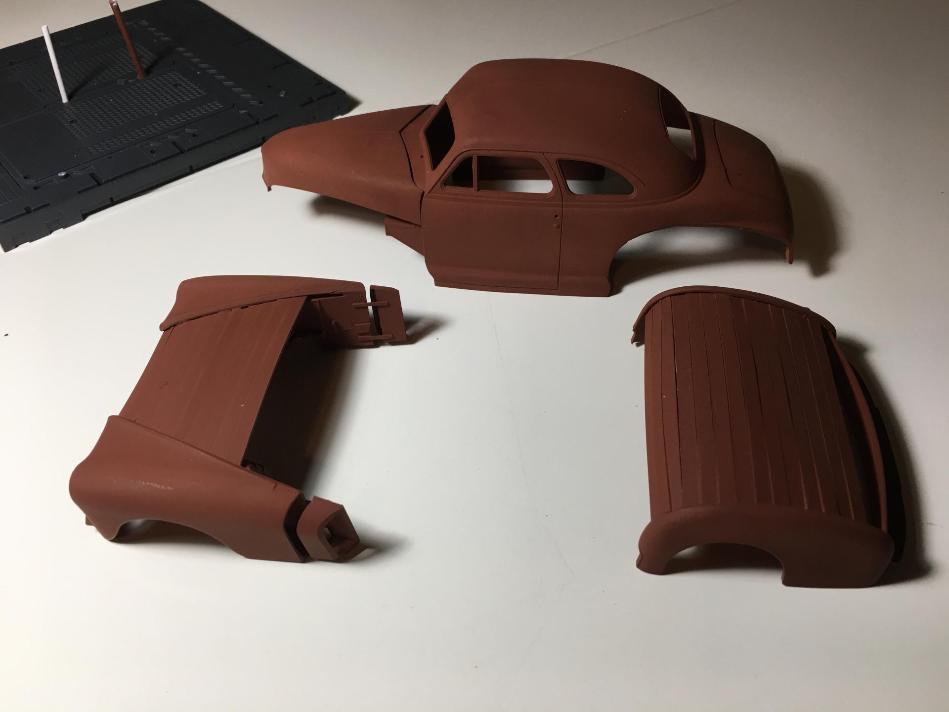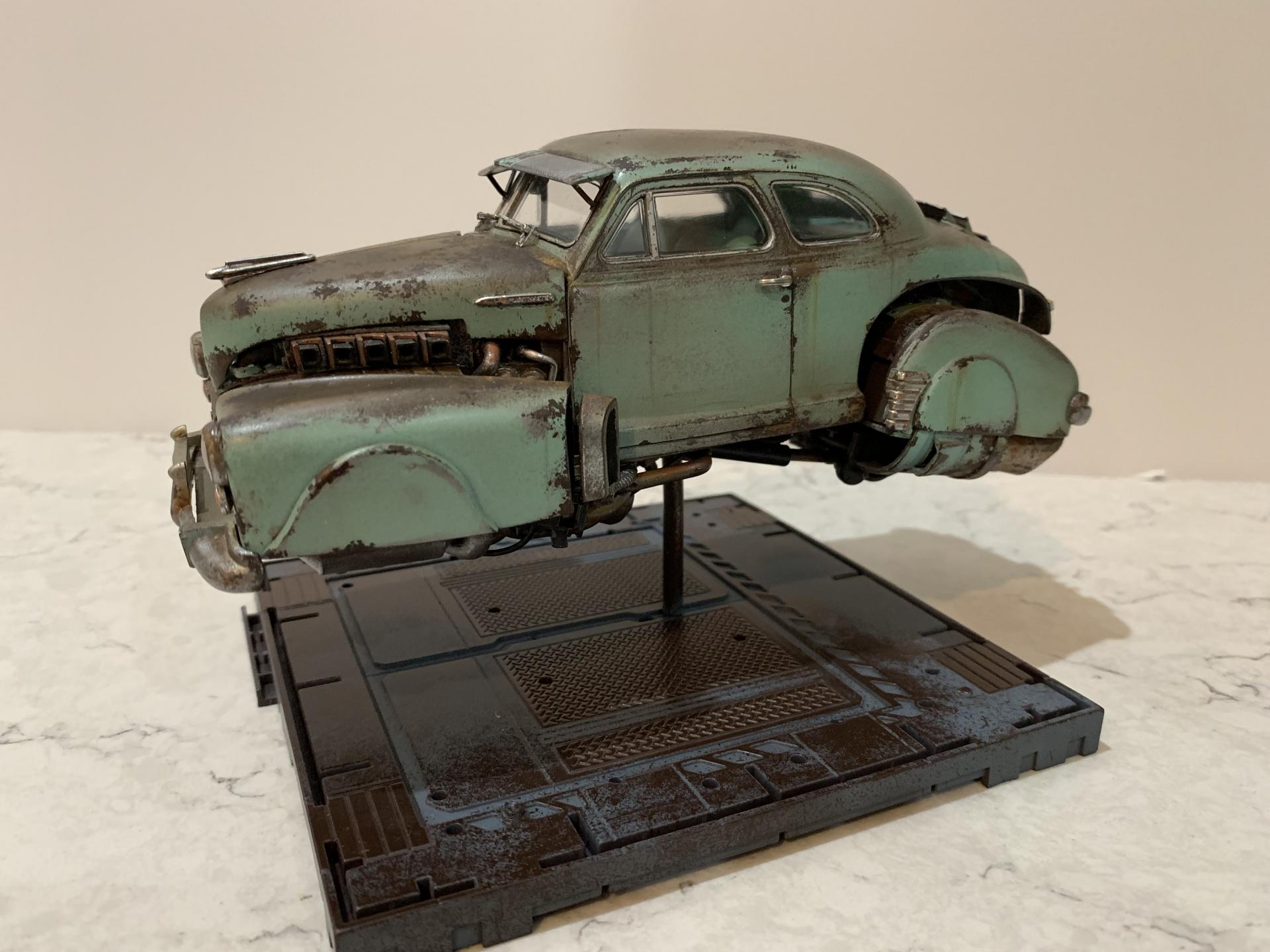 I experimented with a contrasting color for the base. I love the way the paint chipping turned out. Unfortunately, I don't like the red against the blue car. I added rust highlights. Still much more to do on the weathering. I plan to hit it with some more highlights as well as streaks. I want the engine bay to have grease and oil stains. Can't forget the layers of soot! I'm happy with these front intakes behind the headlights. They're a little too thick, so I plan to bevel the edges down. The hood has a problem fitting when the car is hovering on it's stand. The chassis flexes and the hood won't sit properly. Hopefully this gets fixed when I final glue the model. The shot below is my favorite part of the car. There's a lot going on with pipes. I want to add more to fill in the dark gap. I'm also not 100% happy with the exhausts on the front fenders. They're a bit too thick as well. I may change these. This will be oily and greasy. A better view of the plumbing. I will add a lever or two from the floor for flight controls. I had to cut part of the rear seat out to make room for the rear engine. I had nothing to cover the hole with, so I added another intake. Why not? I hope to add more detail to the undercarriage. More smaller gauge hoses and pipes. It's close to being done. I work so slow that it might take a few more weeks. I need to start putting on the final chrome pieces, like the mirrors and trim. I need to finish weathering the exterior as well as the interior. I need to make flight controls. Final plumbing. Repaint the base. Install the glass...then it should be done.