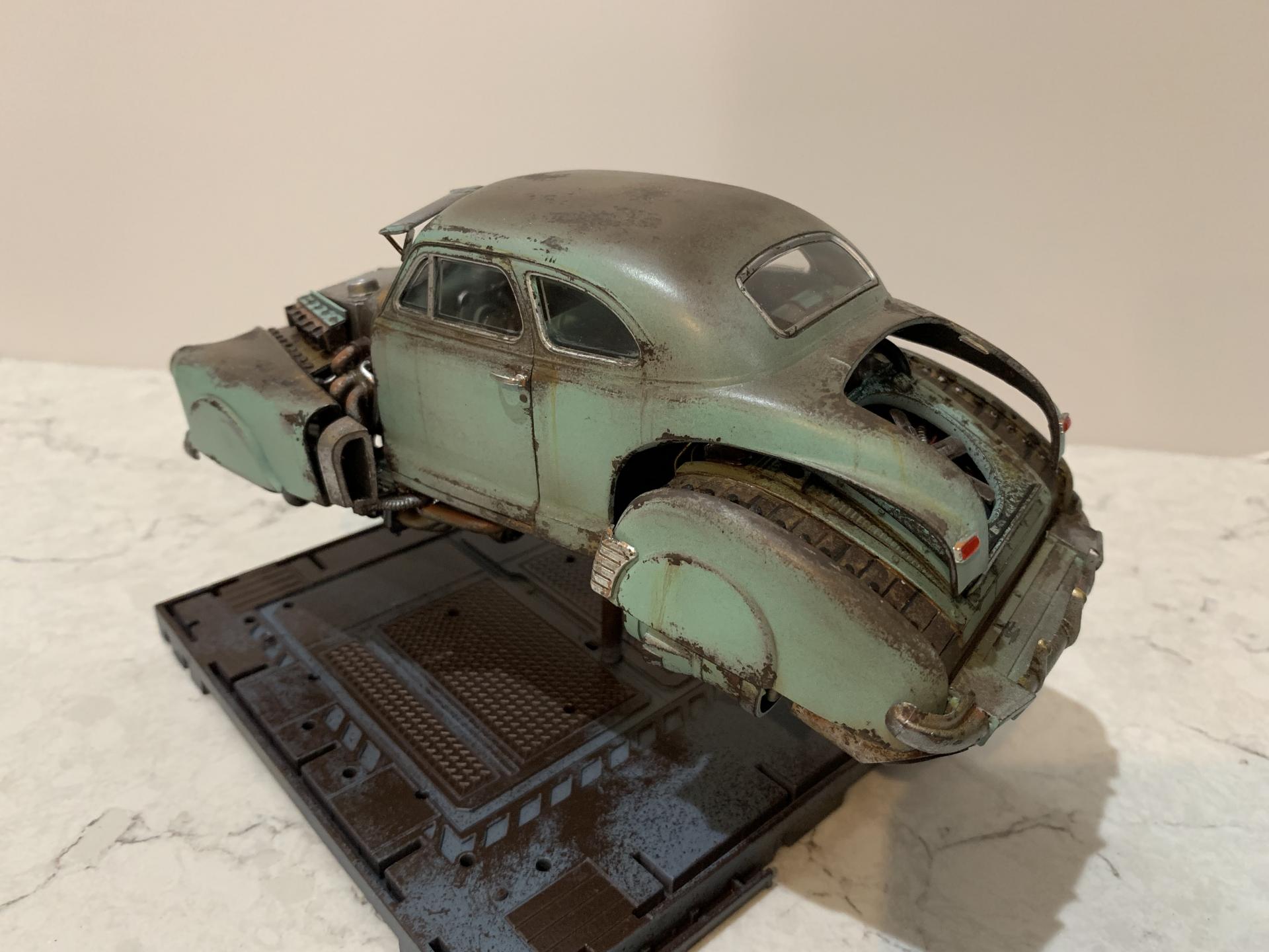 I finished my 5th Jet Car today. This was a great model kit to build. I knew when I first picked up the box that it would be a great car to turn into a hover vehicle.There's lots of scratch build items throughout. There's probably half a Gundam model worth of parts on the undercarriage (thanks to my son who donated 2 Gundam kits for this project). All of the pipes and hoses are solid styrene rod bent with heat. The rear fenders/turbines are hinged and pivot downward slightly. Someone forgot to weather the base of the antennae......... I accidentally cracked the rear window last night while trying to rub fingerprints off of it. I'm so upset with myself. Luckily the car is weathered and it doesn't stand out too badly. I hope.. The large landing lights were added last week. Very happy with the results. Here's a good view of the undercarriage. I also painted the window weather stripping black. It really added some good detail. Thank you for looking!!