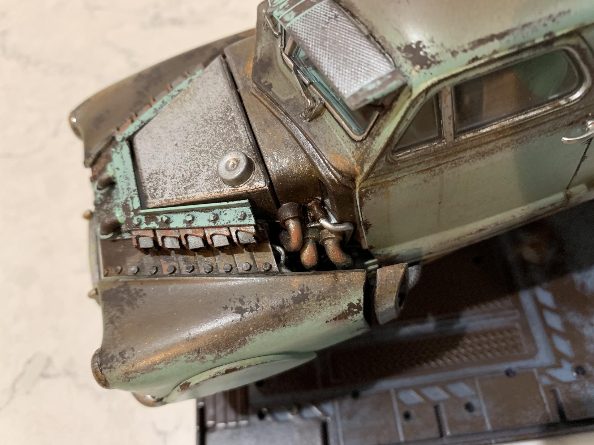 I changed the fin design that was under the edge of the hood. It was causing fitment issues that I couldn't repair. I added some pipes and a few more gadgets sticking thru the side. The hood now rests better, although not in these photos evidently... Need to add more soot and rust highlights. I also need to even up the weathering on the chrome and paint the chrome strip above the door handle. I should have done that already! I plan to add 2 - 4 spotlights under the car. Hopefully I'll be done by next weekend.