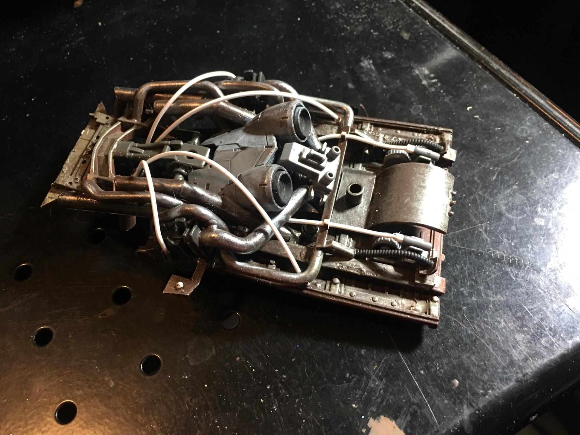 I thought I'd be done this weekend. I wasn't happy with the hood fitment and the pipes coming out of either side, so I started again. I needed something to hold the hood level, and something to bring a little more style to the front end. I fabricated some new heavy steel ports made from square styrene tube. They remind me of the exhaust coming off the side of World War 2 planes. I'm very happy with these. I think it needed the detail and it needed to look more mechanical than just pipes. They don't serve a purpose other than to look cool. I also added two more pipes inside the fender gap. The more the merrier. I have more weathering to do. Not finished yet. I may still add lights to the undercarriage. Landing spotlights of some sort. I removed the visor supports and replaced them with much thinner styrene rod. Details under the hood.