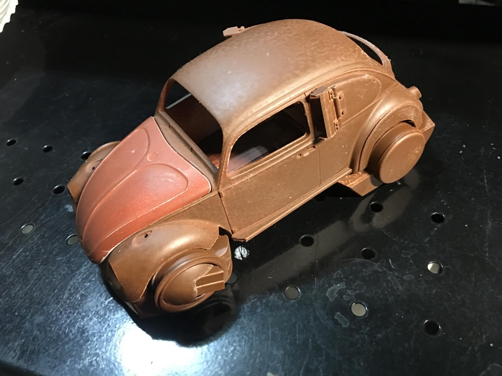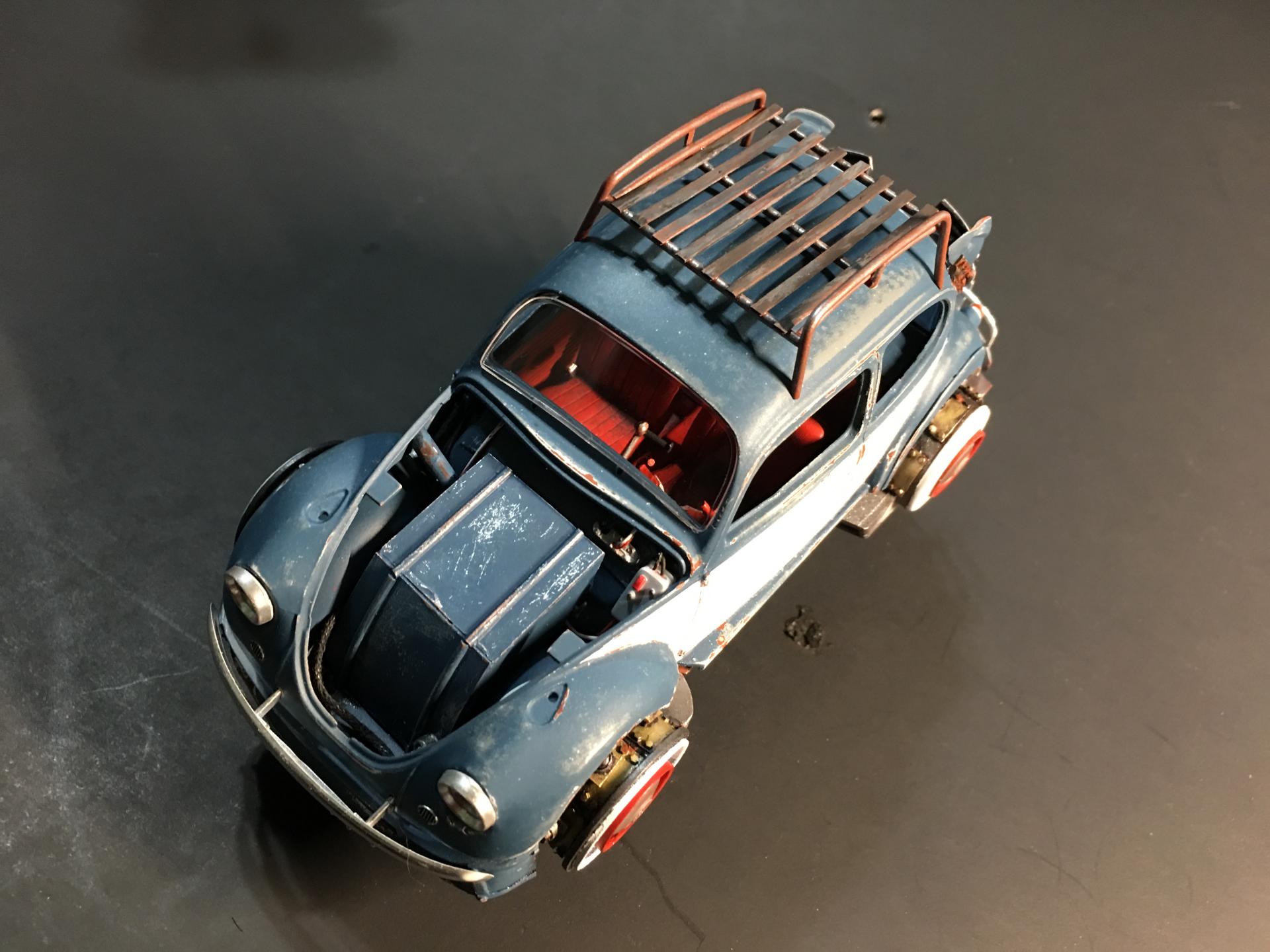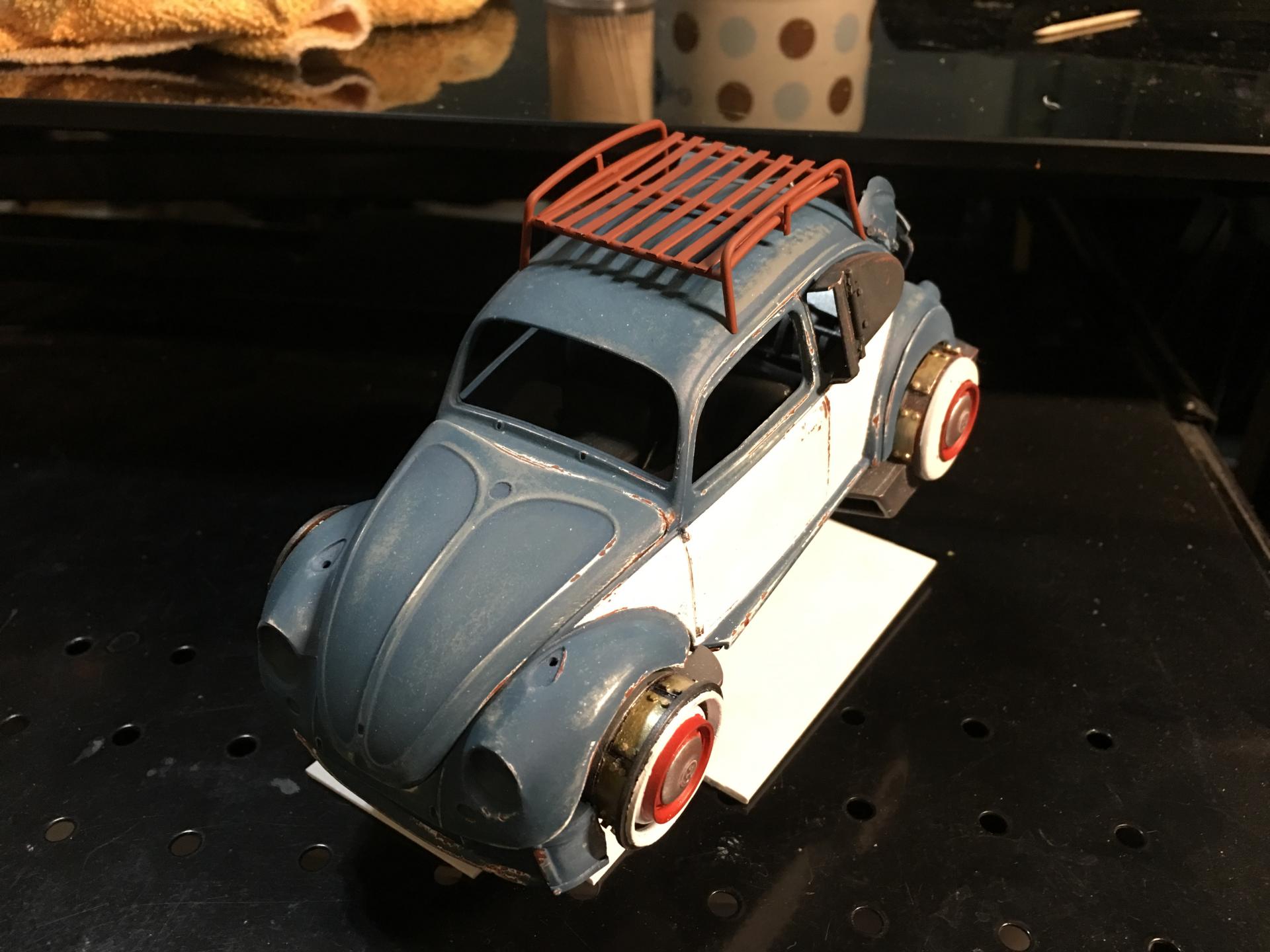I started using Vallejo Acrylics 2-3 years ago. They're perfect for people like me who have no patience to wait for enamels to dry. I can airbrush a part and be handling it within a few minutes. The VW has been sanded with 400 grit. I applied some color to the roof rack.