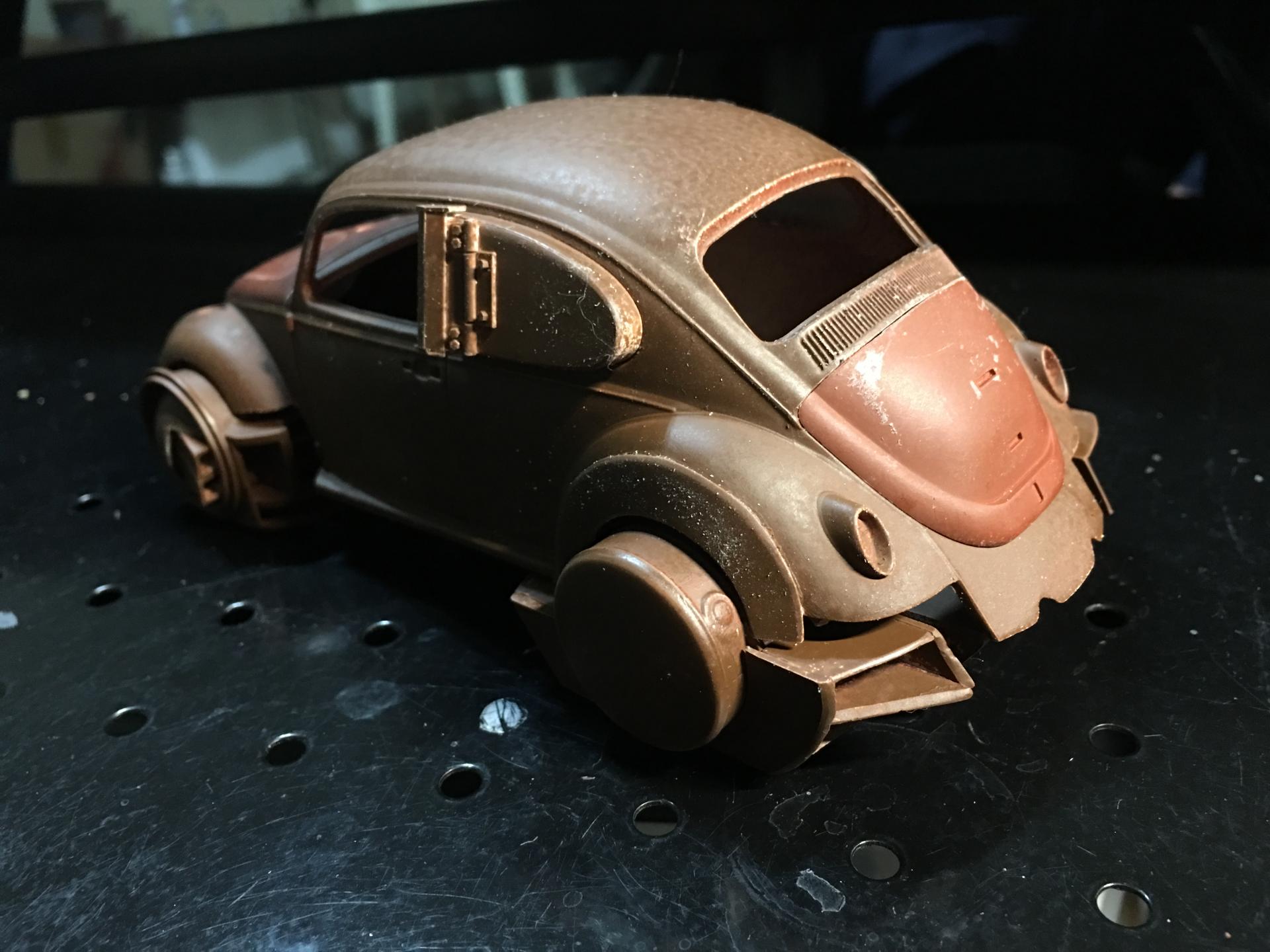 I thought about the race car theme for the past few weeks. I wasn't confident enough to try race style graphics and decals. I just couldn't come up with anything that worked with the rounded shape of the Beetle. So it went from this: To this: I'm going to paint the rims bright red, leaving the center caps chrome. Probably going to add some weathering. Not a ton. I want it to look like it's used.
