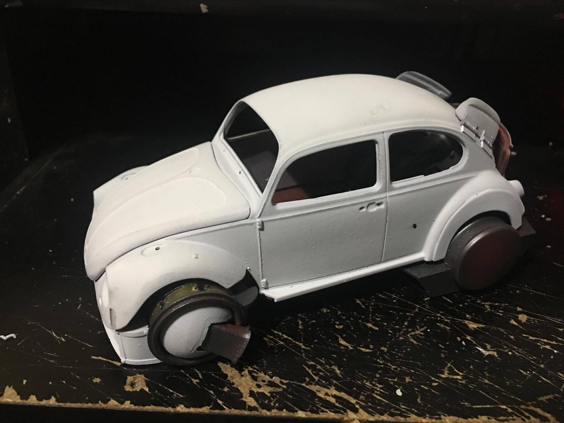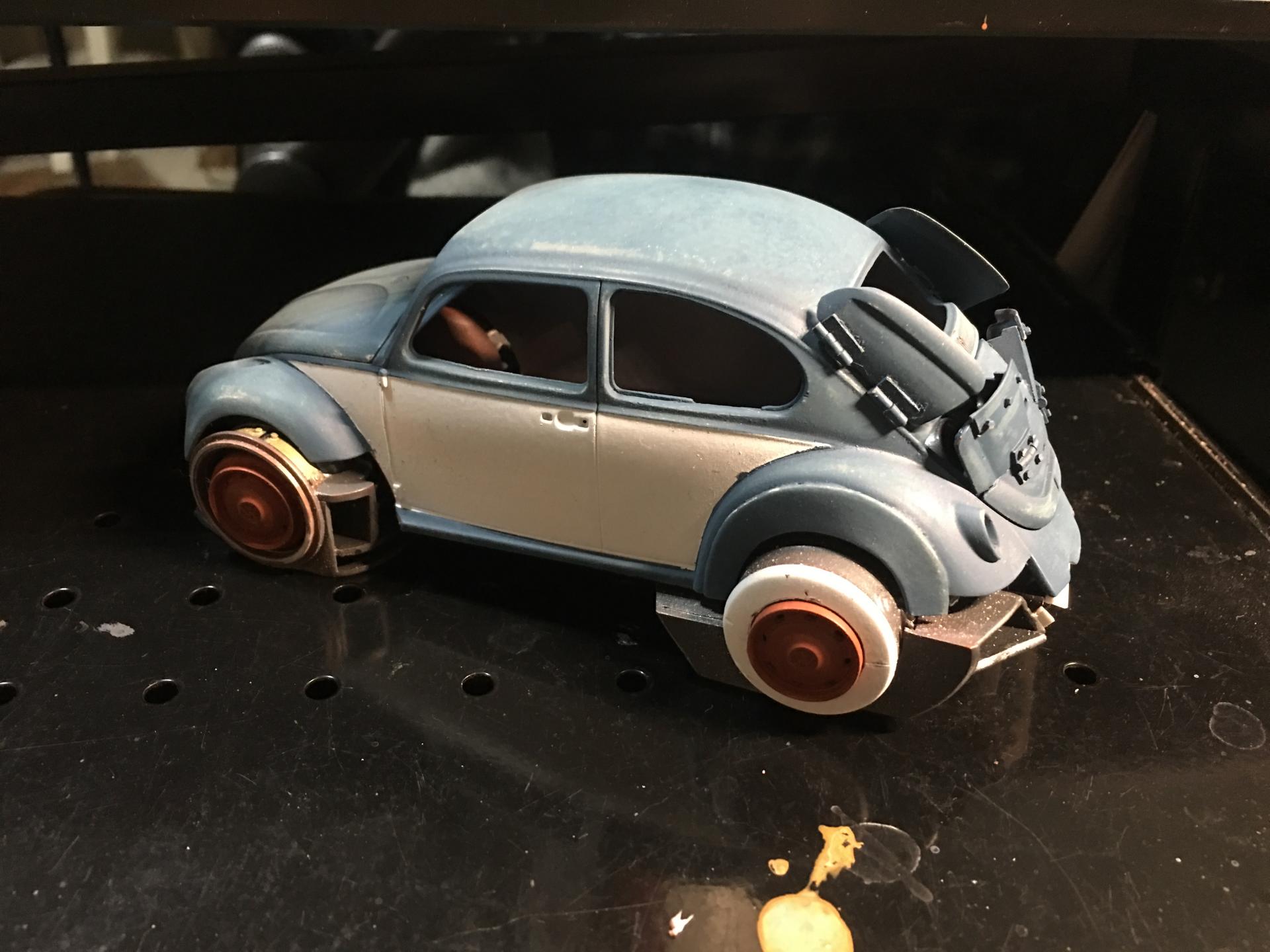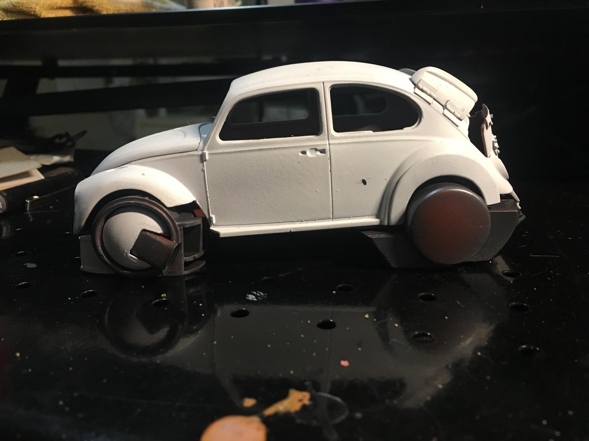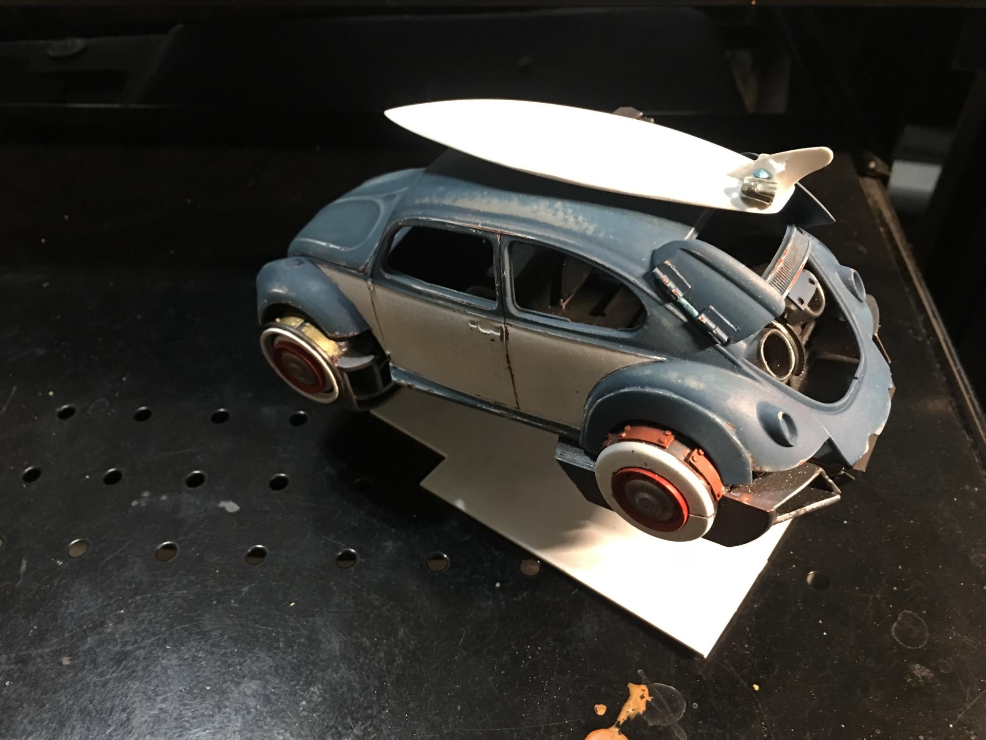 I started another hover car. It needs a clever name. I'm all ears if anyone has a good suggestion. Vintage 68 Hover Bug........ This started out as a hover race craft. I envisioned bright graphics like you'd see on a formula 1. If you guys have seen any of my other posts, you'll know that my finished models usually look quite a bit different than what I begin with. Styrene shavings and cat hair for that " just finished a race look" I added some fins on the top, cut from another VW Bug's rear trunk lid. I wanted it to have a lowered stance while in flight. I had pictured a black, white and red racing graphics with racing numbers and sponsor decals. I imagined it as if it had just finished a race. Heavy soot from the turbines. Grease and oil on the engines. Maybe a little damage from other hover race craft. The fins on the top, direct air into the rear engine cover via hinged vents. I remember as a teenager, the cool VW Bugs at my high school always had their rear hood lifted for air cooling. Similar thing here, except the vents lead to some massive air intakes on the back of the engines. I got stalled at this point on the graphics and decals. I spent weeks trying to come up with race style graphics. Was I going to use decals? How am I going to get good paint lines with multiple colors? This was all out of my zone. So I started looking into vintage style...... I'll be painting the inner rims bright red. The center caps will be chrome. The front will have white painted similar to the rear white walls. I will be weathering it. It's a daily flier! Slight rust. Slight paint fade. Dirt in the crevasses. Soot. Good stuff.