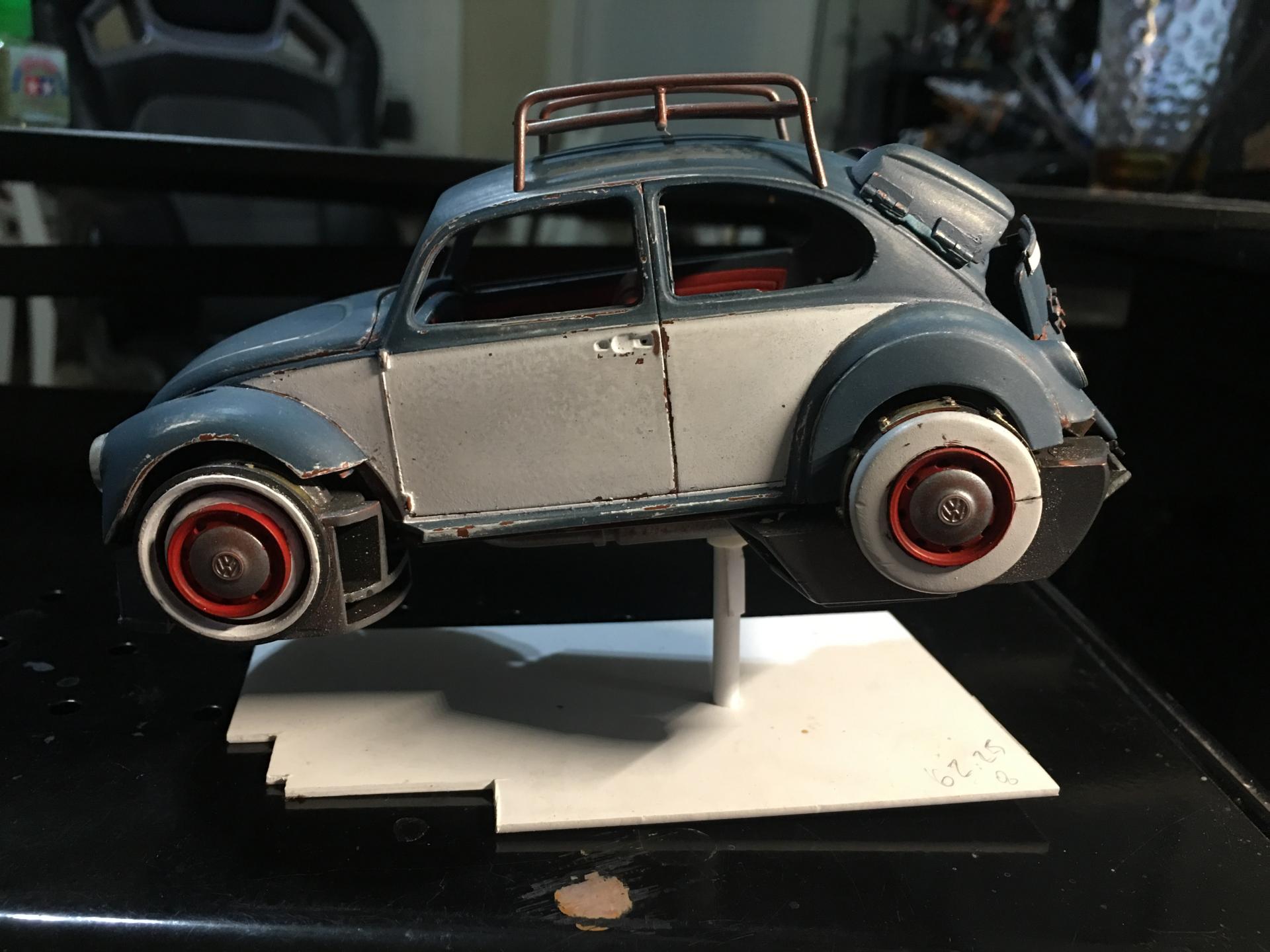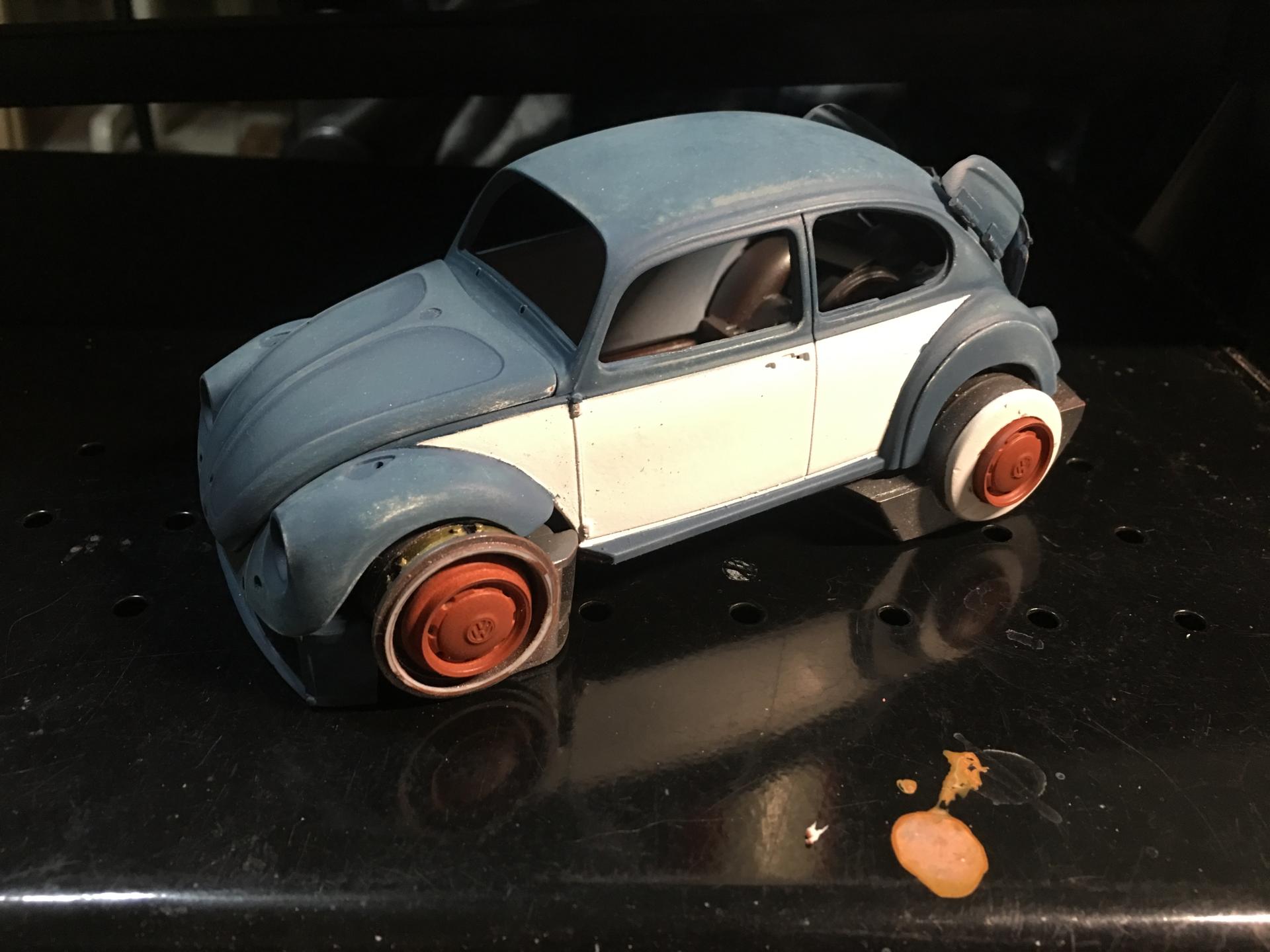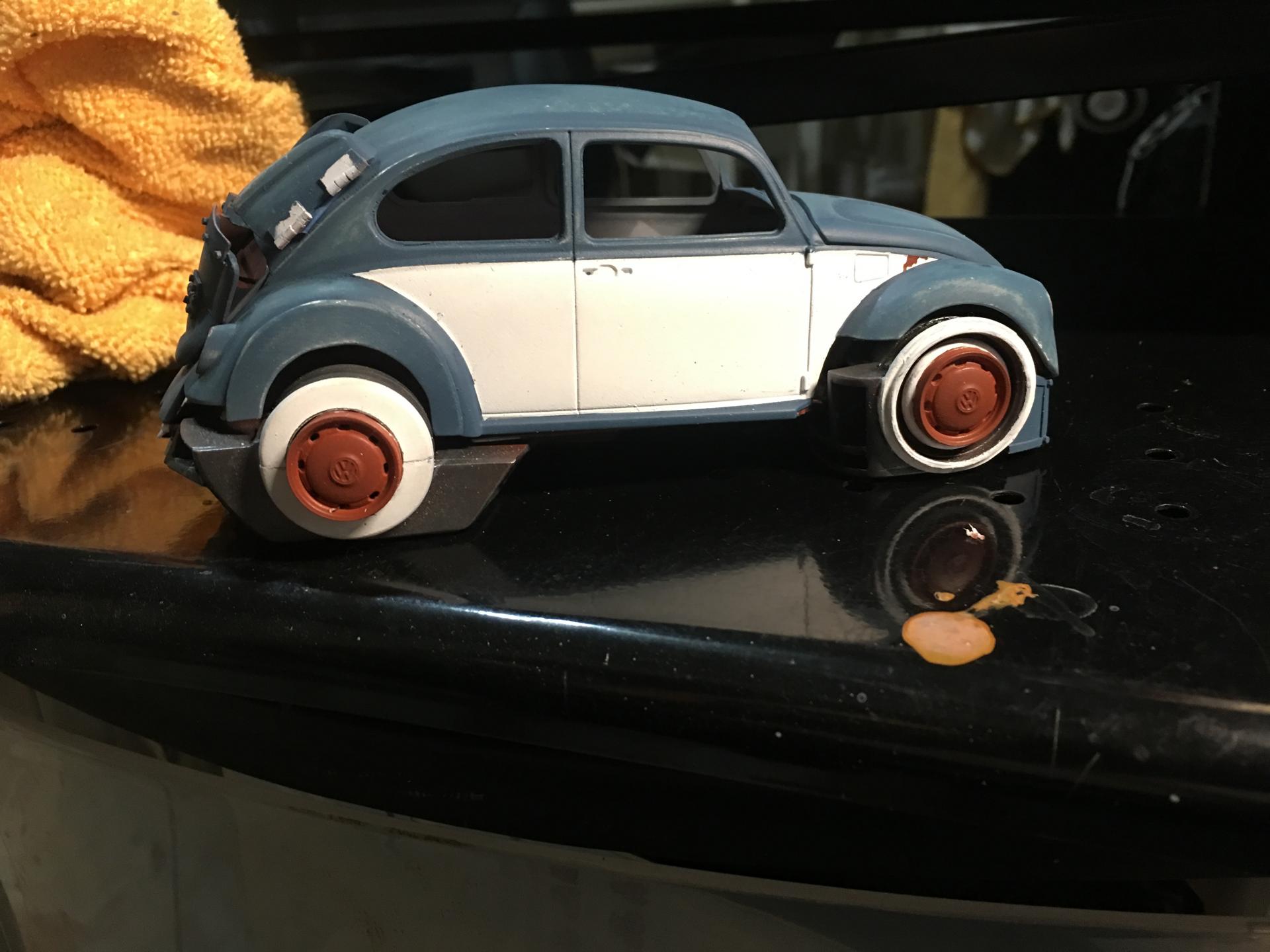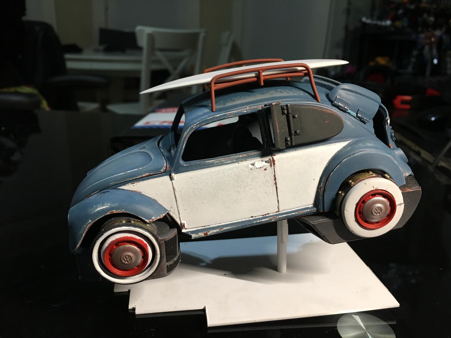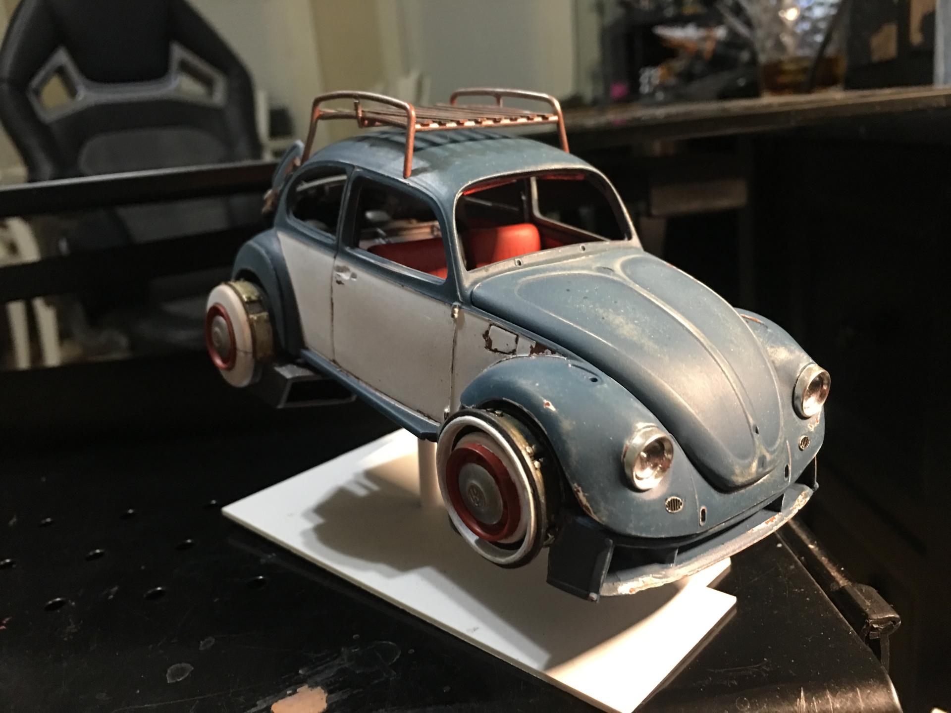 I started another hover car. It needs a clever name. I'm all ears if anyone has a good suggestion. Vintage 68 Hover Bug........ This started out as a hover race craft. I envisioned bright graphics like you'd see on a formula 1. If you guys have seen any of my other posts, you'll know that my finished models usually look quite a bit different than what I begin with. Styrene shavings and cat hair for that " just finished a race look" I added some fins on the top, cut from another VW Bug's rear trunk lid. I wanted it to have a lowered stance while in flight. I had pictured a black, white and red racing graphics with racing numbers and sponsor decals. I imagined it as if it had just finished a race. Heavy soot from the turbines. Grease and oil on the engines. Maybe a little damage from other hover race craft. The fins on the top, direct air into the rear engine cover via hinged vents. I remember as a teenager, the cool VW Bugs at my high school always had their rear hood lifted for air cooling. Similar thing here, except the vents lead to some massive air intakes on the back of the engines. I got stalled at this point on the graphics and decals. I spent weeks trying to come up with race style graphics. Was I going to use decals? How am I going to get good paint lines with multiple colors? This was all out of my zone. So I started looking into vintage style...... I'll be painting the inner rims bright red. The center caps will be chrome. The front will have white painted similar to the rear white walls. I will be weathering it. It's a daily flier! Slight rust. Slight paint fade. Dirt in the crevasses. Soot. Good stuff.