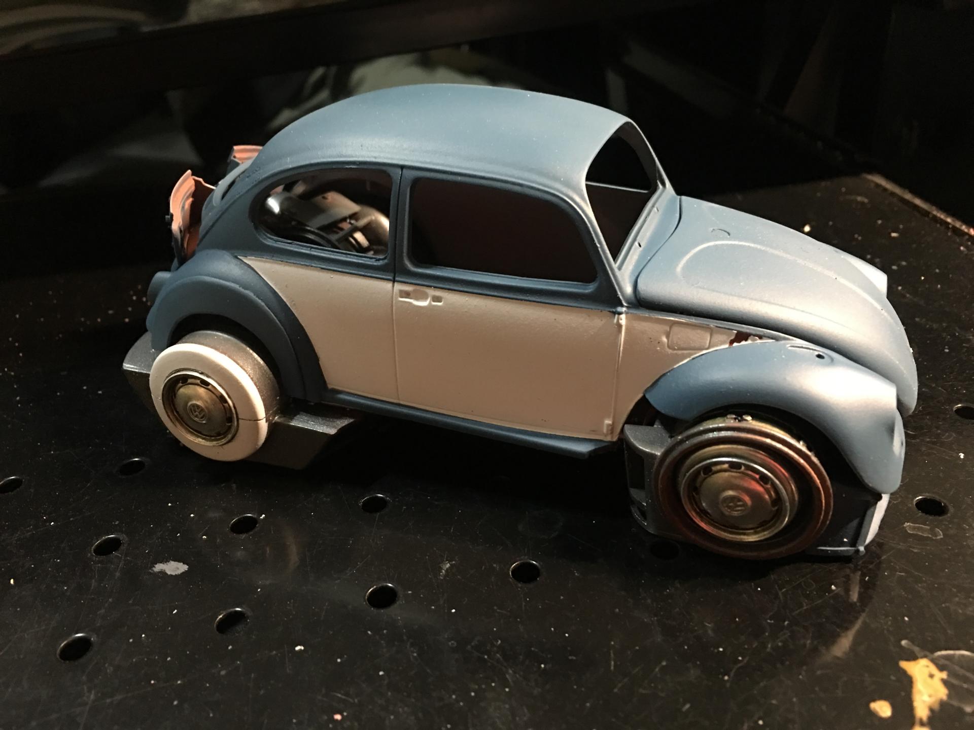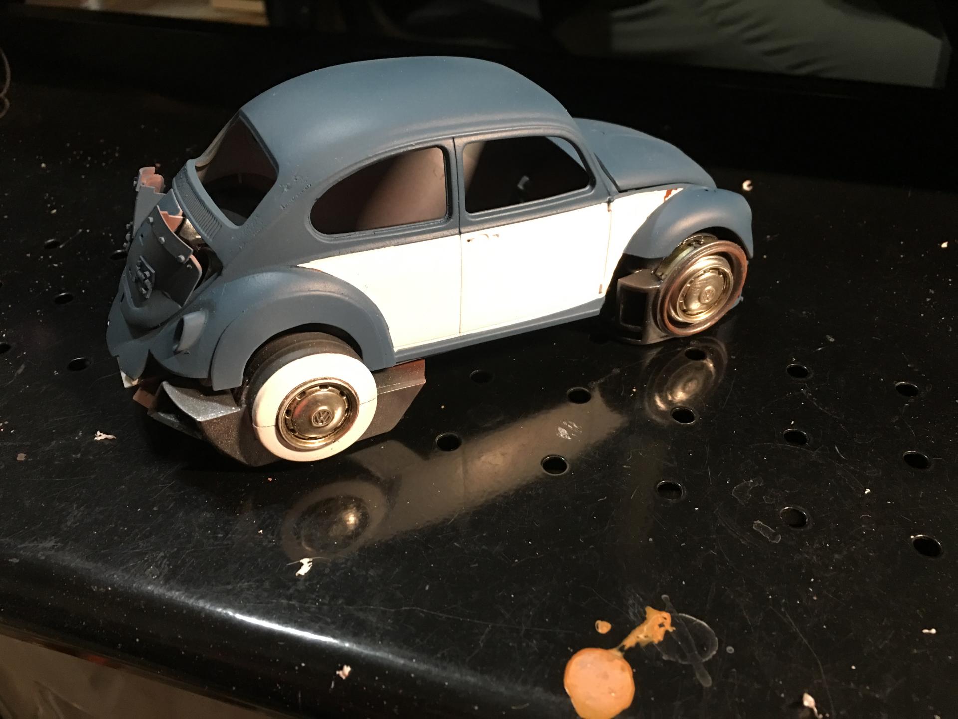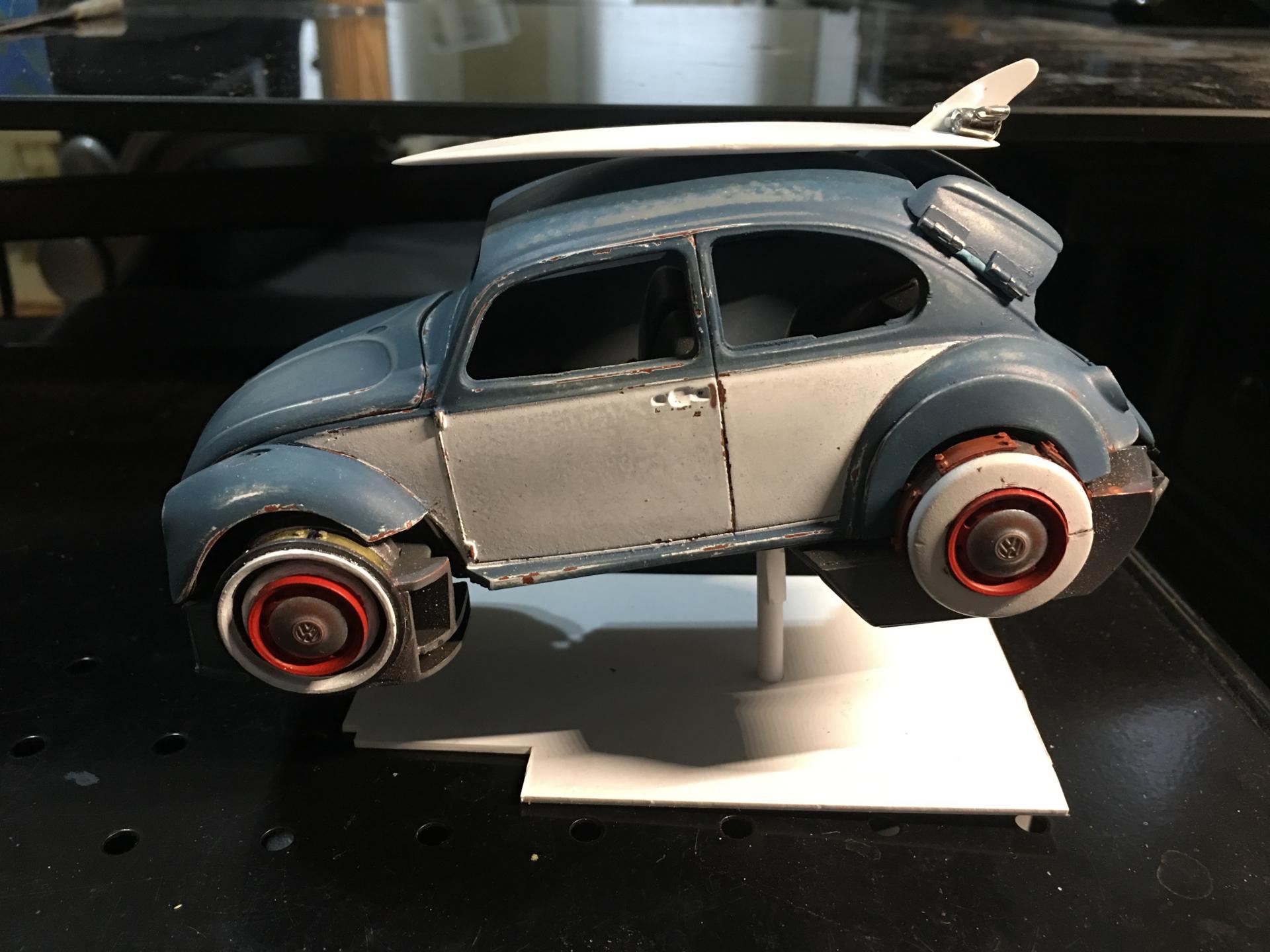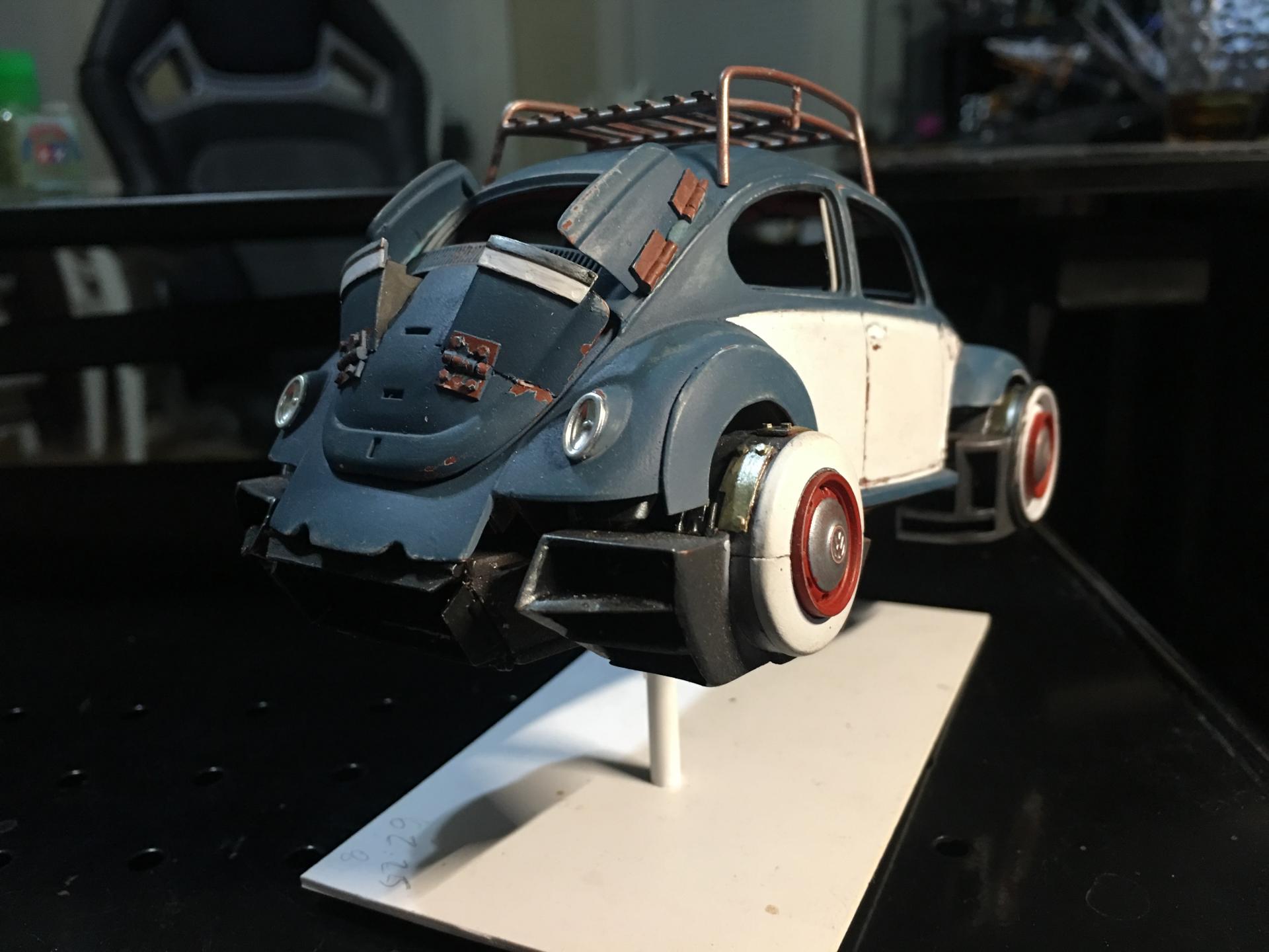 I started another hover car. It needs a clever name. I'm all ears if anyone has a good suggestion. Vintage 68 Hover Bug........ This started out as a hover race craft. I envisioned bright graphics like you'd see on a formula 1. If you guys have seen any of my other posts, you'll know that my finished models usually look quite a bit different than what I begin with. Styrene shavings and cat hair for that " just finished a race look" I added some fins on the top, cut from another VW Bug's rear trunk lid. I wanted it to have a lowered stance while in flight. I had pictured a black, white and red racing graphics with racing numbers and sponsor decals. I imagined it as if it had just finished a race. Heavy soot from the turbines. Grease and oil on the engines. Maybe a little damage from other hover race craft. The fins on the top, direct air into the rear engine cover via hinged vents. I remember as a teenager, the cool VW Bugs at my high school always had their rear hood lifted for air cooling. Similar thing here, except the vents lead to some massive air intakes on the back of the engines. I got stalled at this point on the graphics and decals. I spent weeks trying to come up with race style graphics. Was I going to use decals? How am I going to get good paint lines with multiple colors? This was all out of my zone. So I started looking into vintage style...... I'll be painting the inner rims bright red. The center caps will be chrome. The front will have white painted similar to the rear white walls. I will be weathering it. It's a daily flier! Slight rust. Slight paint fade. Dirt in the crevasses. Soot. Good stuff.