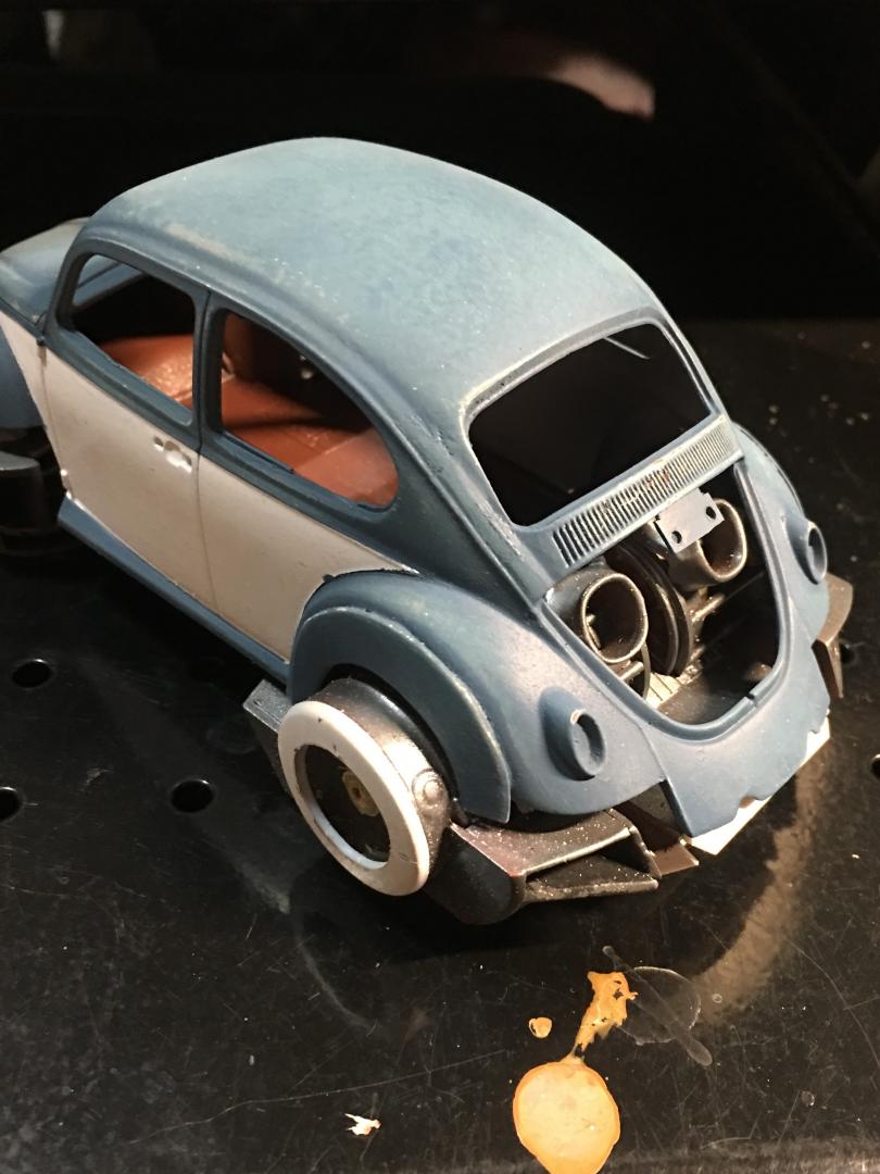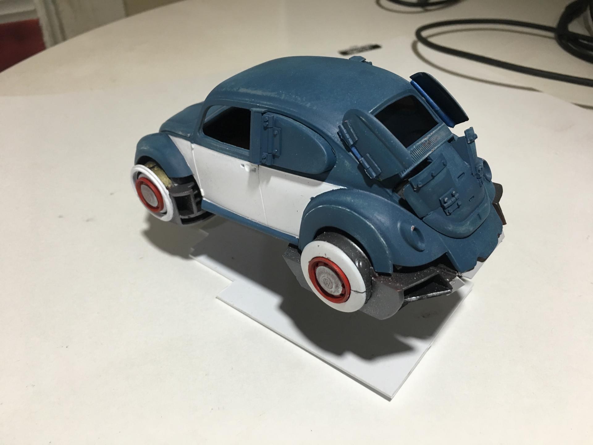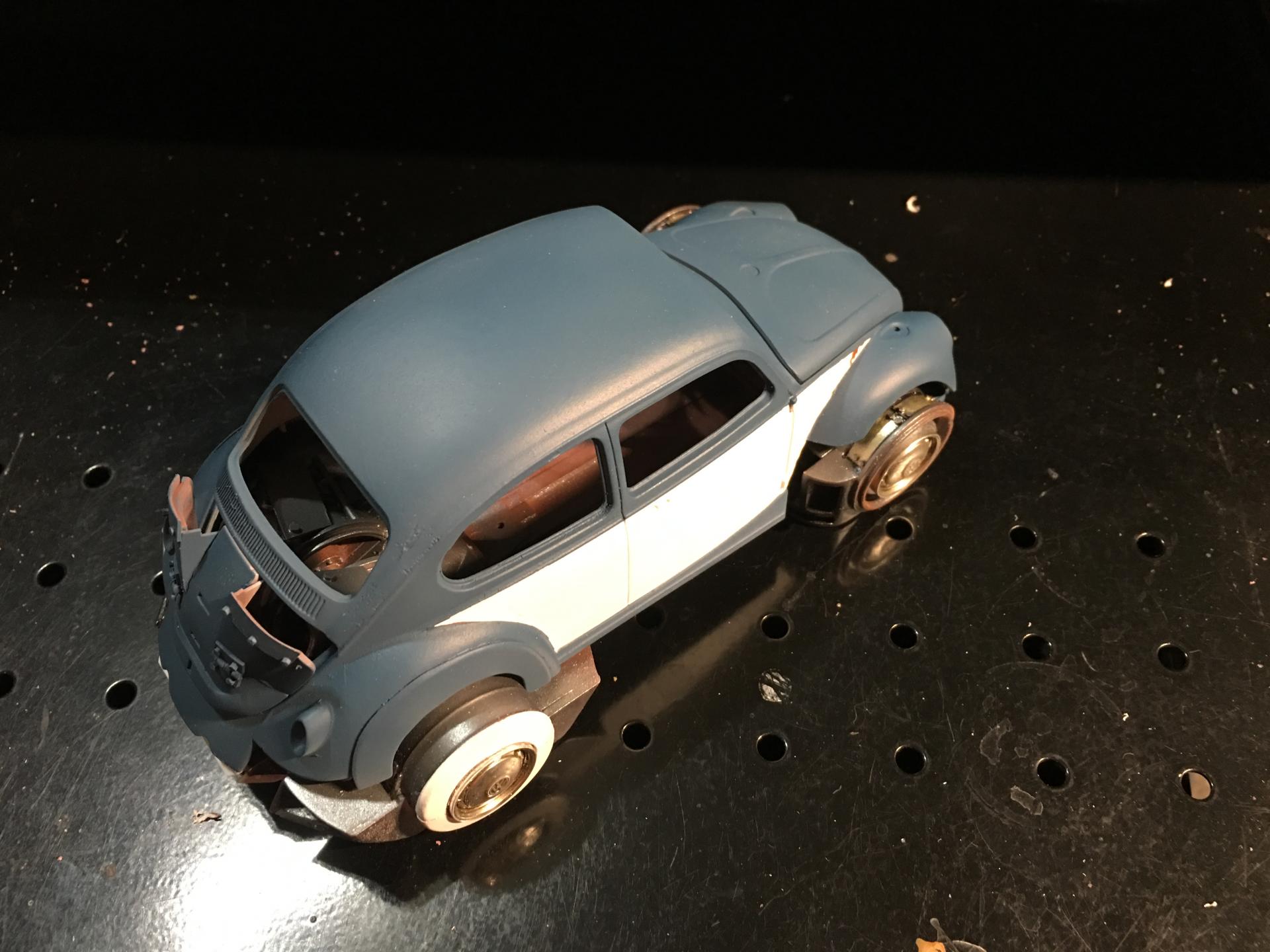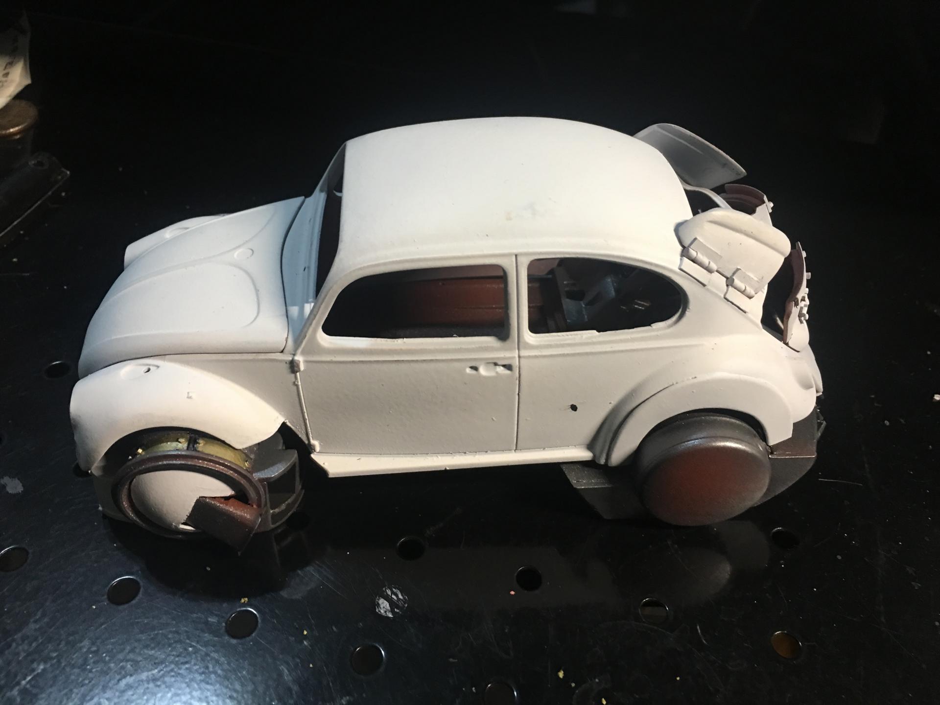 I started another hover car. It needs a clever name. I'm all ears if anyone has a good suggestion. Vintage 68 Hover Bug........ This started out as a hover race craft. I envisioned bright graphics like you'd see on a formula 1. If you guys have seen any of my other posts, you'll know that my finished models usually look quite a bit different than what I begin with. Styrene shavings and cat hair for that " just finished a race look" I added some fins on the top, cut from another VW Bug's rear trunk lid. I wanted it to have a lowered stance while in flight. I had pictured a black, white and red racing graphics with racing numbers and sponsor decals. I imagined it as if it had just finished a race. Heavy soot from the turbines. Grease and oil on the engines. Maybe a little damage from other hover race craft. The fins on the top, direct air into the rear engine cover via hinged vents. I remember as a teenager, the cool VW Bugs at my high school always had their rear hood lifted for air cooling. Similar thing here, except the vents lead to some massive air intakes on the back of the engines. I got stalled at this point on the graphics and decals. I spent weeks trying to come up with race style graphics. Was I going to use decals? How am I going to get good paint lines with multiple colors? This was all out of my zone. So I started looking into vintage style...... I'll be painting the inner rims bright red. The center caps will be chrome. The front will have white painted similar to the rear white walls. I will be weathering it. It's a daily flier! Slight rust. Slight paint fade. Dirt in the crevasses. Soot. Good stuff.