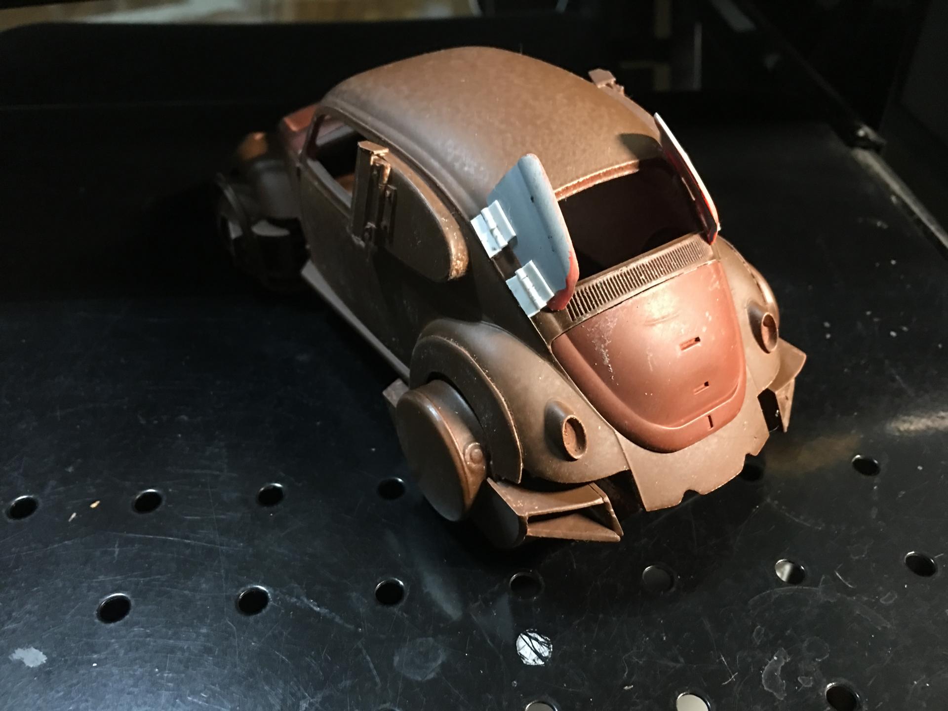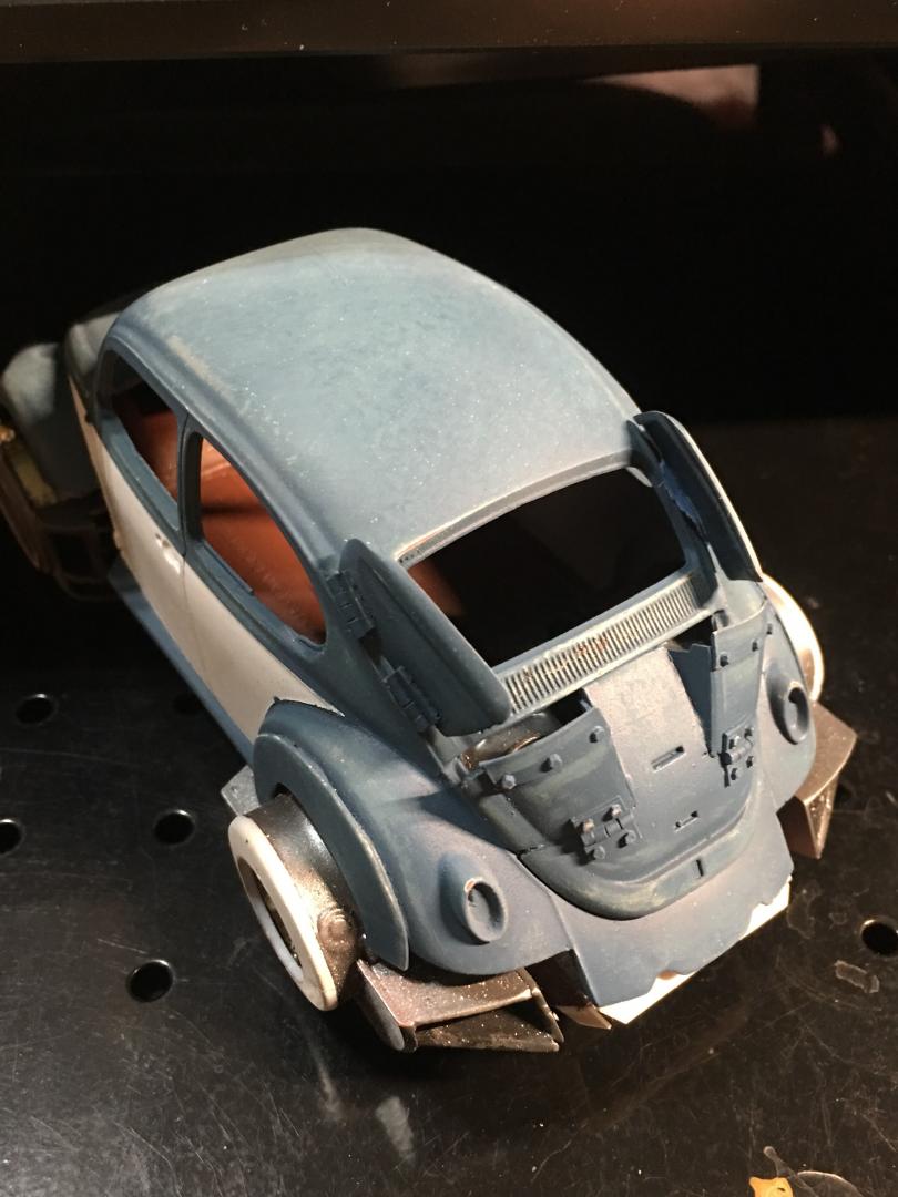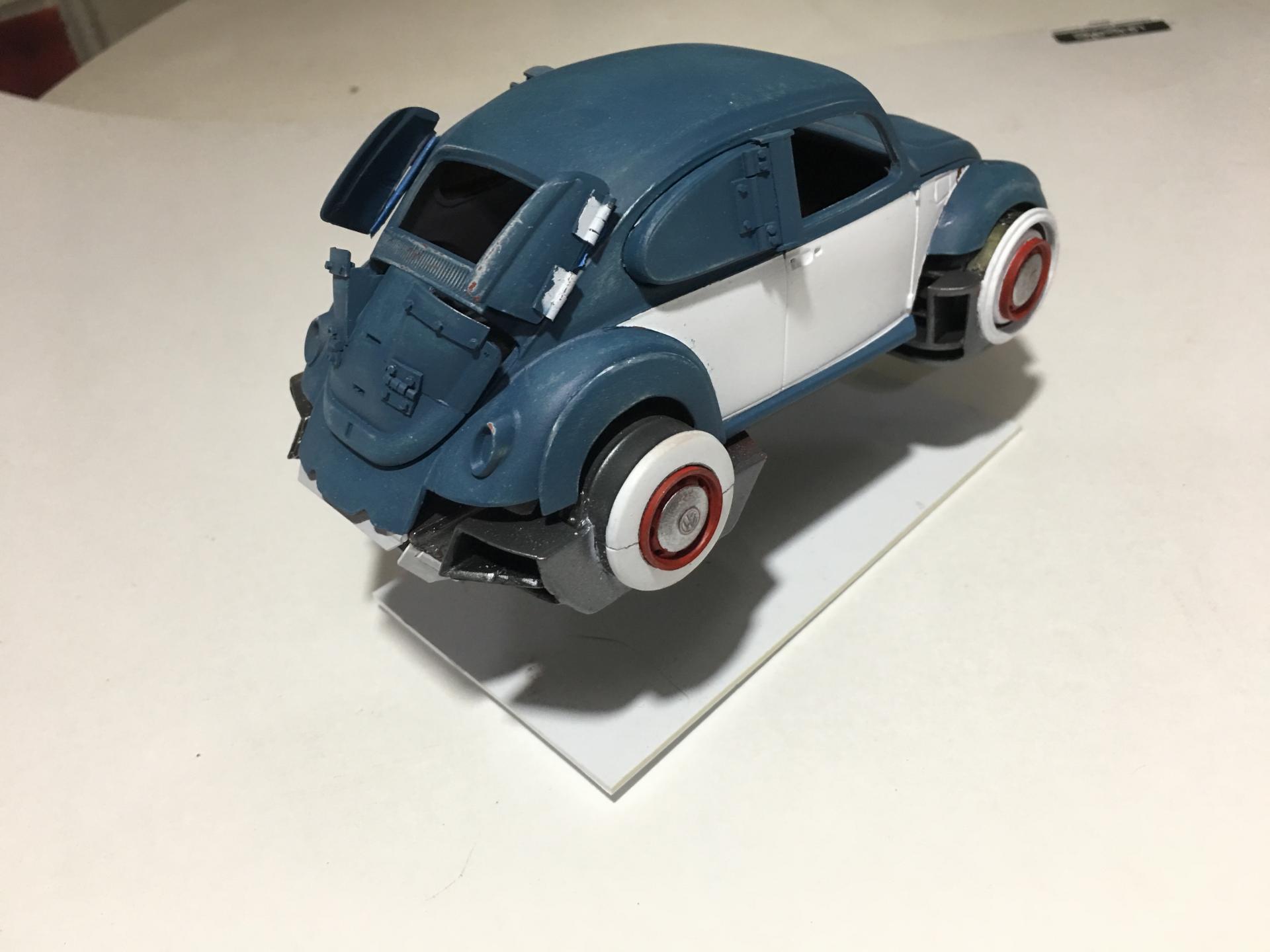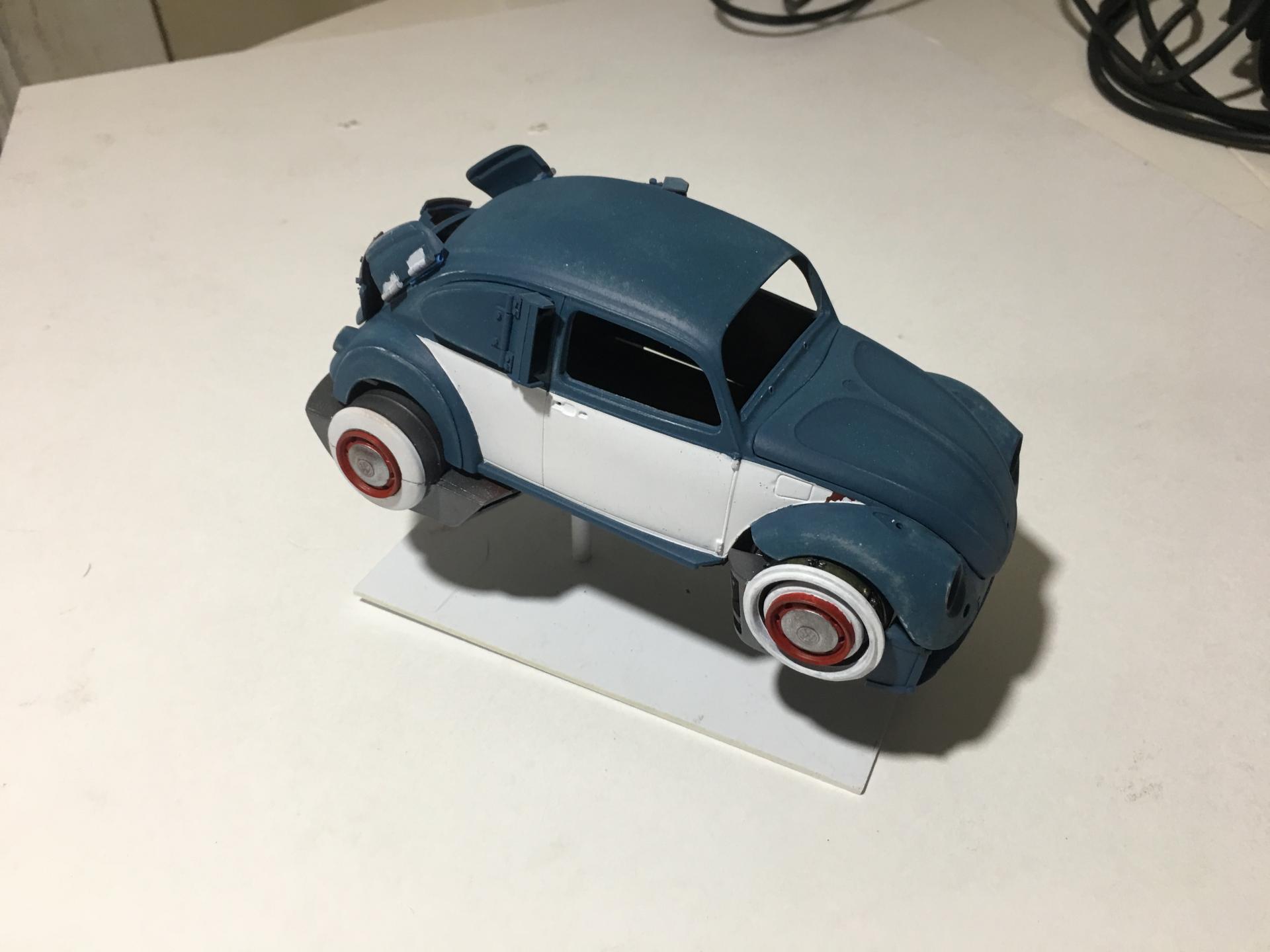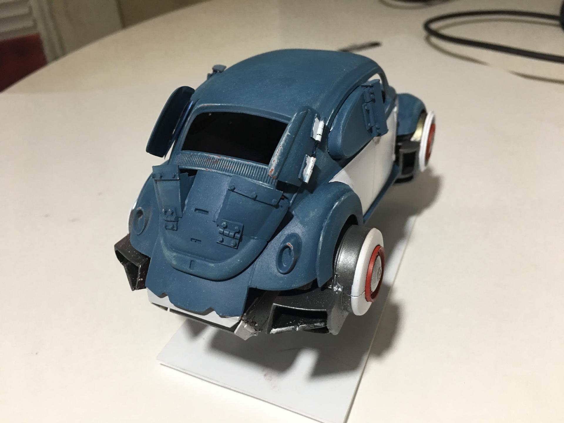 I started another hover car. It needs a clever name. I'm all ears if anyone has a good suggestion. Vintage 68 Hover Bug........ This started out as a hover race craft. I envisioned bright graphics like you'd see on a formula 1. If you guys have seen any of my other posts, you'll know that my finished models usually look quite a bit different than what I begin with. Styrene shavings and cat hair for that " just finished a race look" I added some fins on the top, cut from another VW Bug's rear trunk lid. I wanted it to have a lowered stance while in flight. I had pictured a black, white and red racing graphics with racing numbers and sponsor decals. I imagined it as if it had just finished a race. Heavy soot from the turbines. Grease and oil on the engines. Maybe a little damage from other hover race craft. The fins on the top, direct air into the rear engine cover via hinged vents. I remember as a teenager, the cool VW Bugs at my high school always had their rear hood lifted for air cooling. Similar thing here, except the vents lead to some massive air intakes on the back of the engines. I got stalled at this point on the graphics and decals. I spent weeks trying to come up with race style graphics. Was I going to use decals? How am I going to get good paint lines with multiple colors? This was all out of my zone. So I started looking into vintage style...... I'll be painting the inner rims bright red. The center caps will be chrome. The front will have white painted similar to the rear white walls. I will be weathering it. It's a daily flier! Slight rust. Slight paint fade. Dirt in the crevasses. Soot. Good stuff.