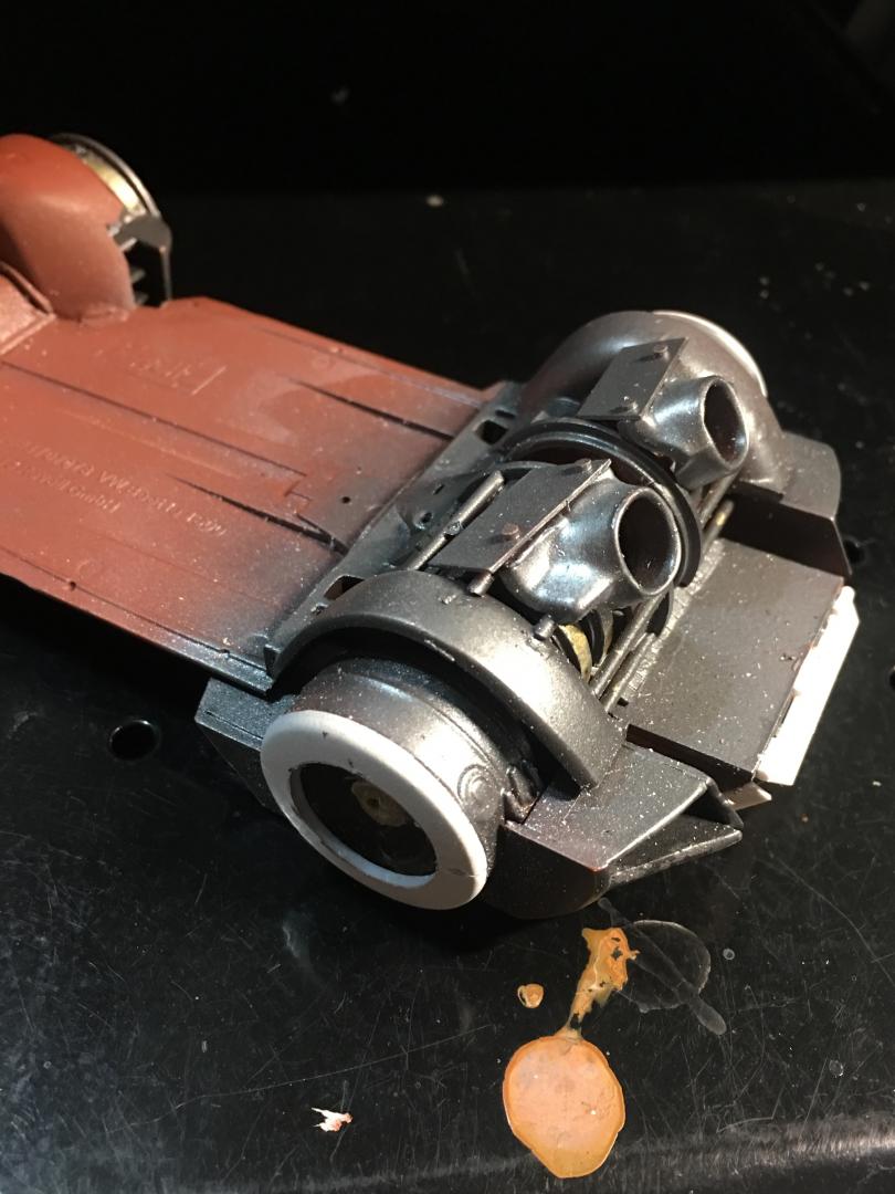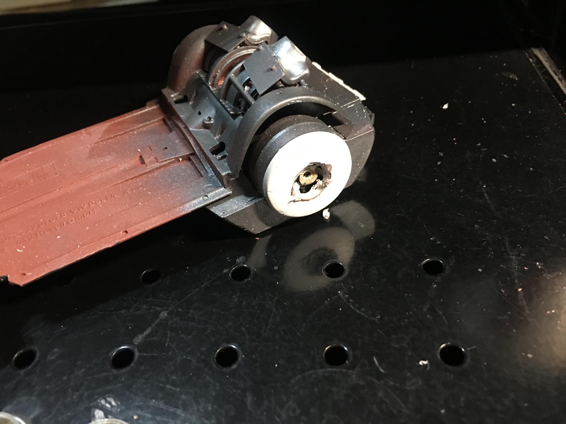 I think I know what you're talking about with the wheel arch. When I took the previous photos, the body wasn't tight against the frame. I took some new photos tonight to show off the interior. The body is a little closer and the wheel arch fits a little better. Working on a fuel tank. I figure it would burn a ton of jet fuel. The stock VW tank isn't going to cut it. I'll add a fuel filler line to the exterior and might try to hinge the fuel door. Lots of hinged things. Still working on these. The rear intakes needed something interesting. I put in two throttle plates. I think they look really cool!! I spend a lot of time putting my models into their final stance. Mocking up what it will look like when complete. I'm sure that you all do the same. A few months ago, my wife brought home some Locktite Fun-Tak mounting tabs. She told me that it looked like something I could use. It works great for temporarily holding on parts that you're not ready to glue. It's holding the rear wings in the photos above. It does leave a residue, but seems to come off easily. Thanks for looking!!!