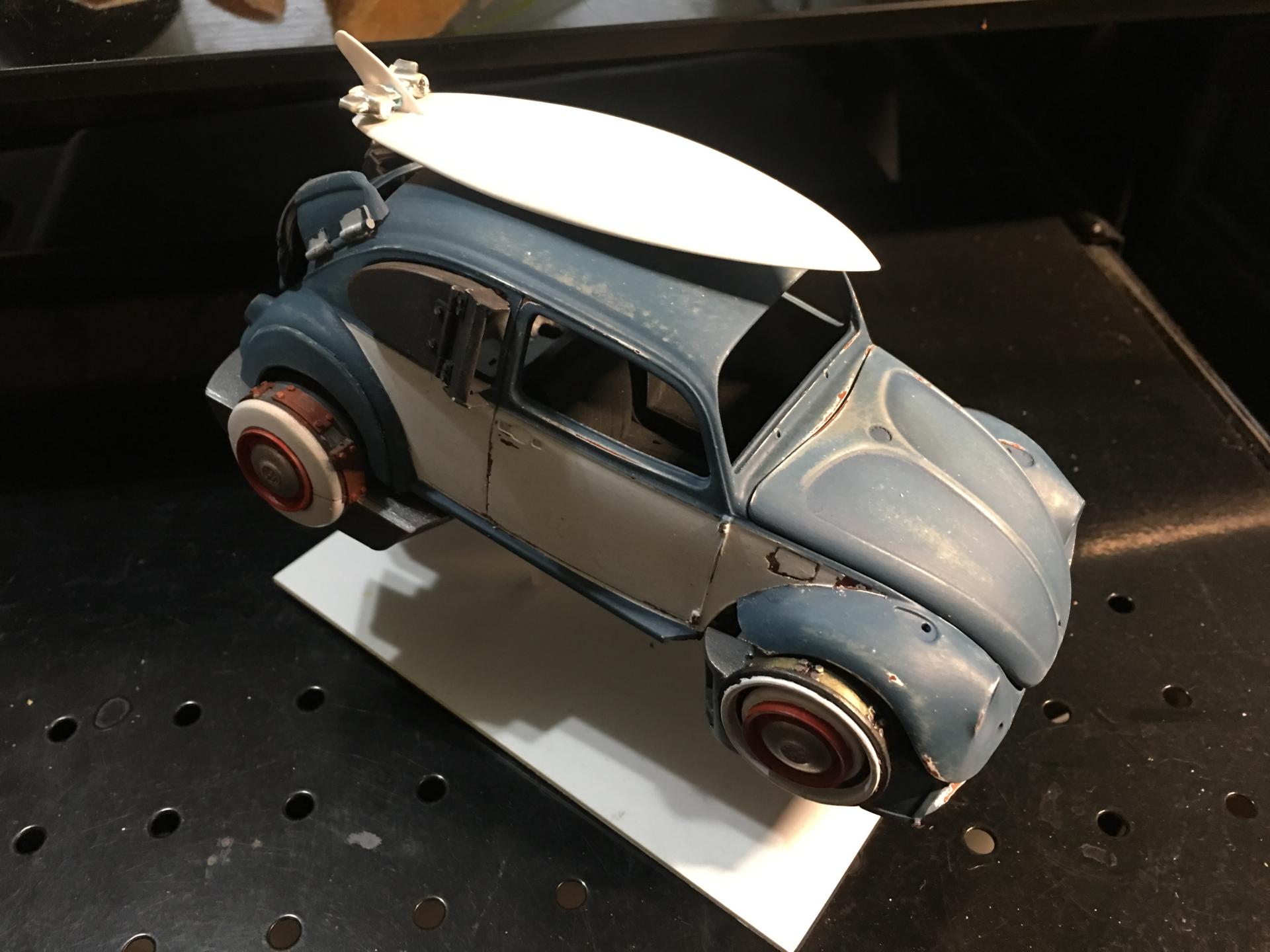 You would be 100% correct! They are the bumper bits from a 59 El Dorado. I knew that bumper would come in handy someday. I have not tried a 2CV. Since the Bug now has a So Cal style, I decided to go a little farther with the theme. What's more So Cal than a surfboard and roof rack? How about a jetboard and roof rack? I started looking up places to buy a 1/24 scale surfboard. Decided it would be quicker to make it myself out of some thick Styrene. Good decision, it didn't take long and turned out fine. I don't know what I'll be using for the Jetboard's turbines, but I've got some temporary thrusters in these photos. I need to buy some smaller diameter Styrene rod to start the roof rack. I'm not looking forward to starting that little project. Thanks for the comments! They keep me motivated.