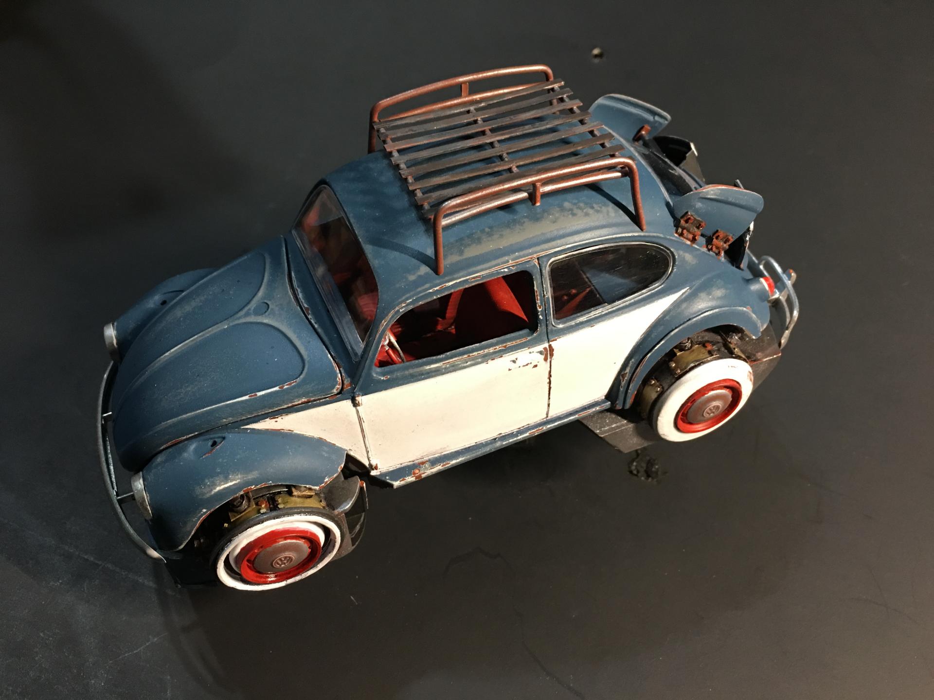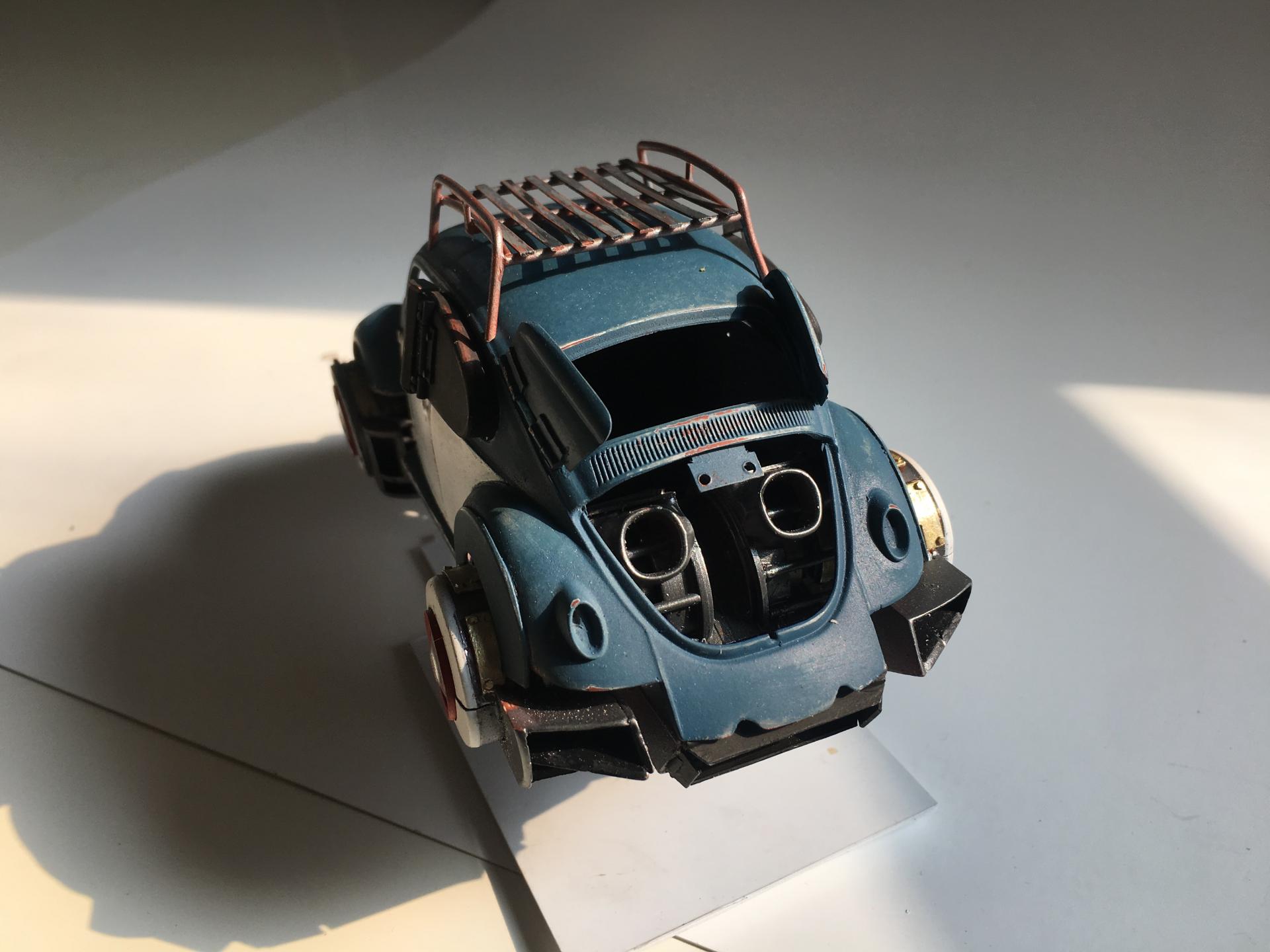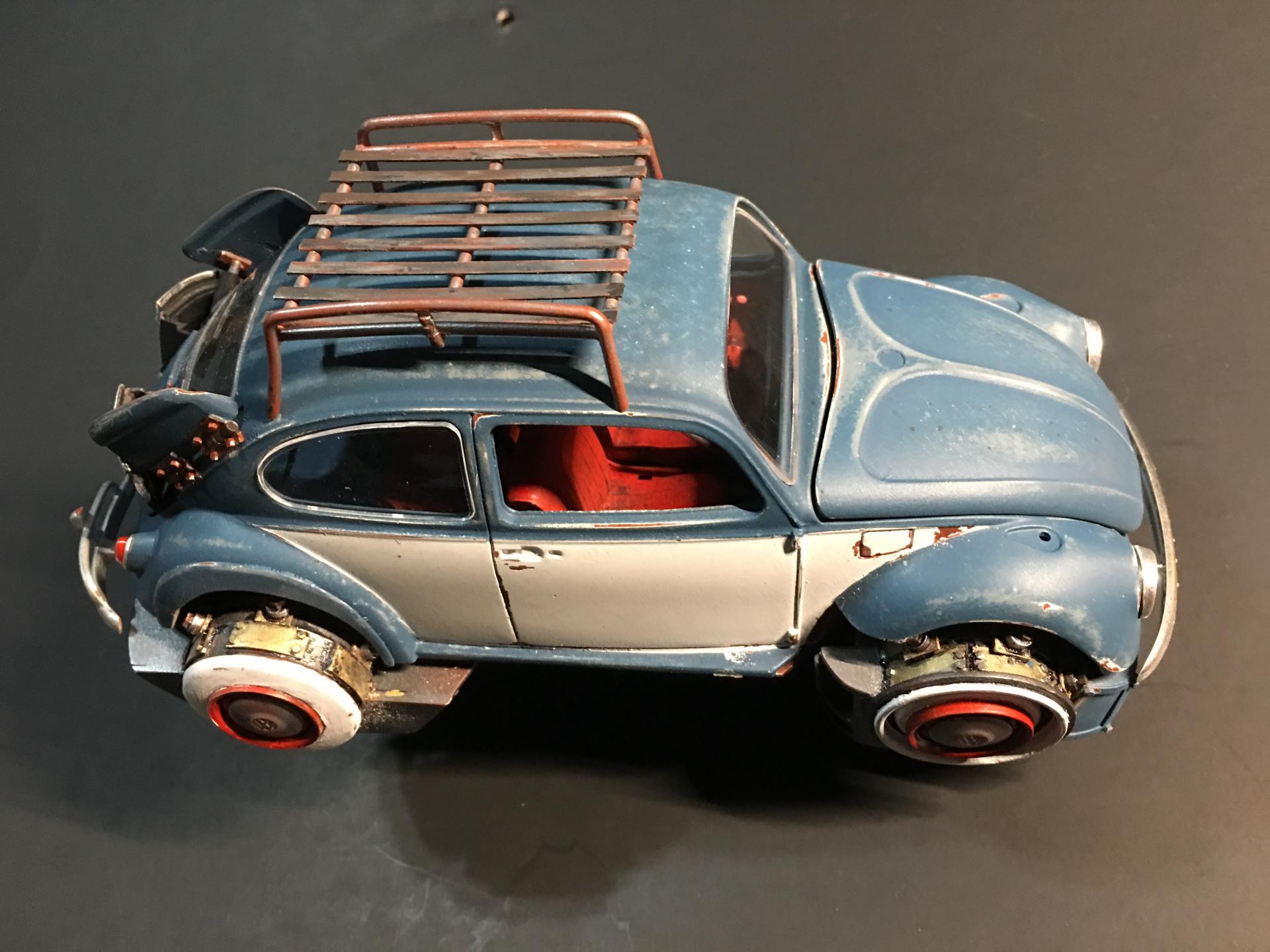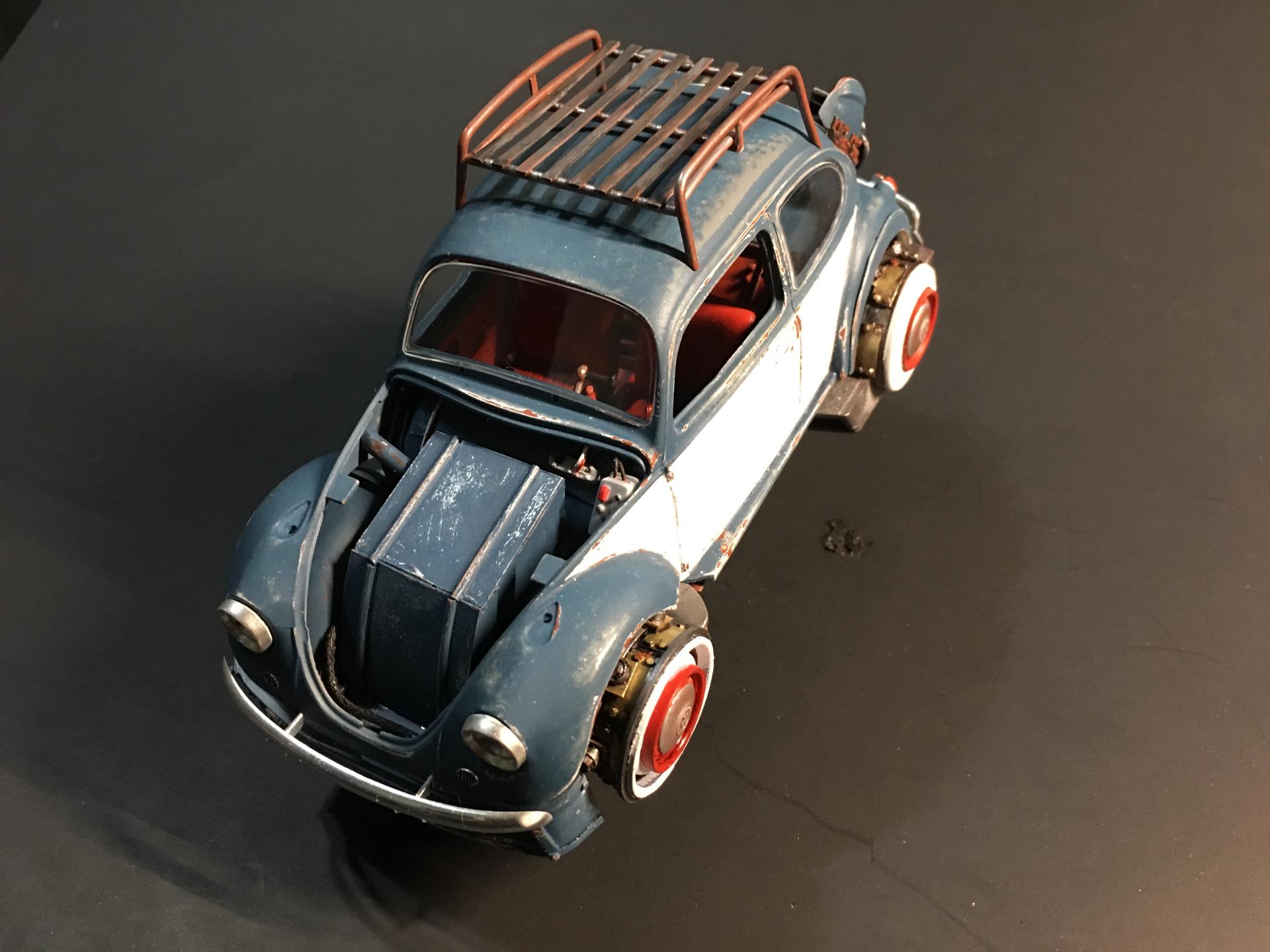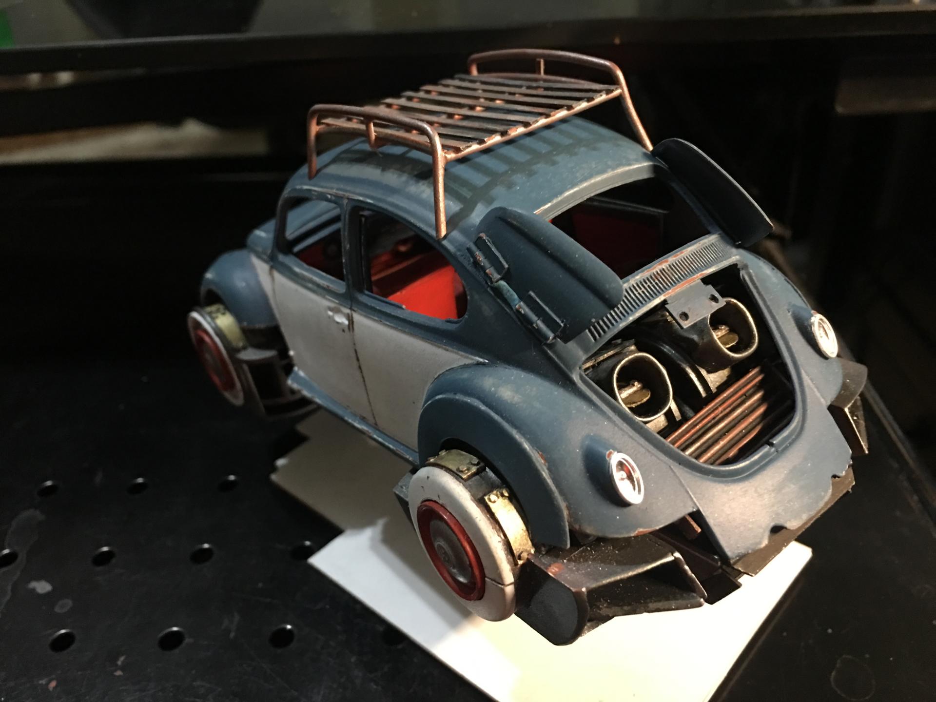Here's my next hover vehicle. It's a 1968 vintage VW Beetle with some Diesel Punk flair. I had planned to make a jet board (instead of a surf board) to go on the roof rack. This proved to be difficult, only because I can't seem to come up with a jet board that will match the ascetic of the car. For now it's just a cool roof rack that turned out 100% better than I had imagined! I just finished this model about an hour ago. I quickly took some photos using a homemade cardboard light box. Got the photos on the computer and realized that I weathered everything on the model, except for the antennae and the frame of the license plate. These were the last two items that were scratch built today. In my excitement to finish, I forgot the weathering process.....I'll get some more photos up soon. Under the front hood is the fuel tank and some random loose wires. Under the engine cover........huge intakes. Very fun build. Thanks for looking!