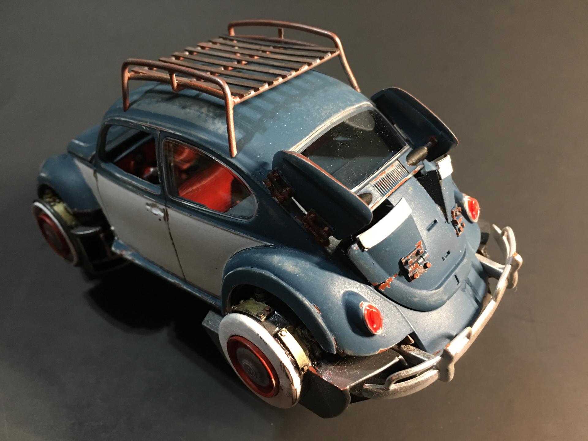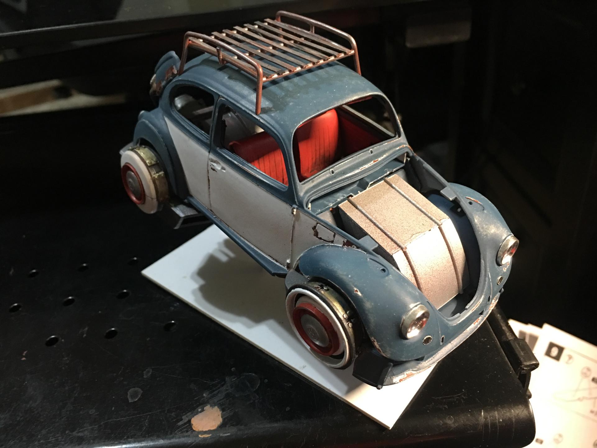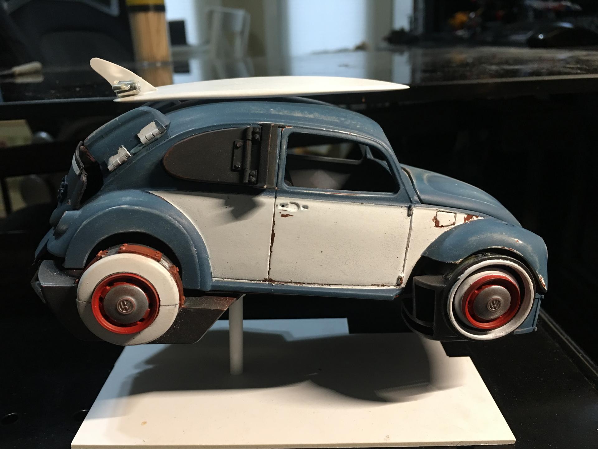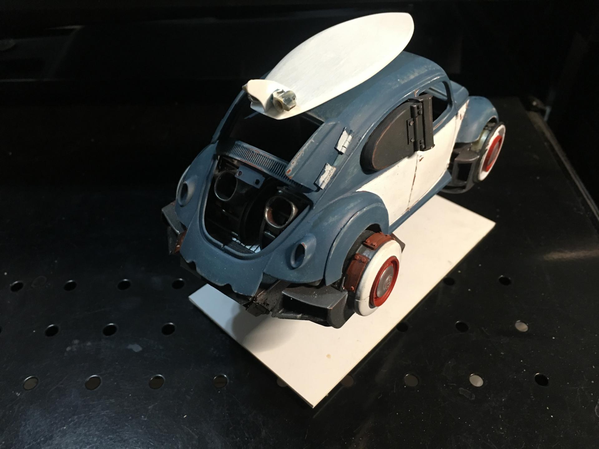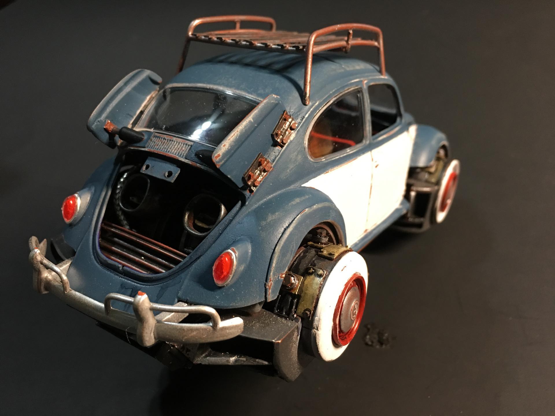 Here's my next hover vehicle. It's a 1968 vintage VW Beetle with some Diesel Punk flair. I had planned to make a jet board (instead of a surf board) to go on the roof rack. This proved to be difficult, only because I can't seem to come up with a jet board that will match the ascetic of the car. For now it's just a cool roof rack that turned out 100% better than I had imagined! I just finished this model about an hour ago. I quickly took some photos using a homemade cardboard light box. Got the photos on the computer and realized that I weathered everything on the model, except for the antennae and the frame of the license plate. These were the last two items that were scratch built today. In my excitement to finish, I forgot the weathering process.....I'll get some more photos up soon. Under the front hood is the fuel tank and some random loose wires. Under the engine cover........huge intakes. Very fun build. Thanks for looking!