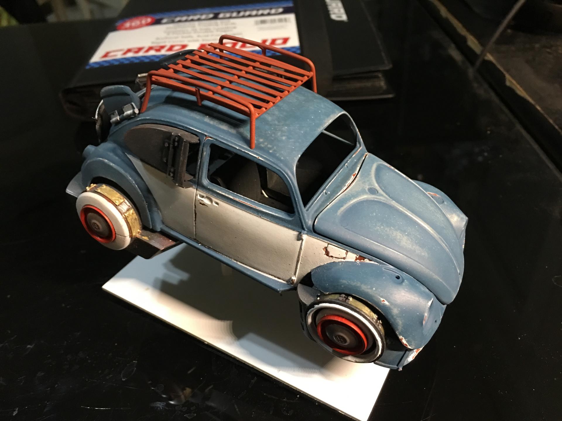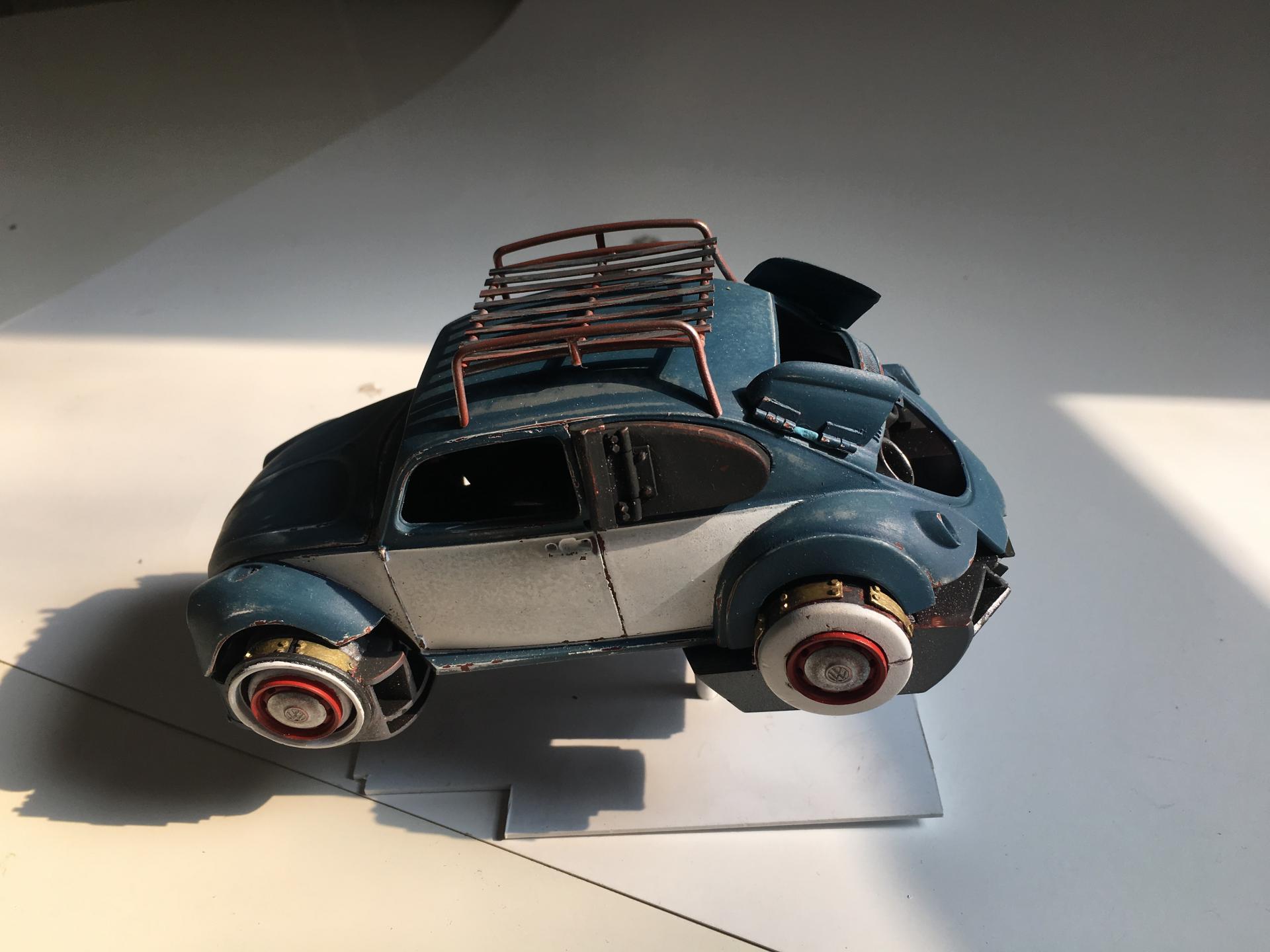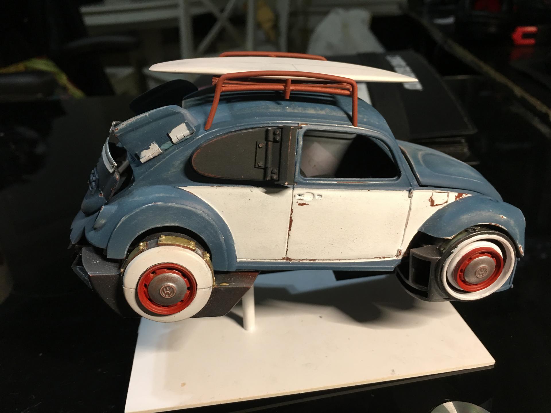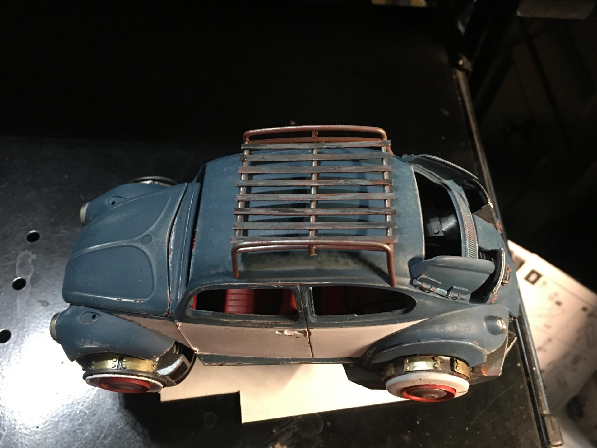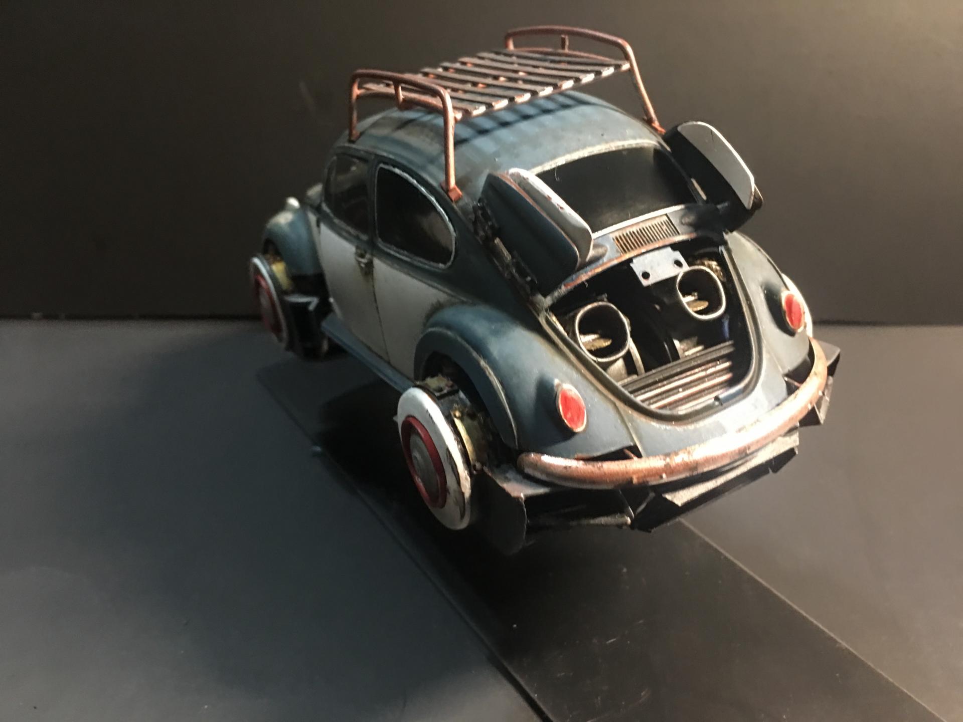 Here's my next hover vehicle. It's a 1968 vintage VW Beetle with some Diesel Punk flair. I had planned to make a jet board (instead of a surf board) to go on the roof rack. This proved to be difficult, only because I can't seem to come up with a jet board that will match the ascetic of the car. For now it's just a cool roof rack that turned out 100% better than I had imagined! I just finished this model about an hour ago. I quickly took some photos using a homemade cardboard light box. Got the photos on the computer and realized that I weathered everything on the model, except for the antennae and the frame of the license plate. These were the last two items that were scratch built today. In my excitement to finish, I forgot the weathering process.....I'll get some more photos up soon. Under the front hood is the fuel tank and some random loose wires. Under the engine cover........huge intakes. Very fun build. Thanks for looking!