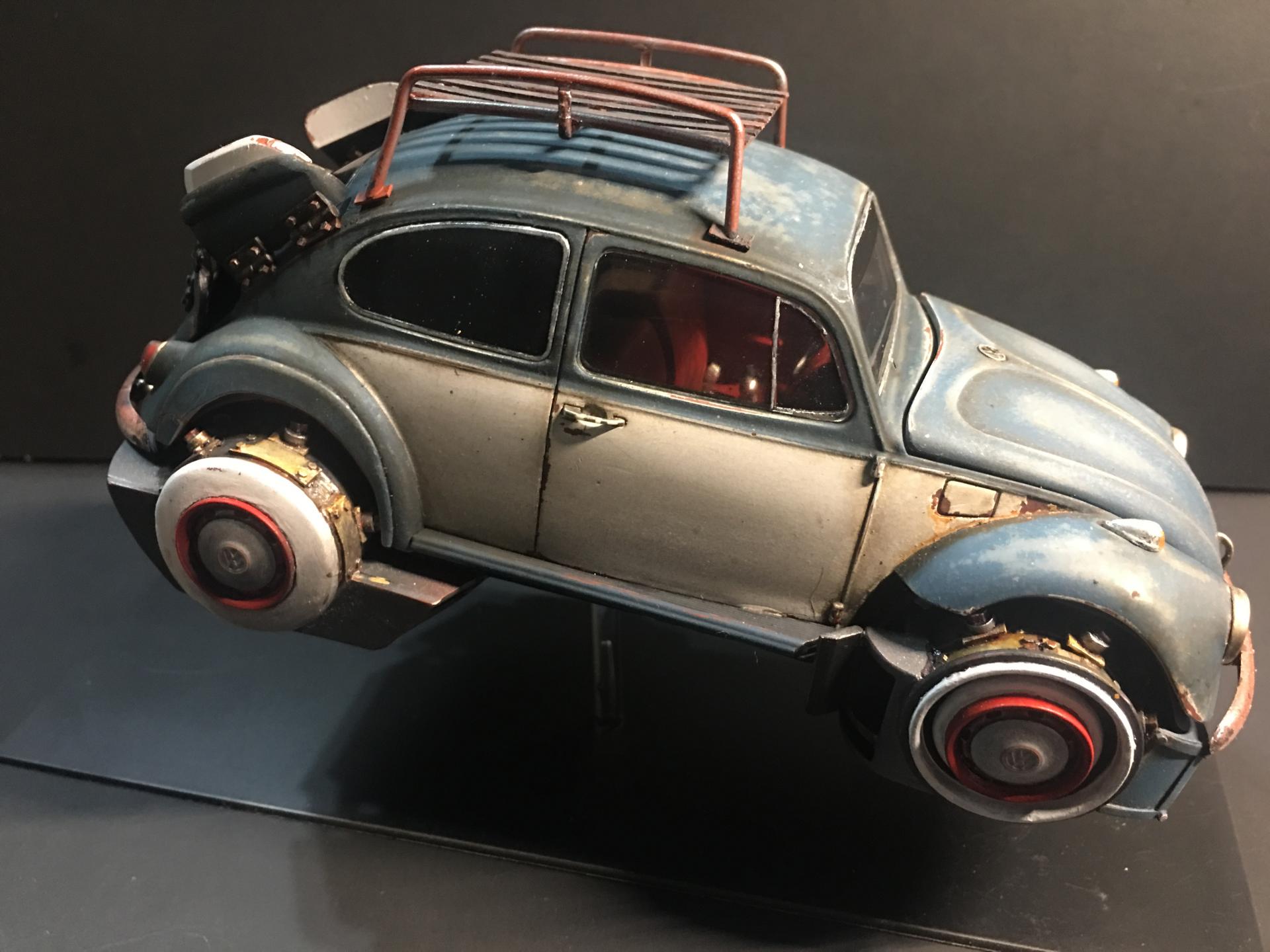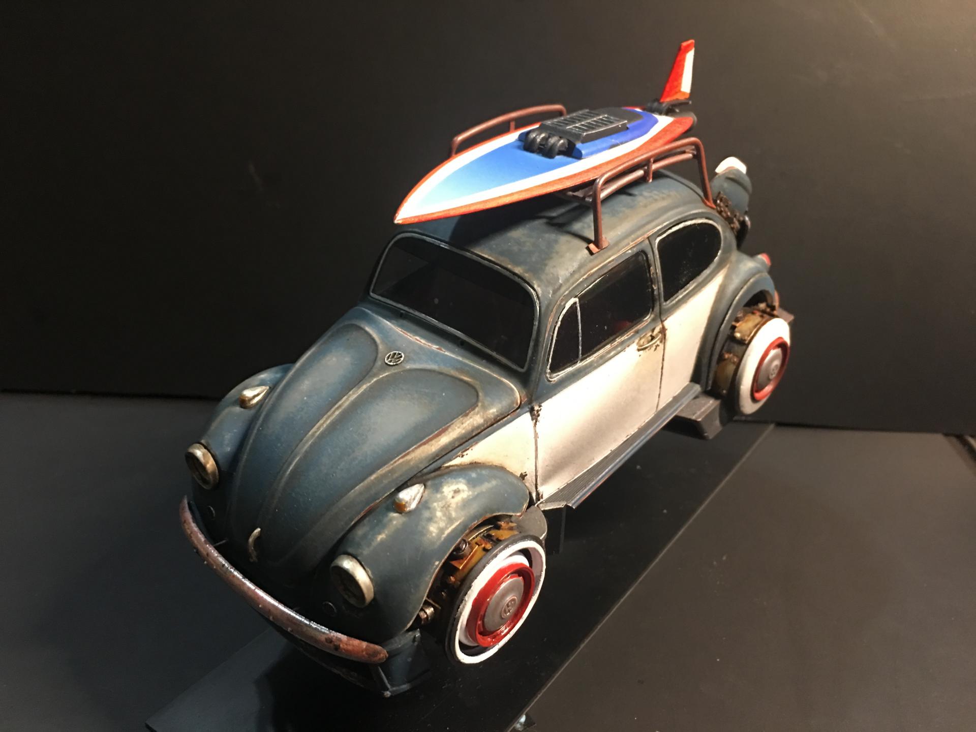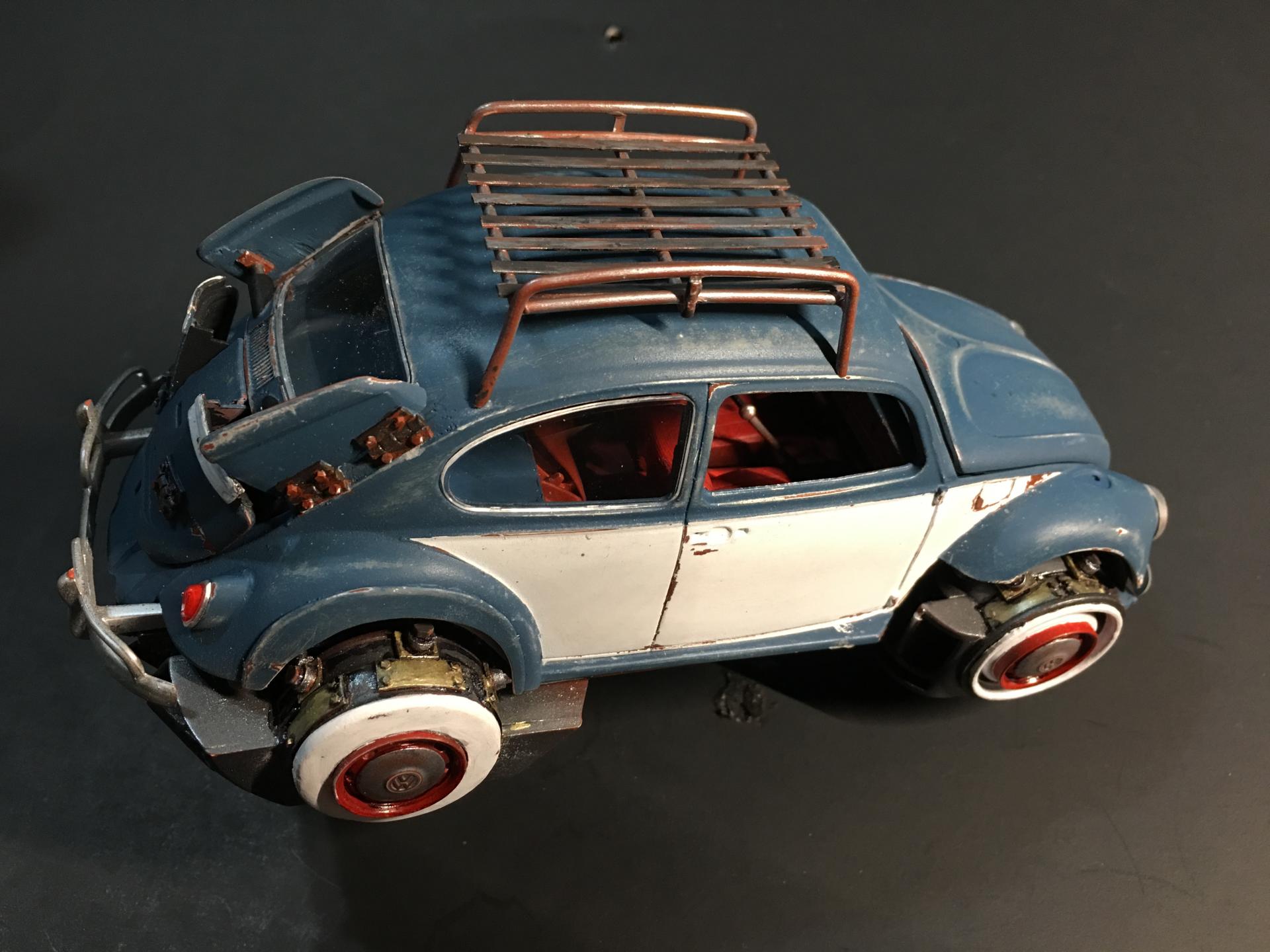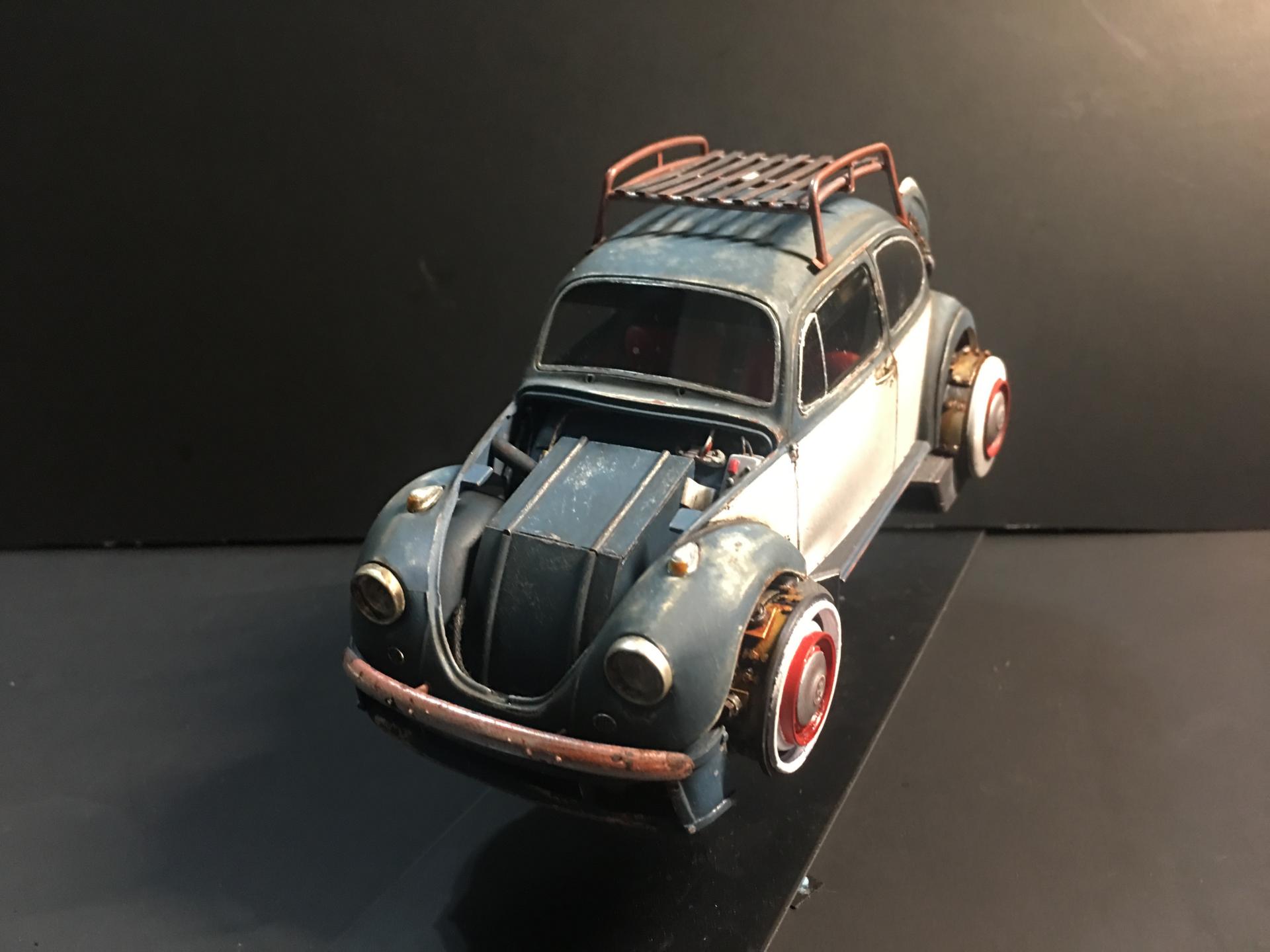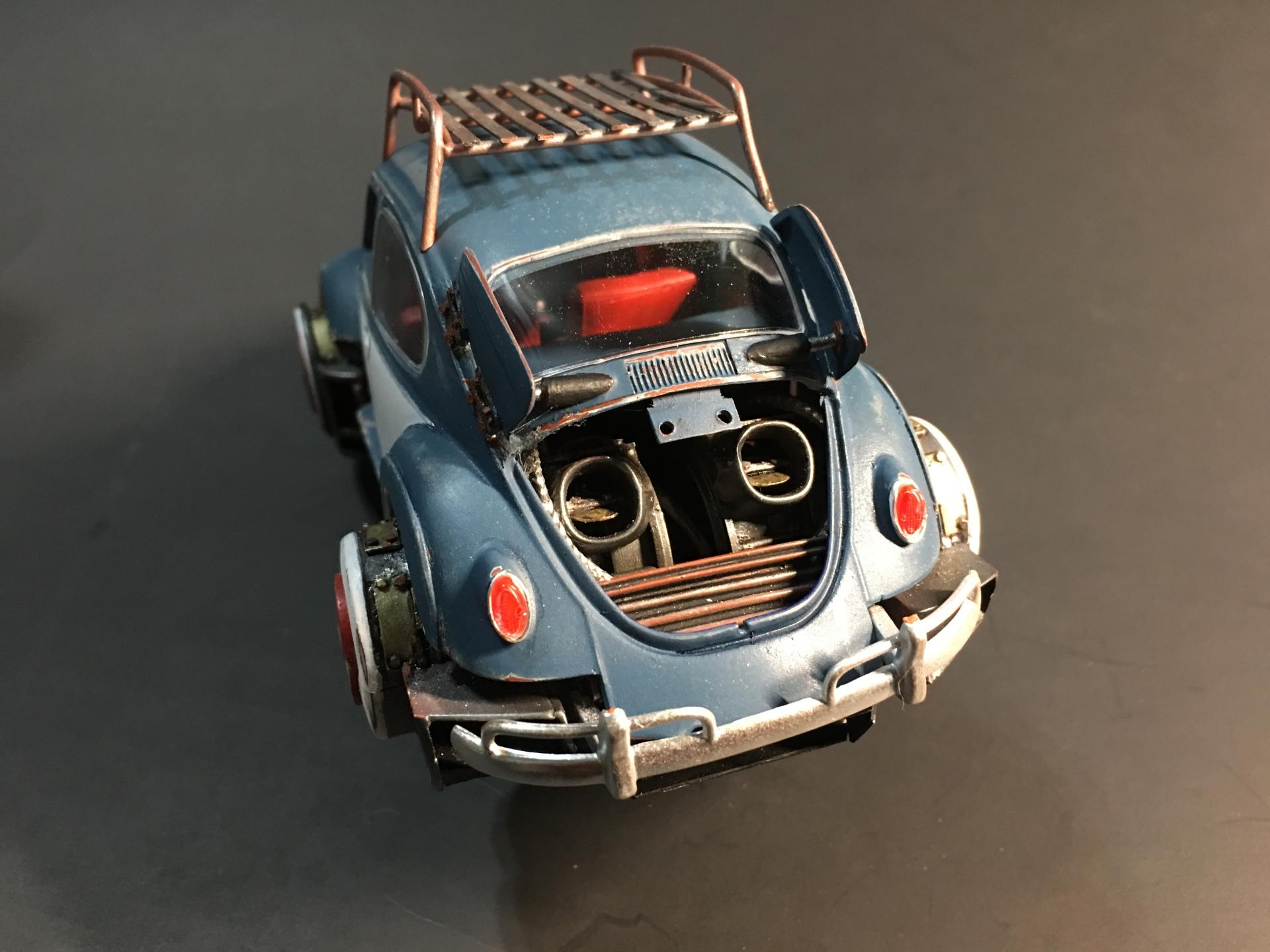 Here's my next hover vehicle. It's a 1968 vintage VW Beetle with some Diesel Punk flair. I had planned to make a jet board (instead of a surf board) to go on the roof rack. This proved to be difficult, only because I can't seem to come up with a jet board that will match the ascetic of the car. For now it's just a cool roof rack that turned out 100% better than I had imagined! I just finished this model about an hour ago. I quickly took some photos using a homemade cardboard light box. Got the photos on the computer and realized that I weathered everything on the model, except for the antennae and the frame of the license plate. These were the last two items that were scratch built today. In my excitement to finish, I forgot the weathering process.....I'll get some more photos up soon. Under the front hood is the fuel tank and some random loose wires. Under the engine cover........huge intakes. Very fun build. Thanks for looking!