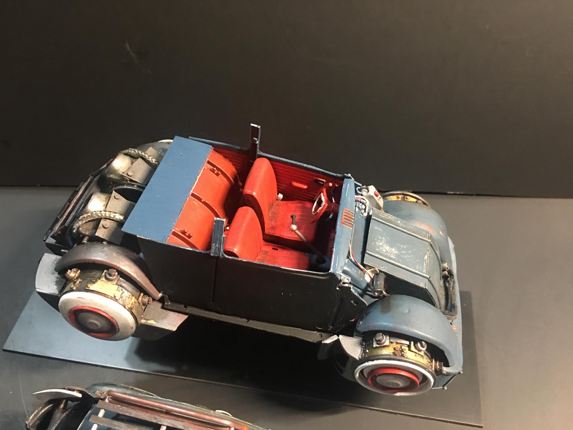 Almost done. That means I'll probably be another month before it's finished. I took another look at the wheel arch as Robert mentioned. I carved away some of the fender flare and added some mechanical pieces to give the underside of the fenders more detail. It looks much better. Thanks for the suggestion. Added a large fuel container under the hood with some wires and hoses. I need to clean up the seam on the gas tank. In these photos, many of the parts are still not glued on. I hope to add black and chrome to the window trim. I need to make mounts for the roof rack. Lots of touch up painting and some slight weathering. I would like it to have road grime and grease. Some streaks of rust, but not too much. I may paint the small detailed edge of the fins white. Been thinking about it since I first started fitting them to the car. I was hesitant to paint the interior red. I do not like red interiors on cars at all. Plus the car being blue, I just didn't think it would look good. My wife and kids talked me into it and I'm shocked at how well the red interior goes with the look of the car. I plan to add some window stickers and a medium tint to the rear 3 windows. Thanks for looking!!!