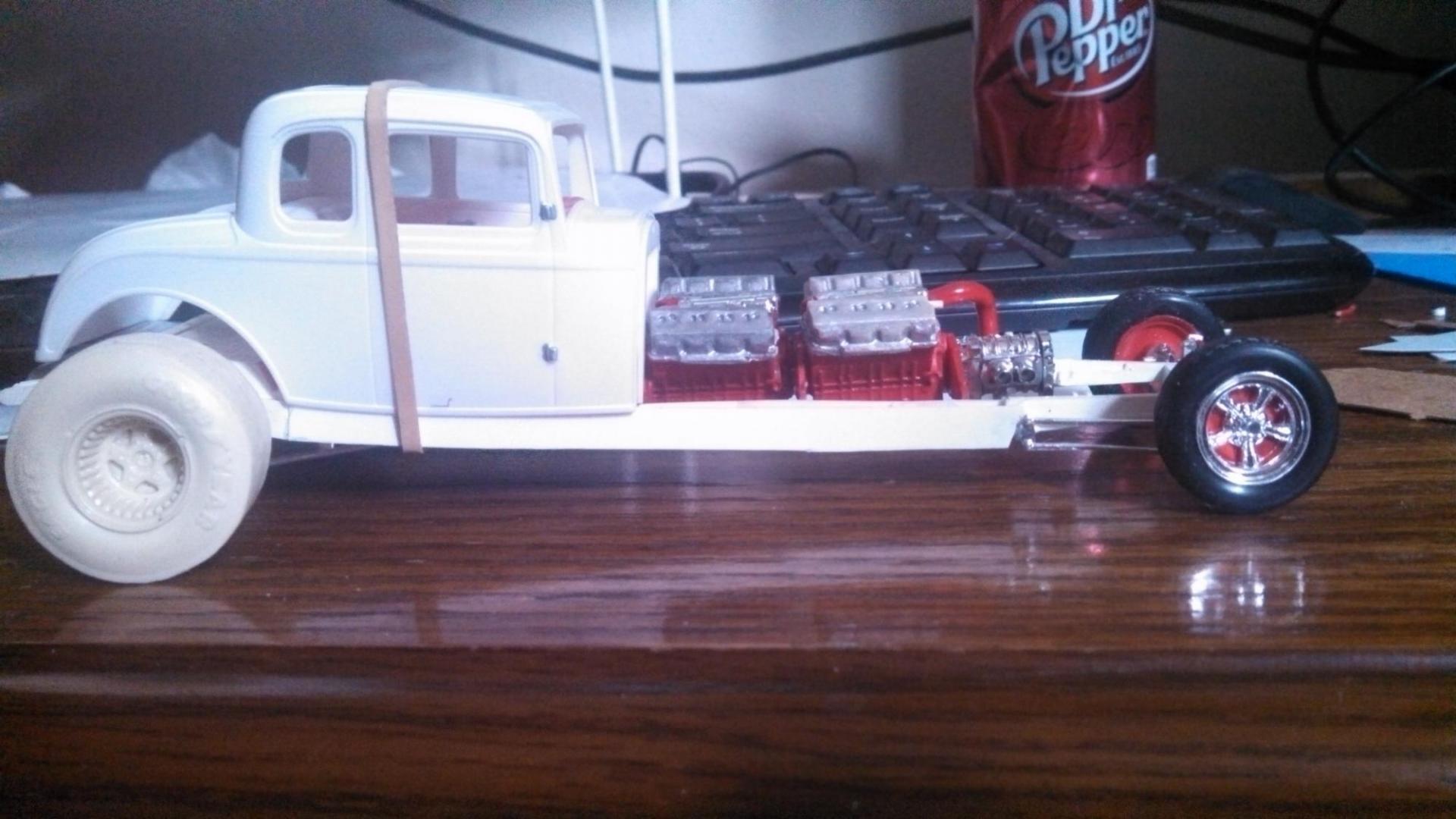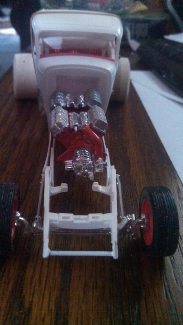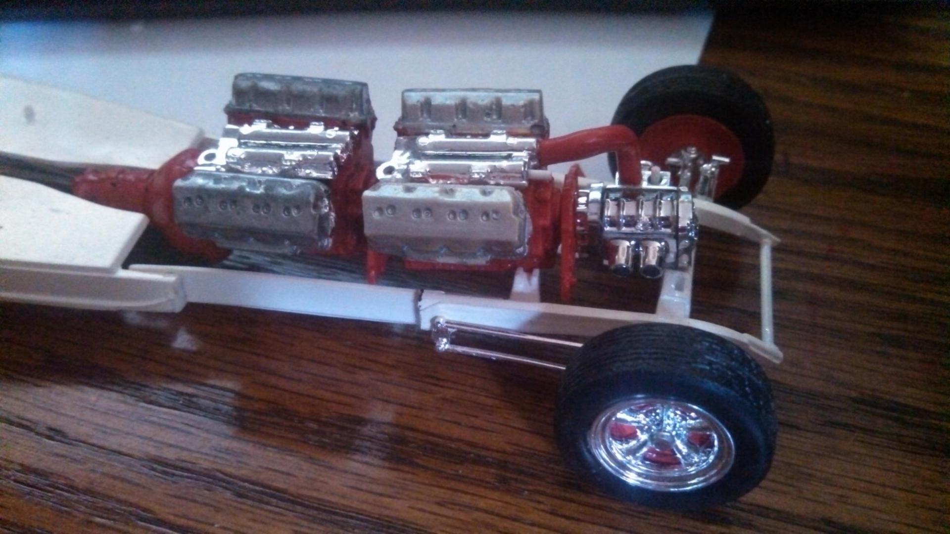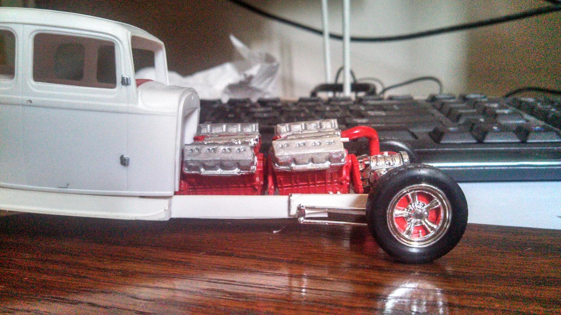 Over the years I have done model cars builds so good some not so good.Some I have sold but mostly have kept. For a while I got out of the hobby because life just got to hectic and my cars reflected it. So I but away everything into storage and went on. A year ago we moved and while packing and unpacking I came across " my supplies " and thought maybe it was time to return to it but this time around I wanted to push myself to see just what I could actually do beyond just building the typical model out of the box. Which is a good thing, as I was going through the boxes and boxes of model stuff I noticed I didn't pack everything or packed it well. Some pieces were broken, missing or i had no clue where they came from. So here it is The Anomaly 32 Ford project. Here is where I left off at. As I said before, I really want to push my self on this build. Since part of it is already done I don't really want to redo what I have done. In my mind I have big dreams for this car but we will see if I can get it done the way I am envisioning it. First I want to put bigger wheels so I found an old pair that I casted in resin. Not sure if I want to go that wide so these for now will just be mock ups. To make this a one of a kind........and well because I don't have all the parts I have enlisted the help from this kit. My plan is to use the motors from this kit ( once again because I am missing the bodies ) to build a fuel injected tandem motor. But with doing so I will have to cut the frame and make it longer so the new motors will fit.