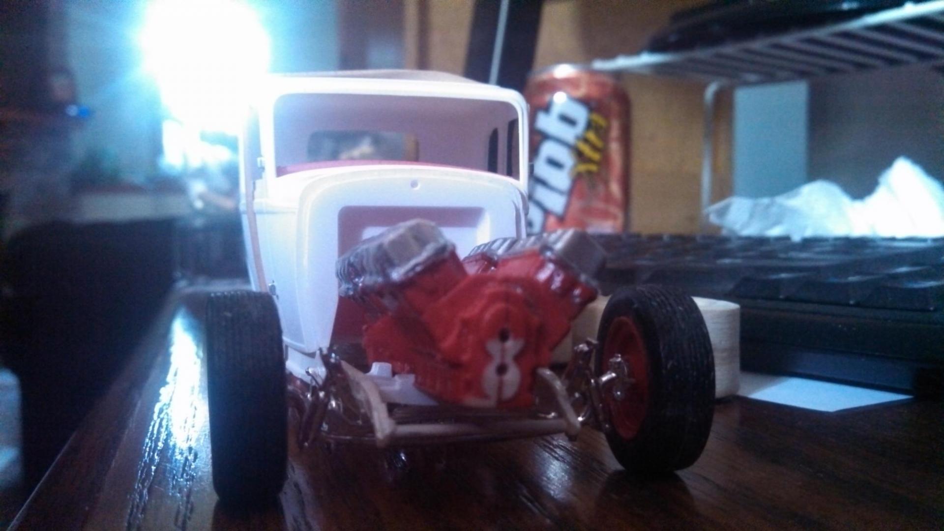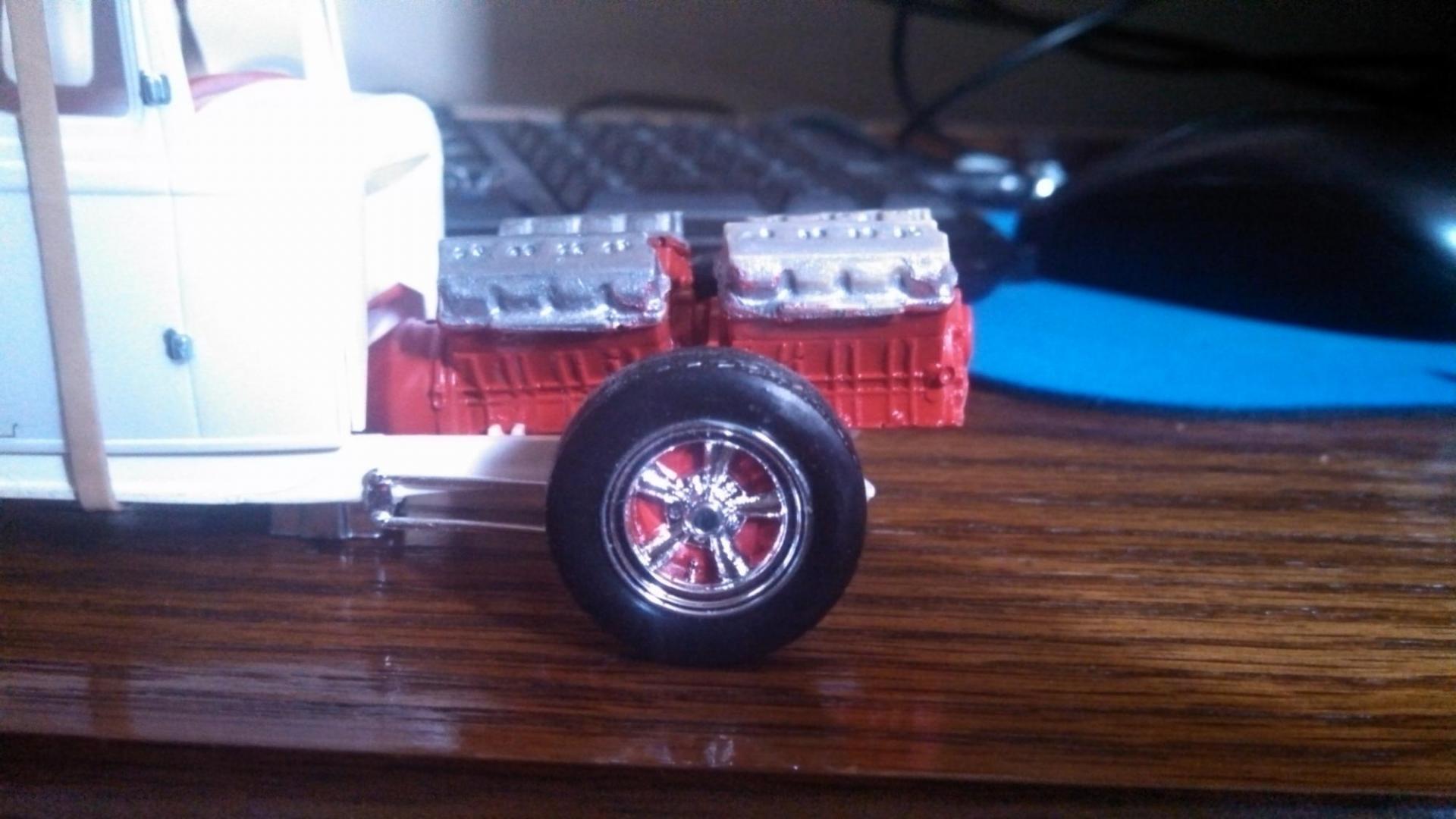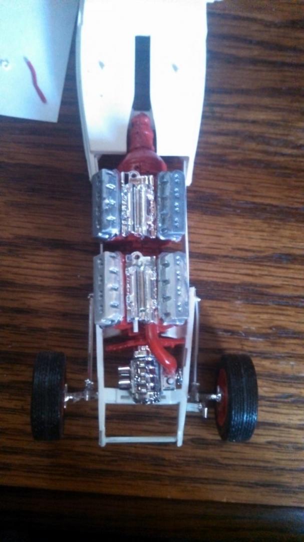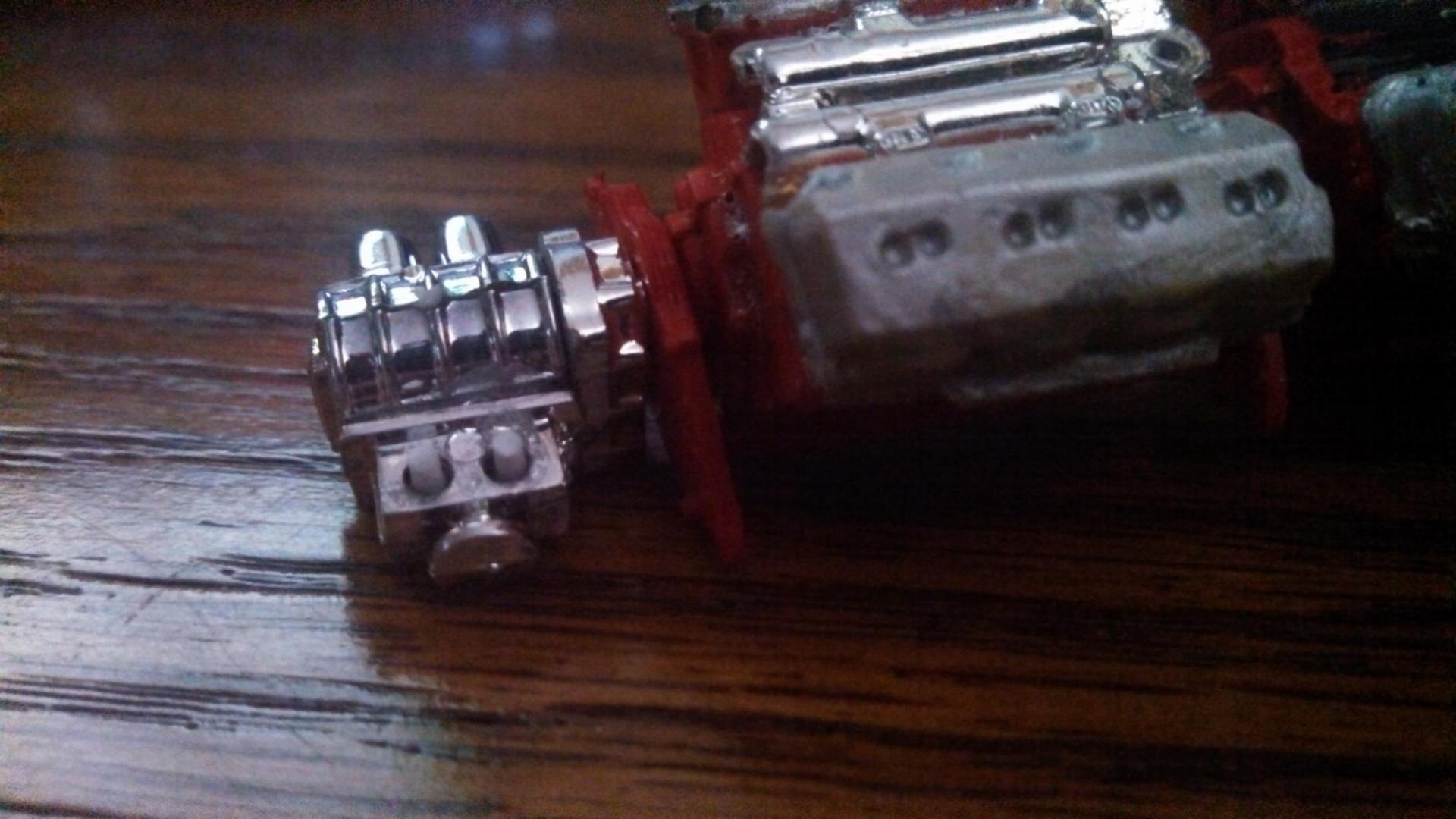 Over the years I have done model cars builds so good some not so good.Some I have sold but mostly have kept. For a while I got out of the hobby because life just got to hectic and my cars reflected it. So I but away everything into storage and went on. A year ago we moved and while packing and unpacking I came across " my supplies " and thought maybe it was time to return to it but this time around I wanted to push myself to see just what I could actually do beyond just building the typical model out of the box. Which is a good thing, as I was going through the boxes and boxes of model stuff I noticed I didn't pack everything or packed it well. Some pieces were broken, missing or i had no clue where they came from. So here it is The Anomaly 32 Ford project. Here is where I left off at. As I said before, I really want to push my self on this build. Since part of it is already done I don't really want to redo what I have done. In my mind I have big dreams for this car but we will see if I can get it done the way I am envisioning it. First I want to put bigger wheels so I found an old pair that I casted in resin. Not sure if I want to go that wide so these for now will just be mock ups. To make this a one of a kind........and well because I don't have all the parts I have enlisted the help from this kit. My plan is to use the motors from this kit ( once again because I am missing the bodies ) to build a fuel injected tandem motor. But with doing so I will have to cut the frame and make it longer so the new motors will fit.