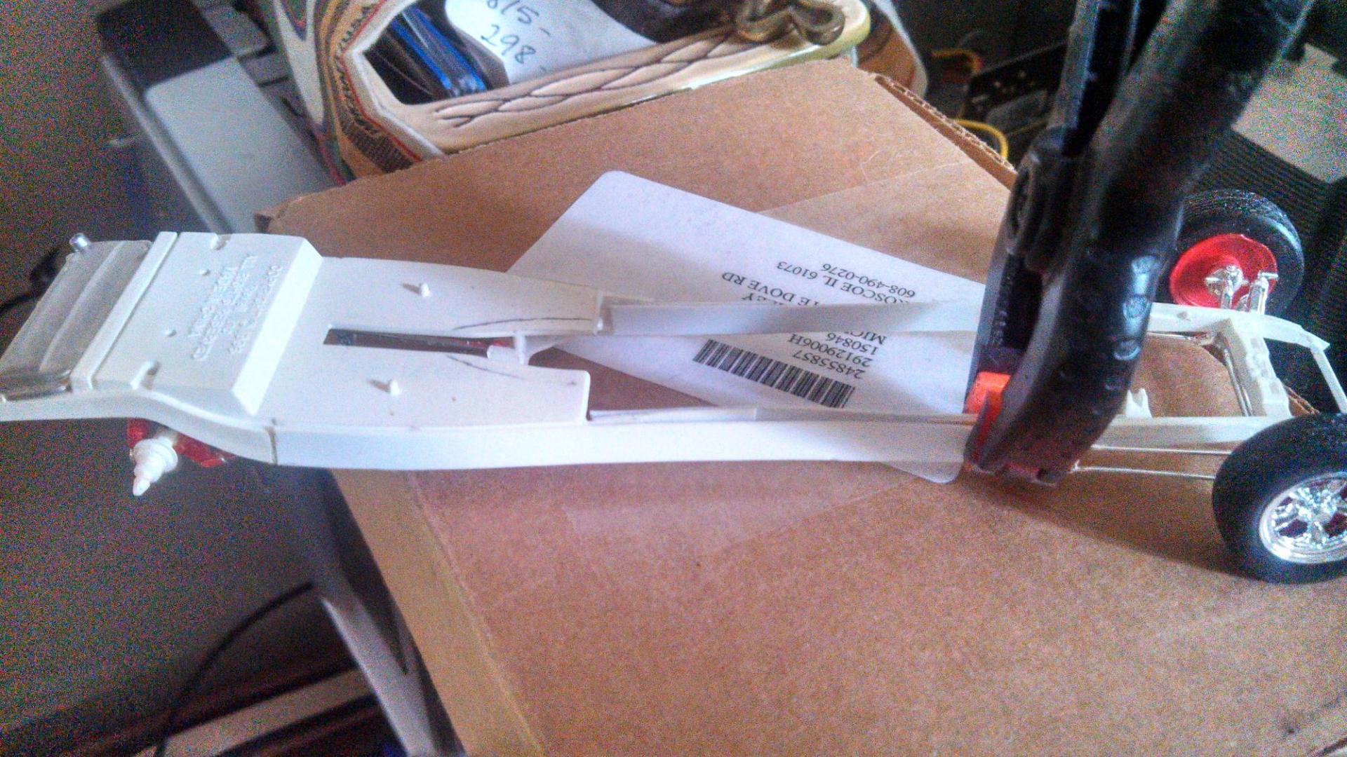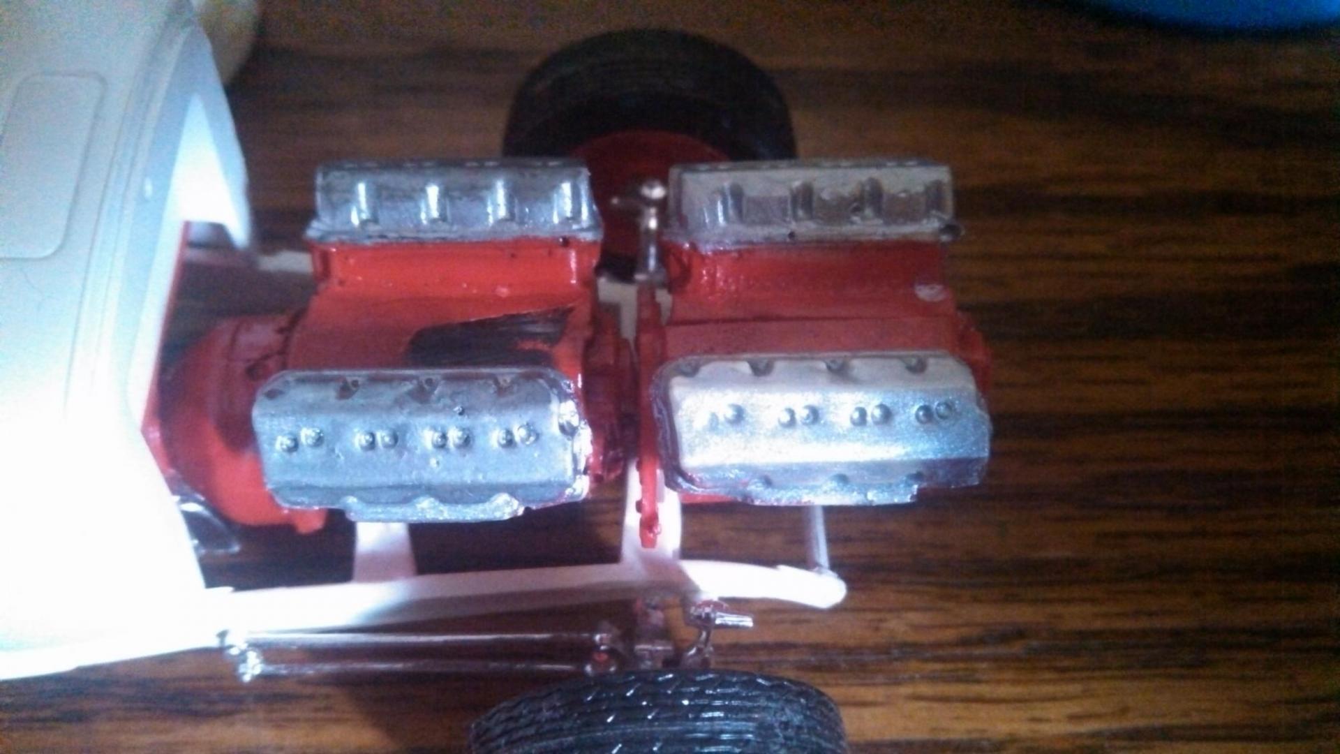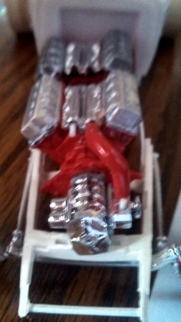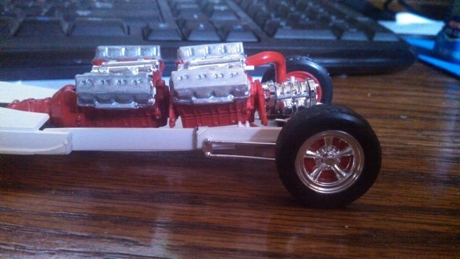 small update to the build.I started mocking up the motor to see how much longer the frame has to be to support duel motors. well I don't think it will fit ! I am going to have to cut the frame and stretch it. Once I do that I am sure I will have to build new motor supports. I was thinking of cutting it here since the front suspension is already intact. I am sure I will have to do some modifications to the front once I get the motor in. After looking at it and noticing that the front of the motor still needs to be built I wasn't sure exactly how long to extend the front end so I figured I should get the rest of the motor, at least the front half built before doing any more to the frame. Once I started building the front part of the motor I was glad I waited to work on the frame rails as the motor is getting longer as I work on it. Since I am piecing this build together I am using a Hemi block and heads from a mold I made a few years ago and the fuel injection system from the Double Dragster kit now the hoses are to short. The Hemi block must be longer than the block in the dragster kit. So I will have to scratch build new hoses with styrene. I went ahead and put small pieces in the hole to support the new hoses I will make. This will give them some support and some where for the new hoses to slide over so I can attach them. I am going to let them dry in place for a day or so to make sure they are secure before making the hoses. With using the different blocks I also had to file down the fuel injector manifold. It was to wide to slide in between the valve covers. My plan is going to be to connect the 2 fuel injector manifolds together with a scratch built hose kinda like the front motor will have. I have a busy weekend coming up but it is suppose to be really hot so I am not sure how much I will get done. Check back and see what happens next, as always comments, tips and ideas are welcome. Have a good weekend ! -