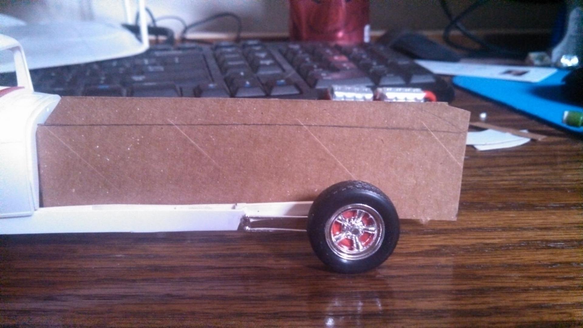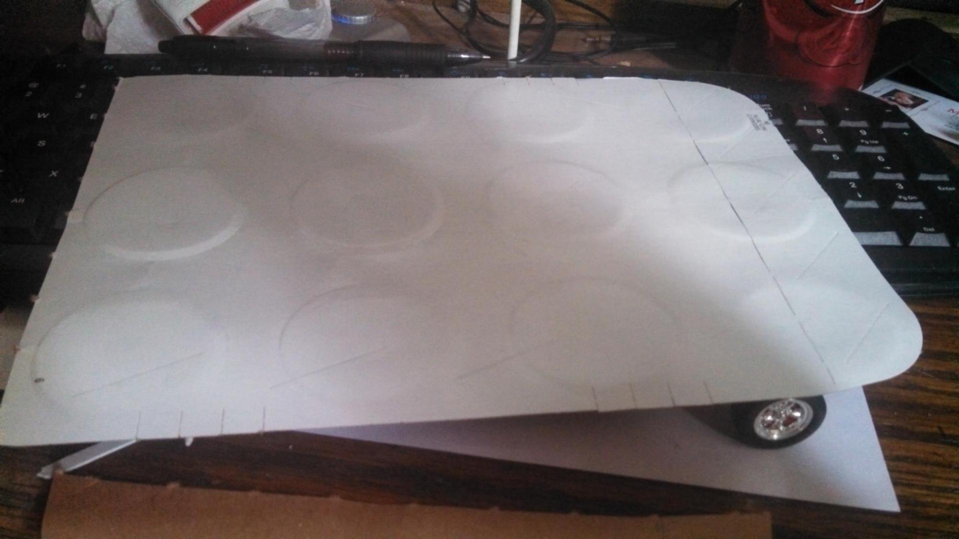 Small update. Got the motors to fit once I stretched the frame just a little more. Now to work on the custom body I have been kicking around for some time. Instead of hacking up a bunch of styrene to get the shapes and curves I want I decided to do some mocking up with these cardboard inserts that you get in cases of pop. I cut one piece to start with. and then cut it close to the size I think I will need. This way I can cut and curve them the way I think it want them. Then trace them onto the styrene and glue them together. This way I will have a template for the other side. Check back as I start forming the body.......gotta feeling I may need a lot filler to blend it all in. And of course comments, suggestions and ideas are always welcome. -