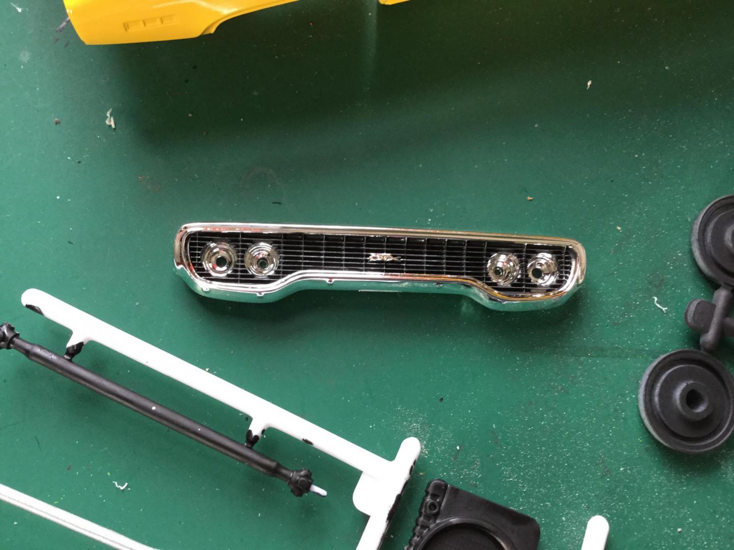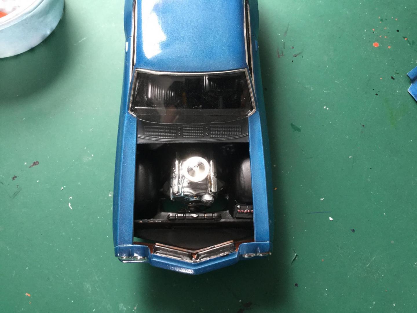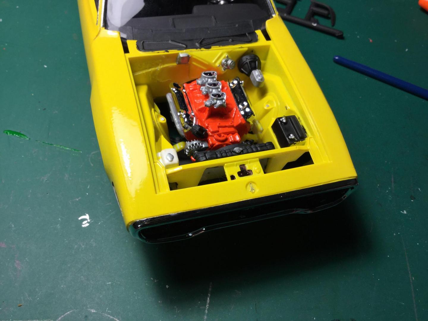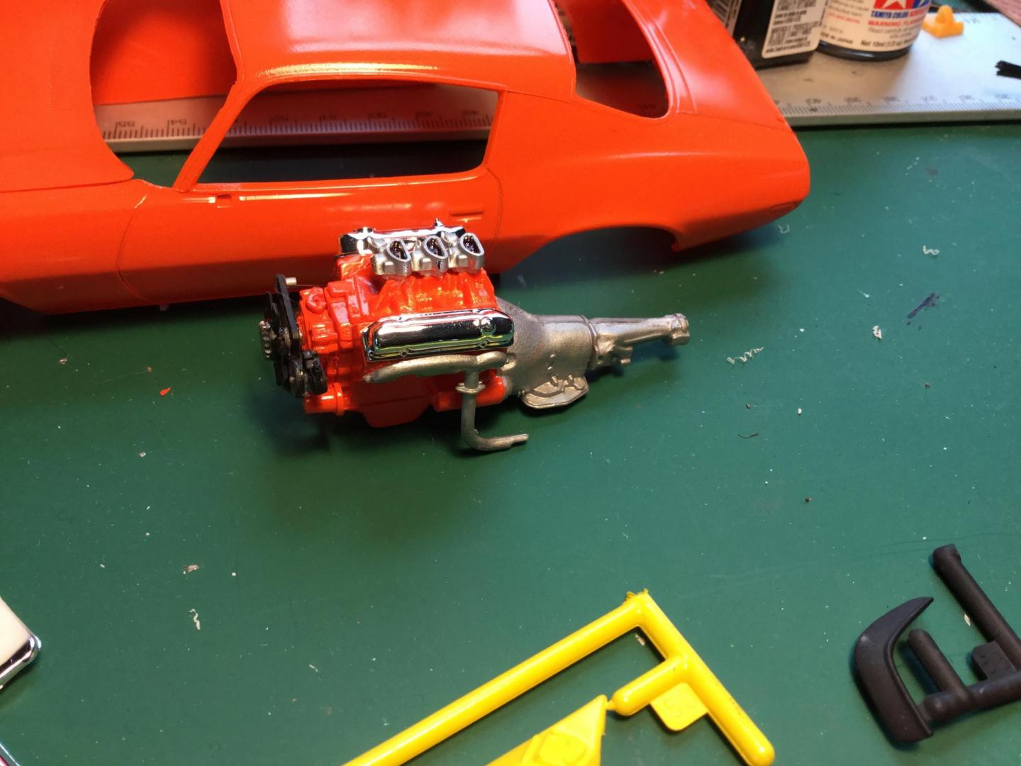 Well I took a 2 month vacation from this build, but I'm back at it and the goat is almost done thanks for all the compliments, Charlie that is a great idea, maybe someday I'll attempt a bash like that but my skills aren't there just yet, Raoul, the bumper situation is puzzling, I'd like to build one of the '88 issued 70 goats, it's nice to know it doesn't have this problem but yes that is weird alright so I got the front wheel spindles moved on the '72, so the front wheels are now in their correct locations, I moved the rear wheels but they're still too far back, I need to drill holes way farther forward under the hood, the motor is installed and complete, no fancy detailing here, I figured it would be a waste on this kit next up: cut up the back bumper, move the rear wheels, foil the door handles and done!